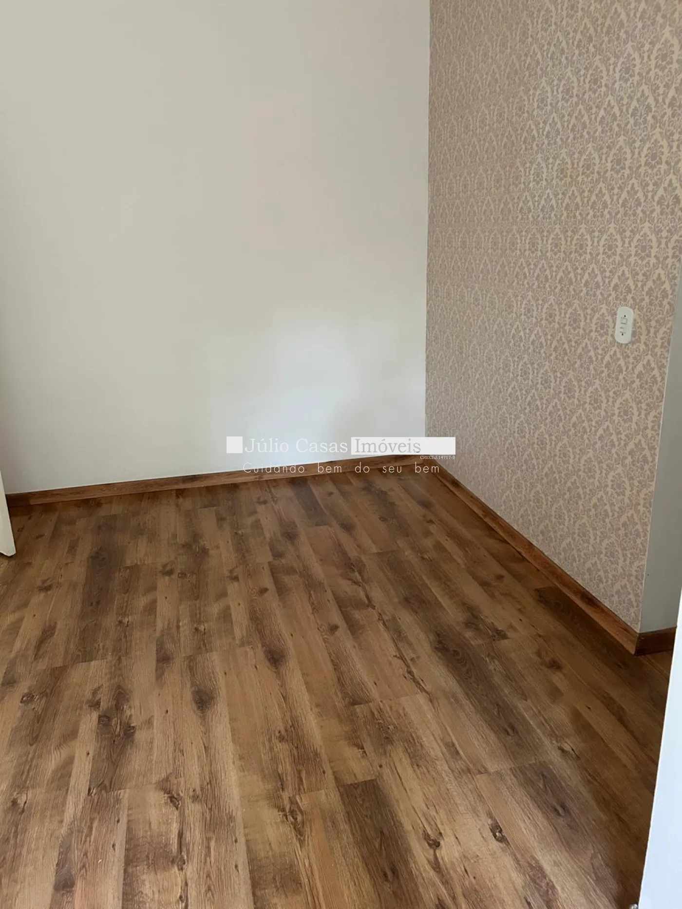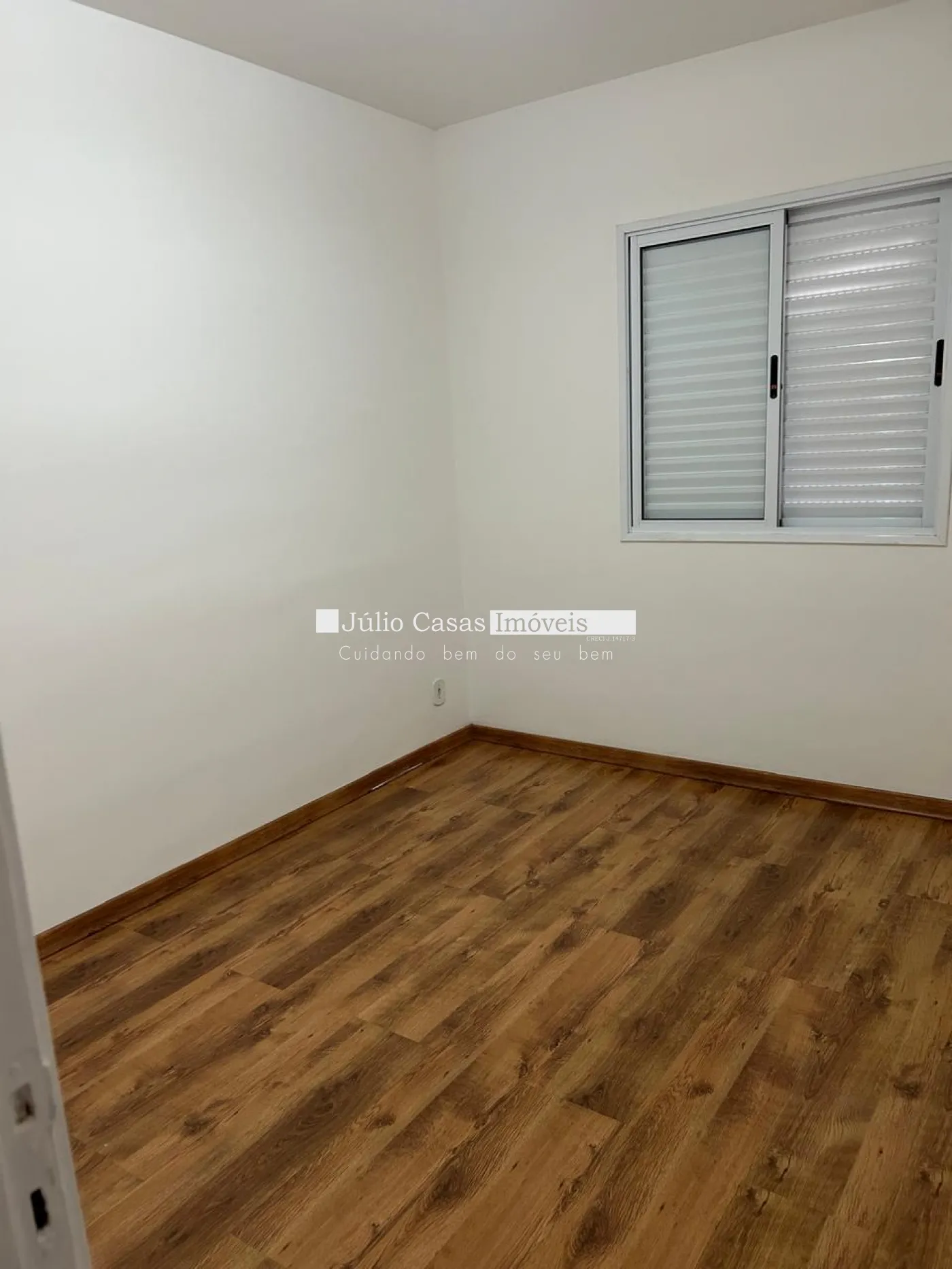 Quartos em piso madeira, cozinha com pia, gabinete e armários com azulejo até o teto, banheiro com box em vidro e gabinete, azulejado até o teto.