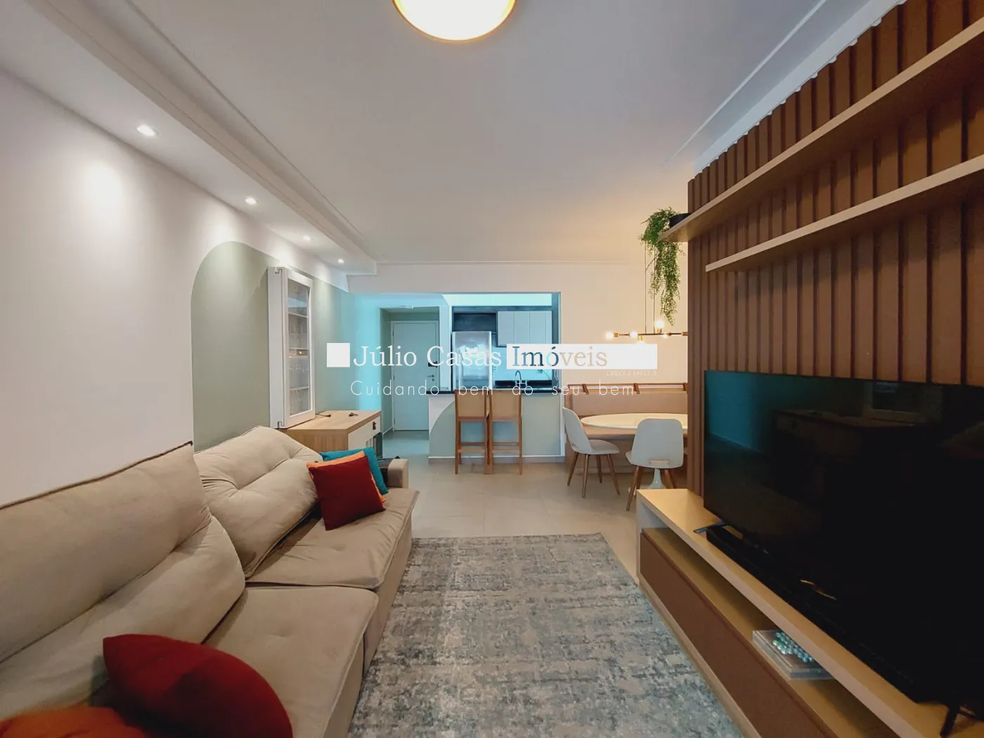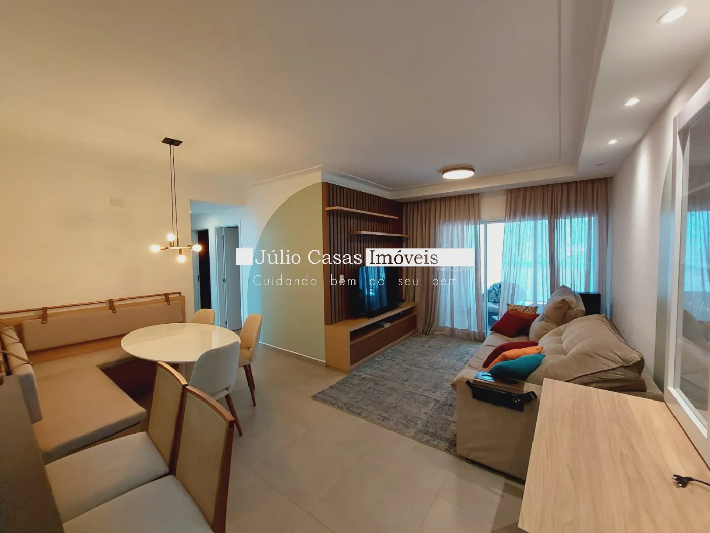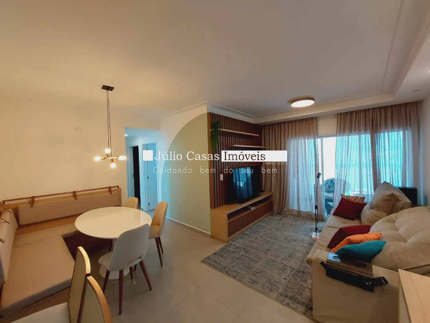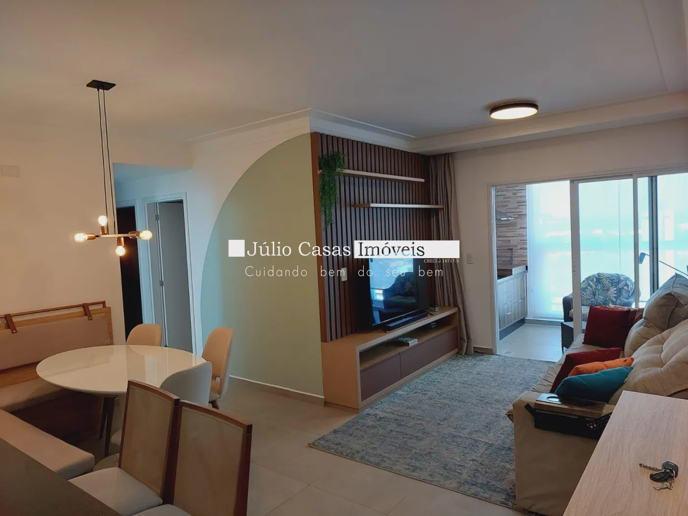 Sala 2 ambientes com rack, tv, sala de jantar, adega e cristaleira varanda gourmet modulada com mesa e cadeiras confortáveis.