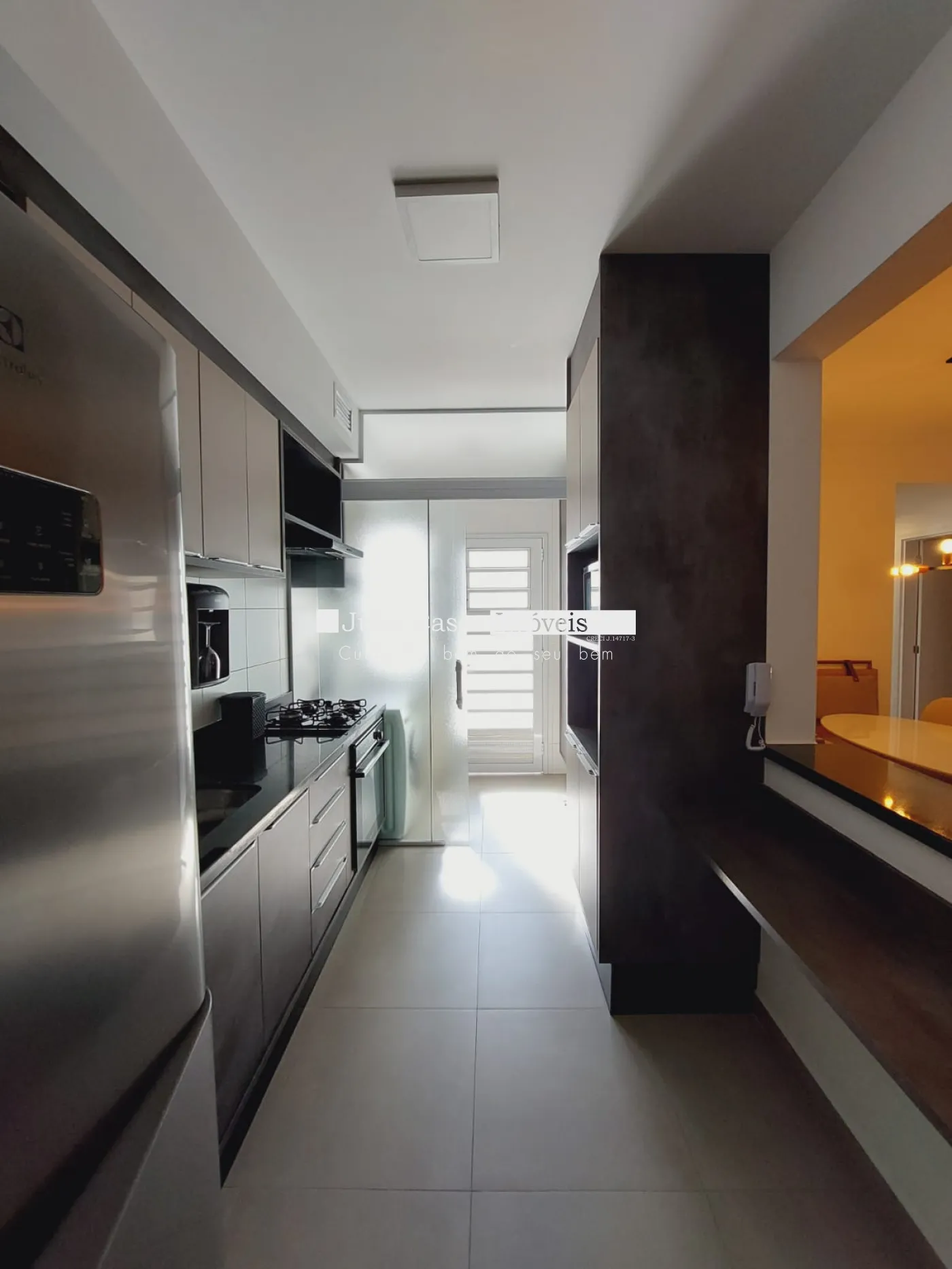 cozinha modulada e equipada com cooktop, geladeira, micro-ondas, forno elétrico e purificador de água, área de serviço com máquina lava e seca e varanda técnica.