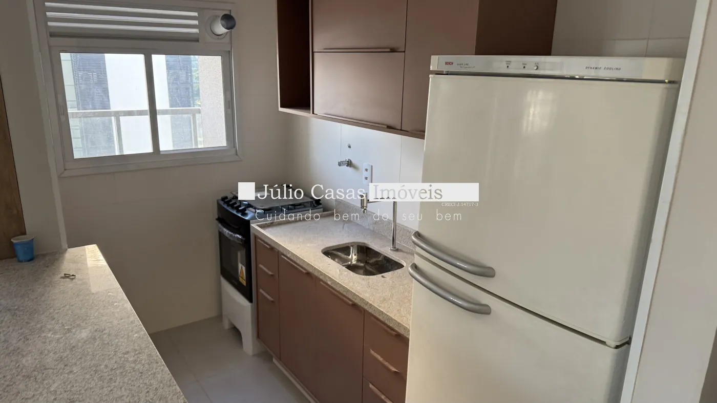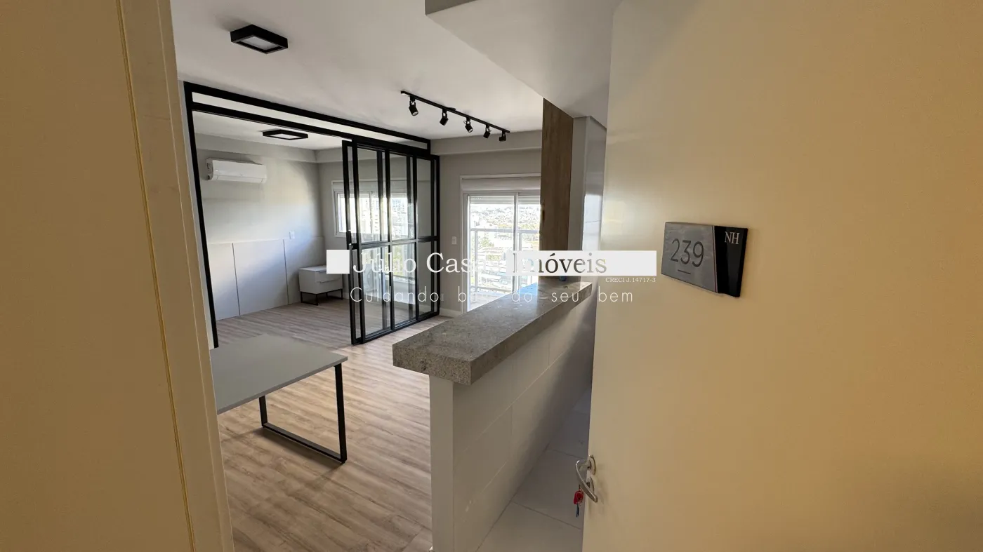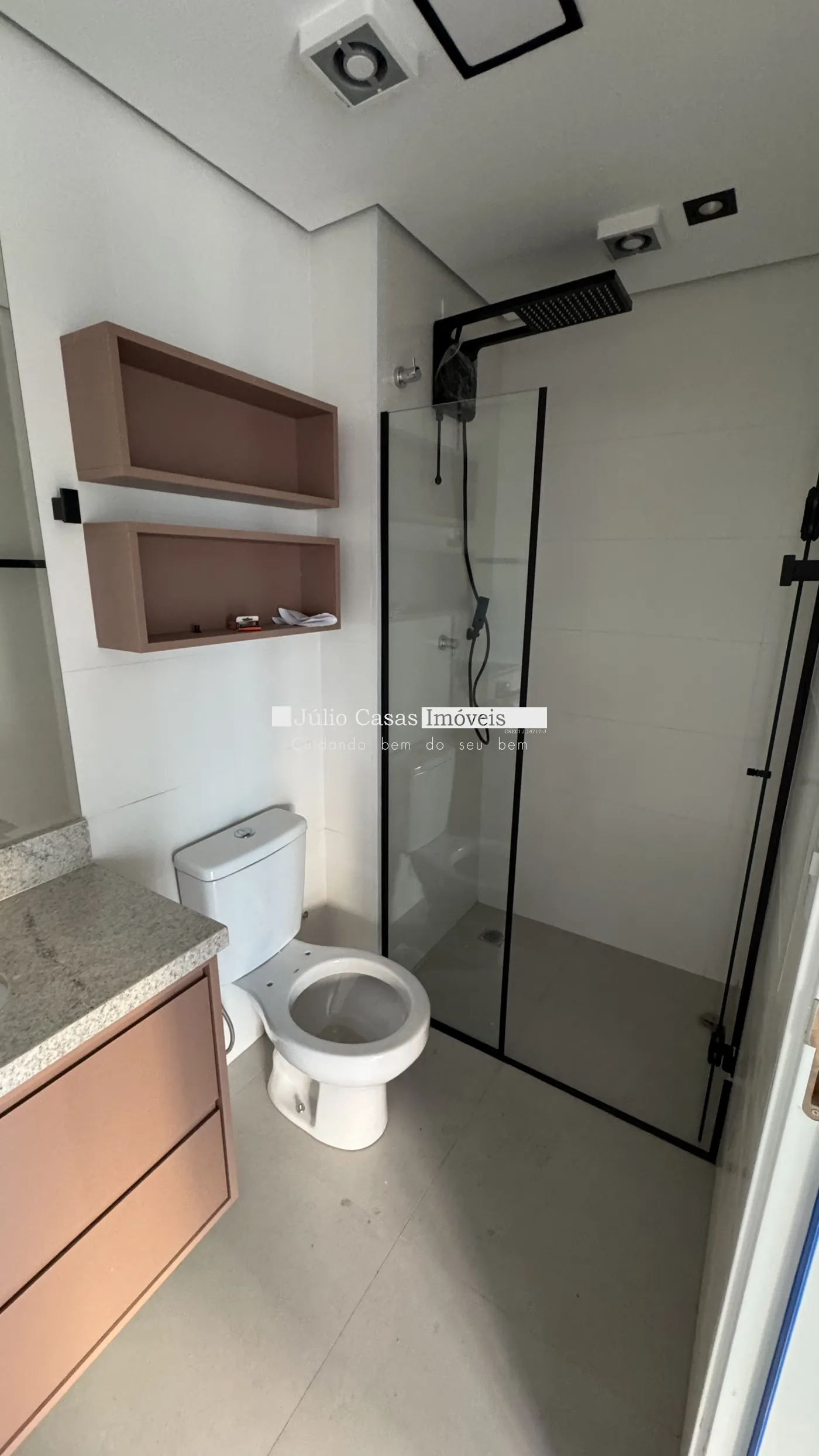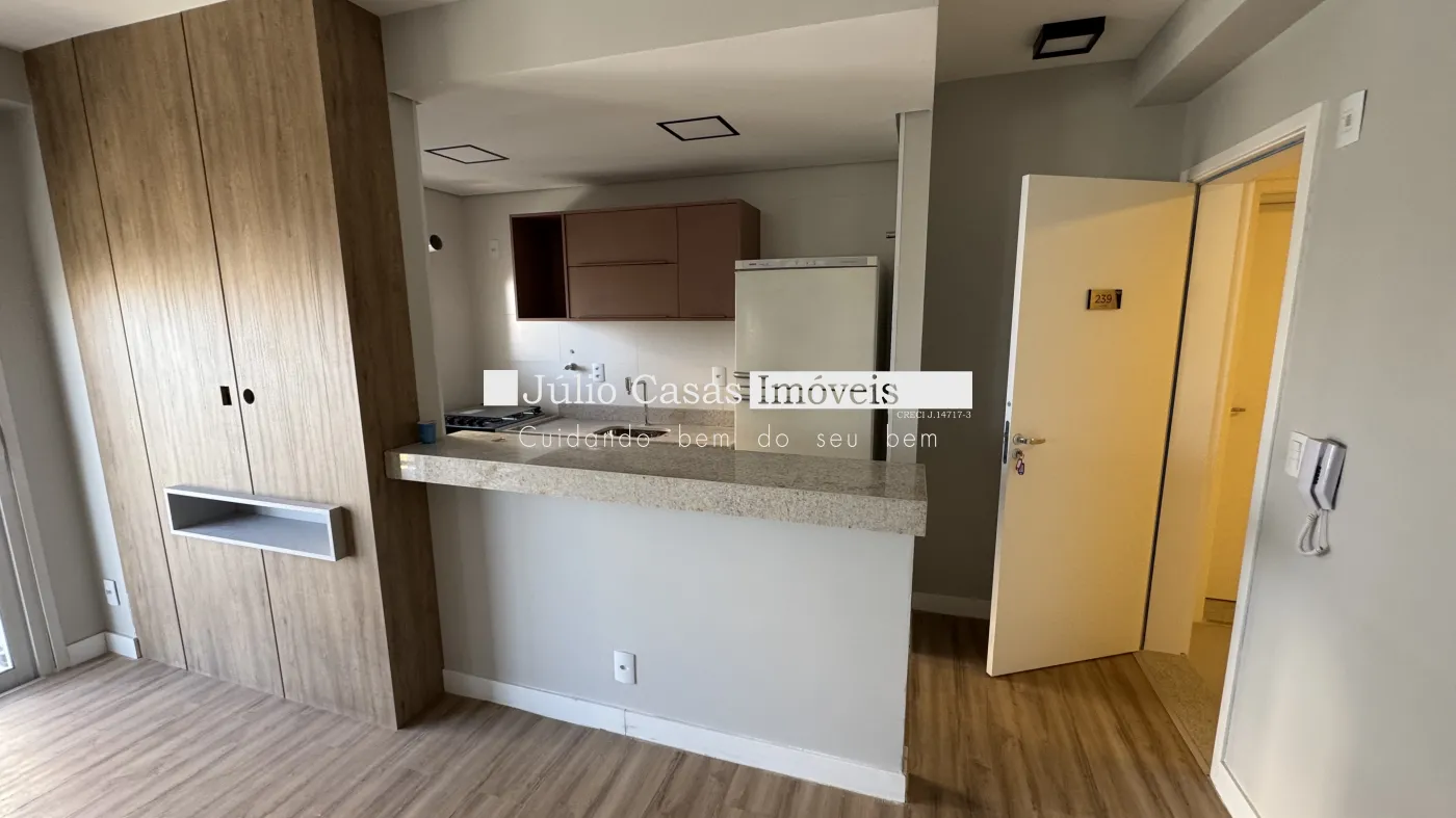 Apartamento Studio com área privativa de 37,00 m², localizado no 23º andar, mobiliado decorado com móveis planejados, sendo um quarto com suíte, sala dois ambientes, varanda, cozinha americana e garagem com uma vaga.