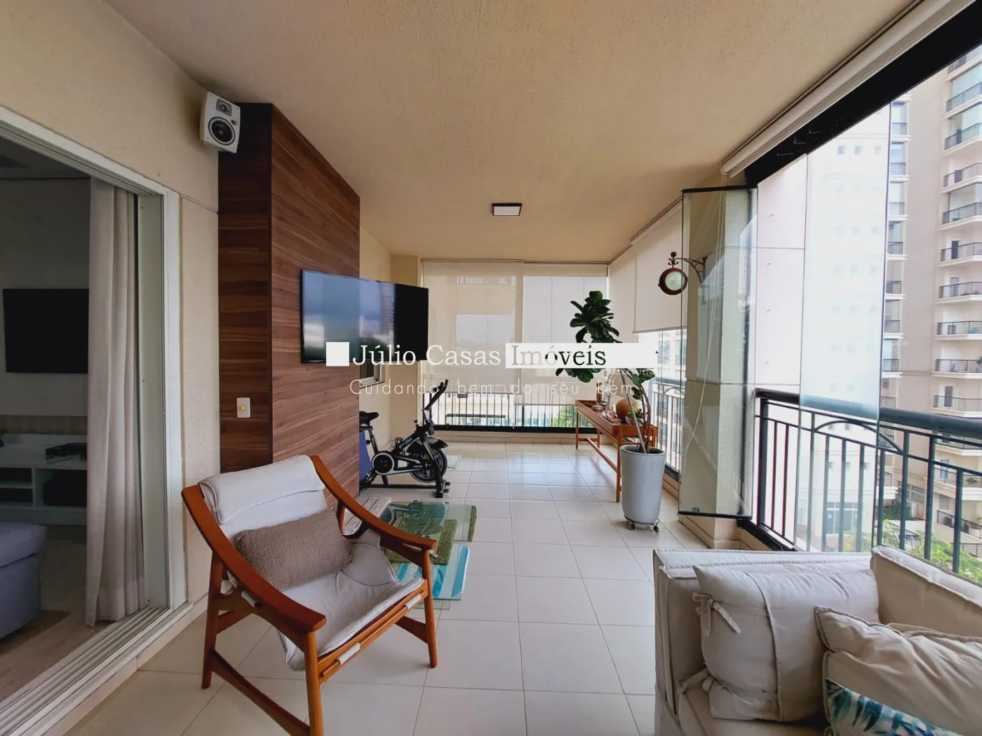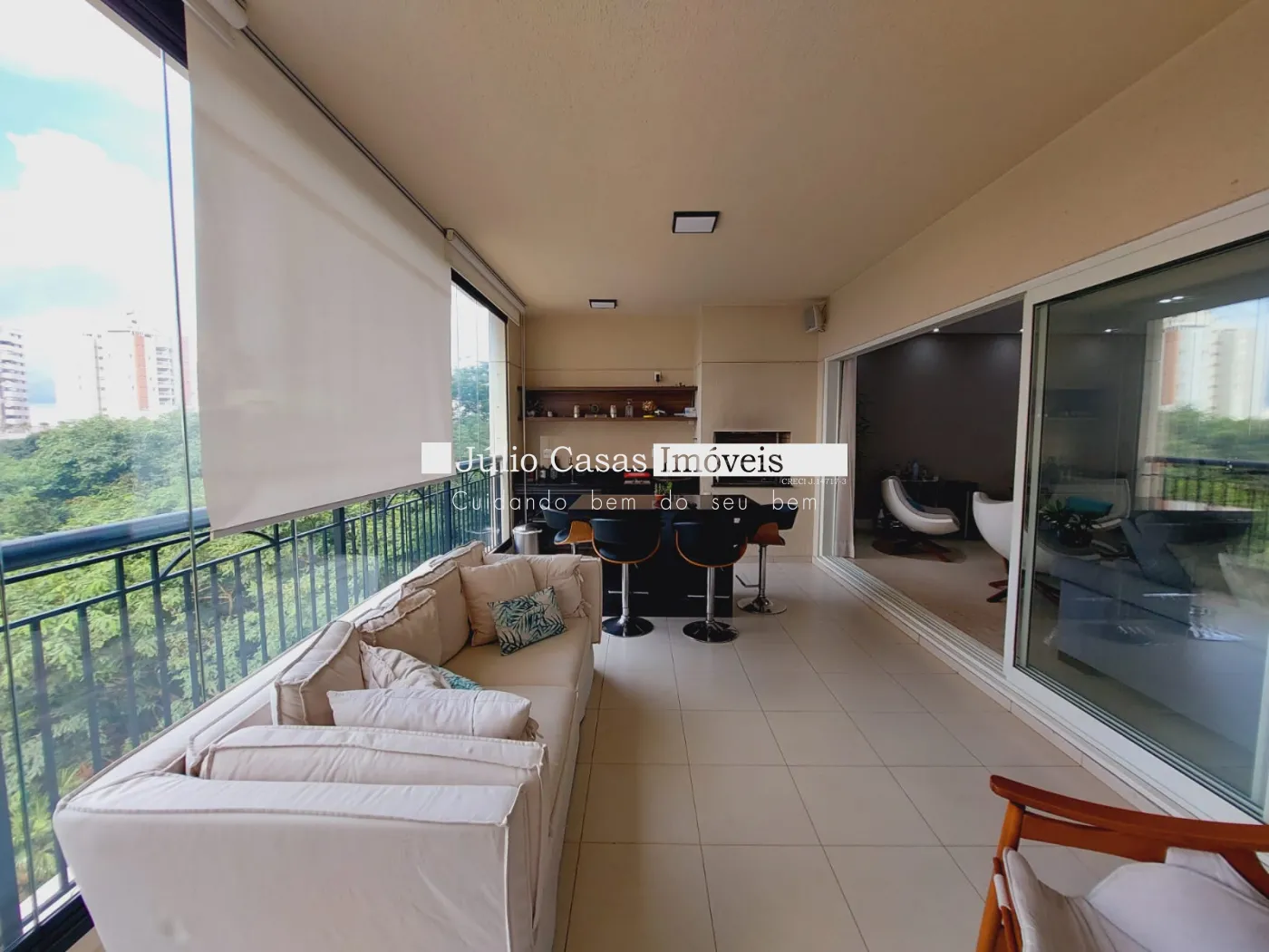 Varanda gourmet com churrasqueira e fechada em vidro