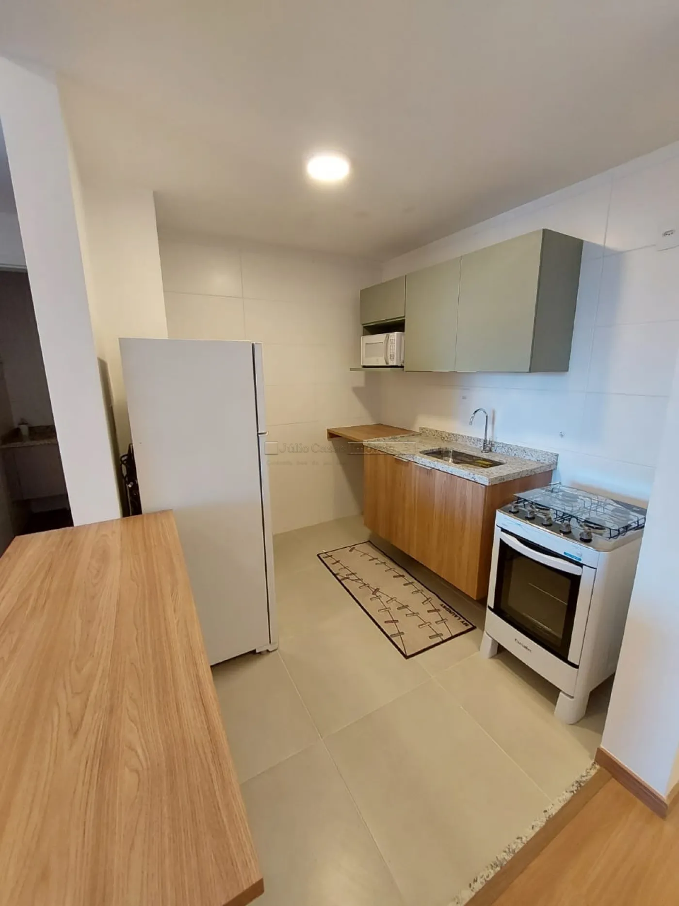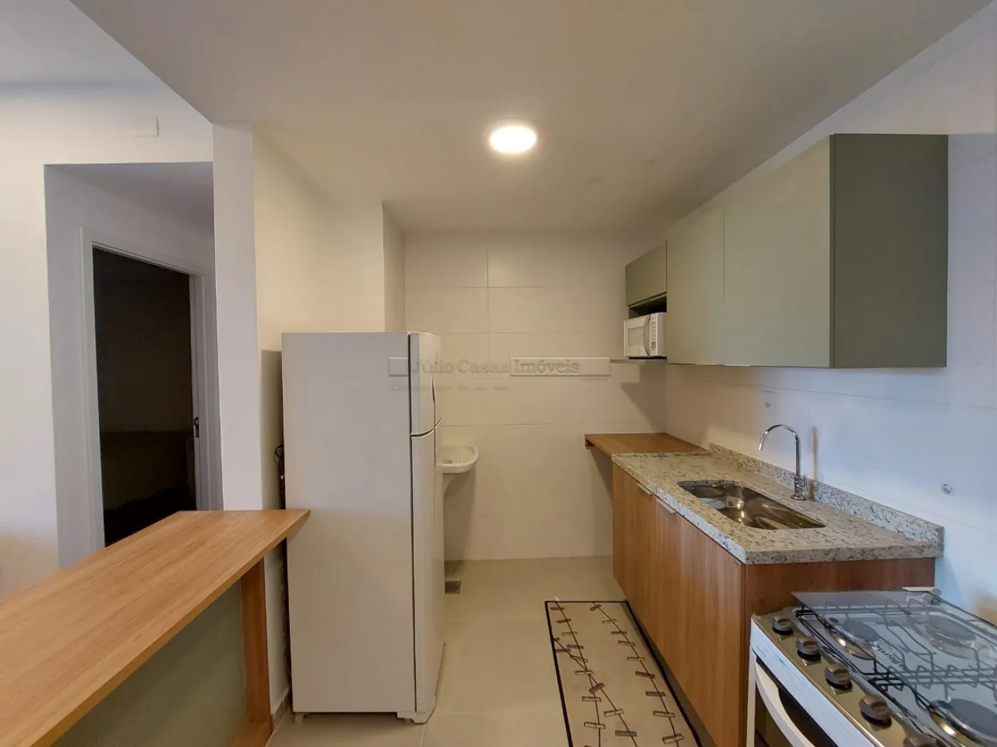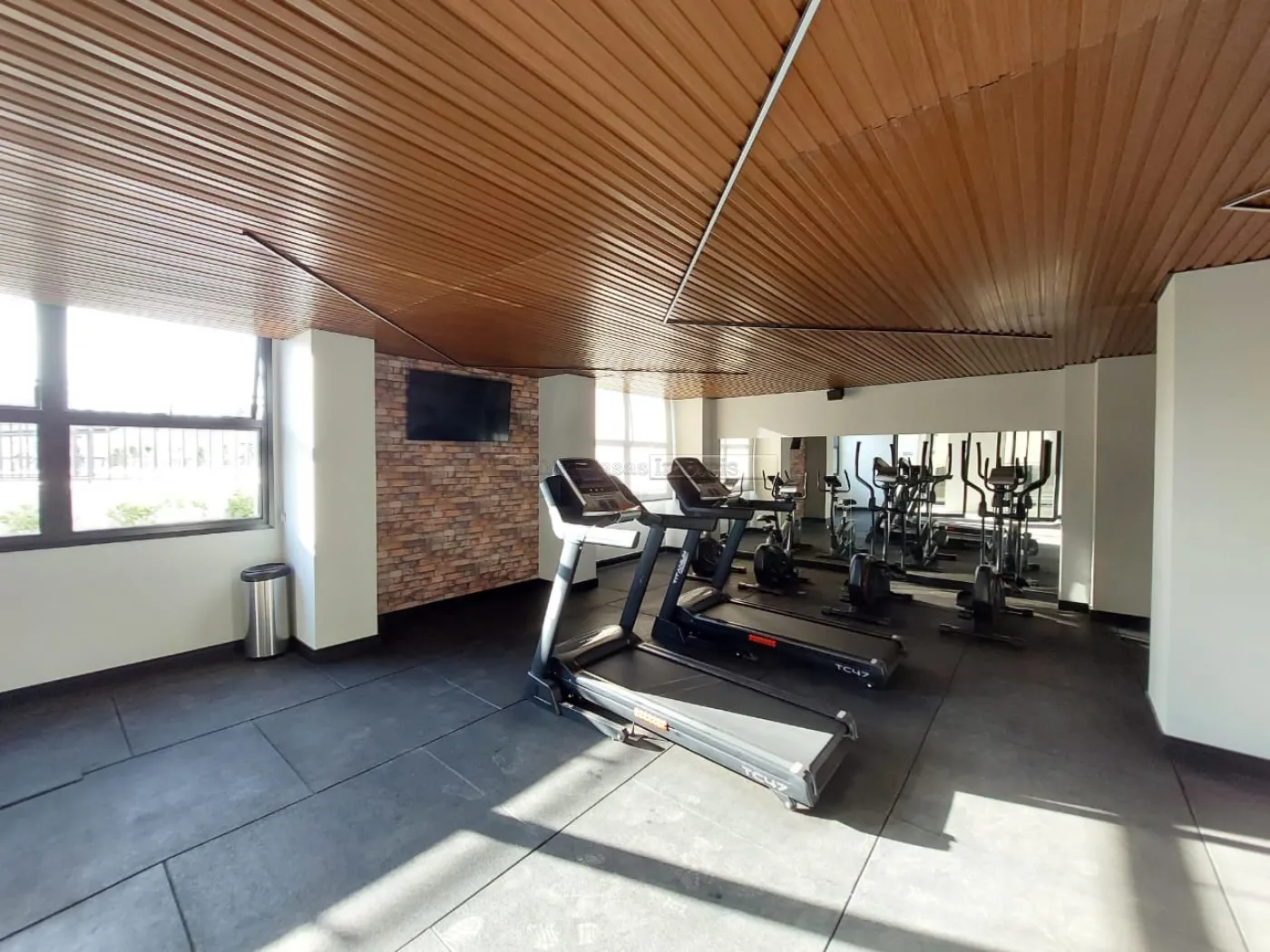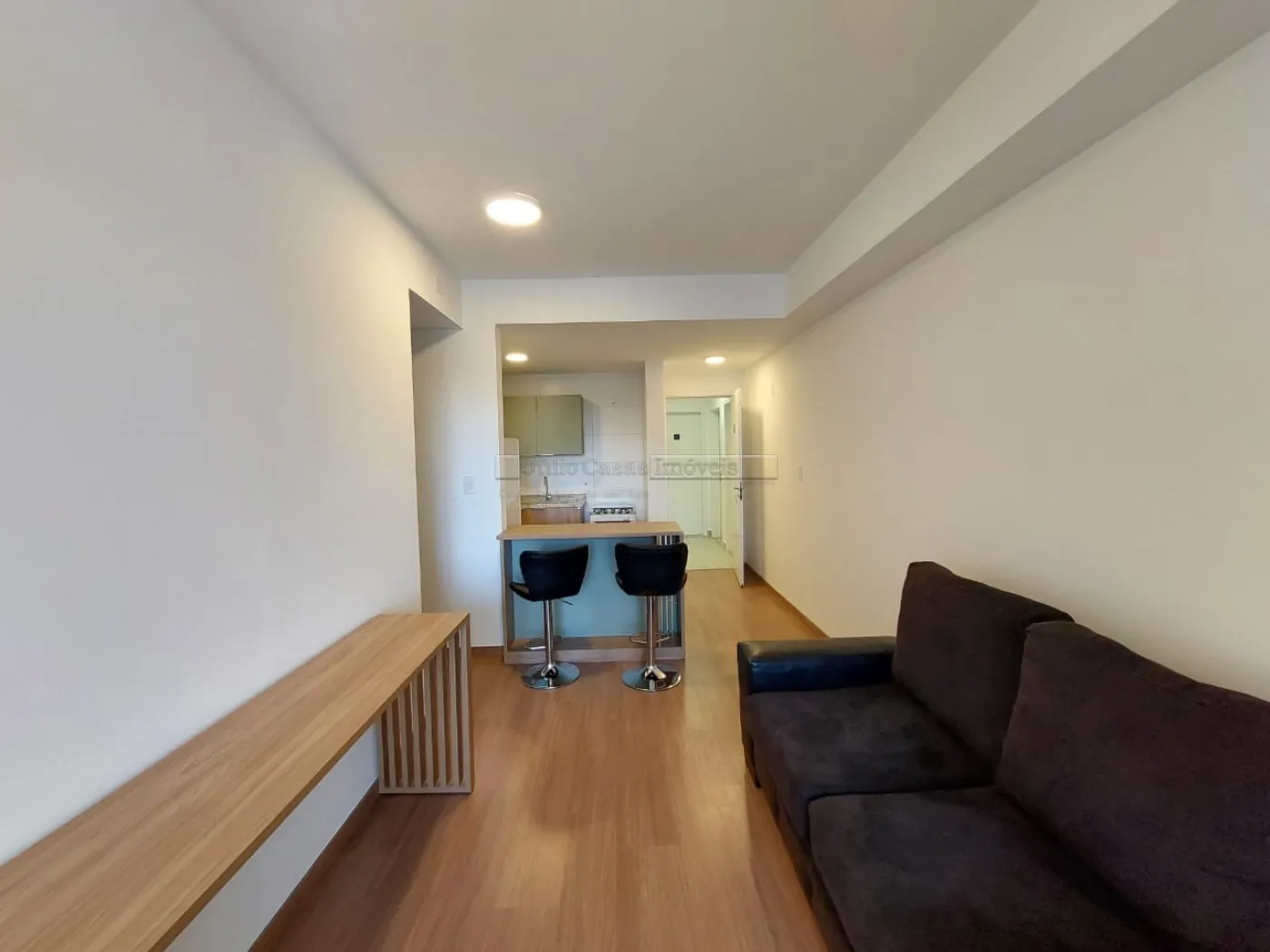 Este apartamento de 45 m² é perfeito para quem busca um espaço compacto e funcional, já totalmente mobiliado. O imóvel possui uma sala aconchegante com sofá e aparador, e uma área gourmet equipada com pia e mesa, ideal para pequenas refeições ou encontros. A cozinha é integrada ao estilo americano, e está equipada com fogão, geladeira e armários, proporcionando praticidade e funcionalidade.