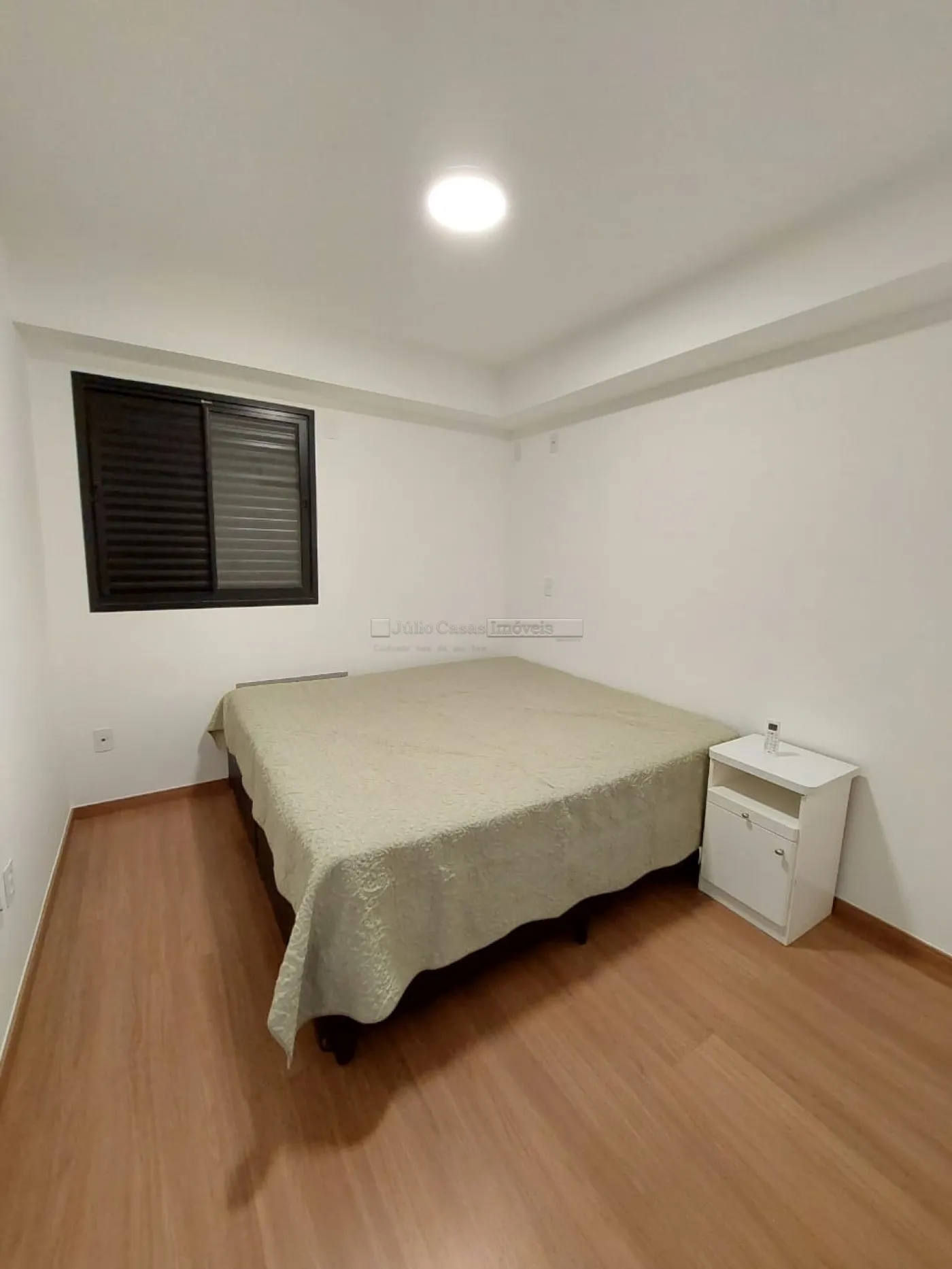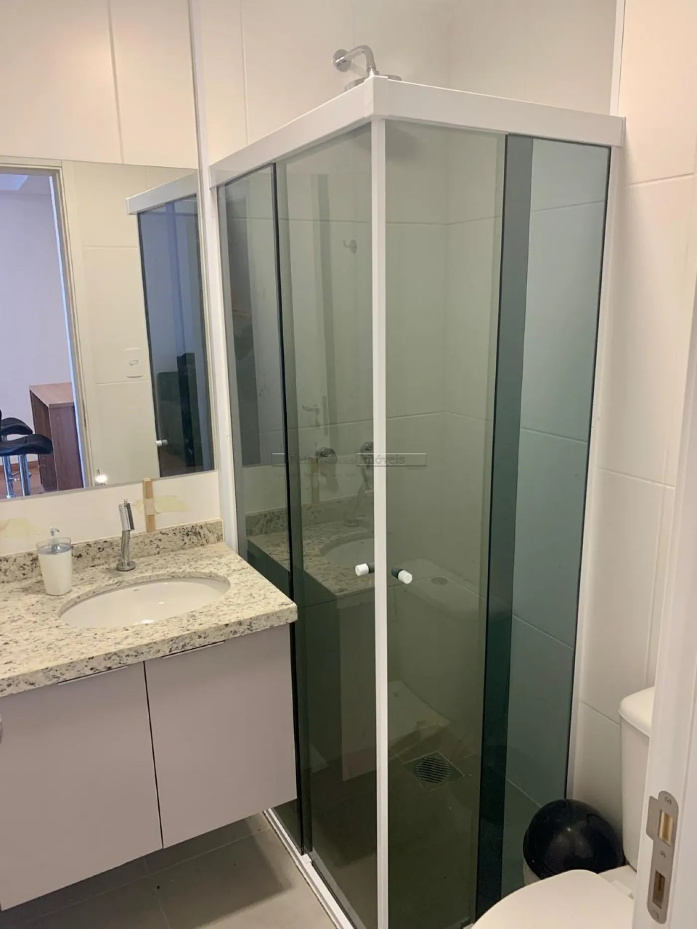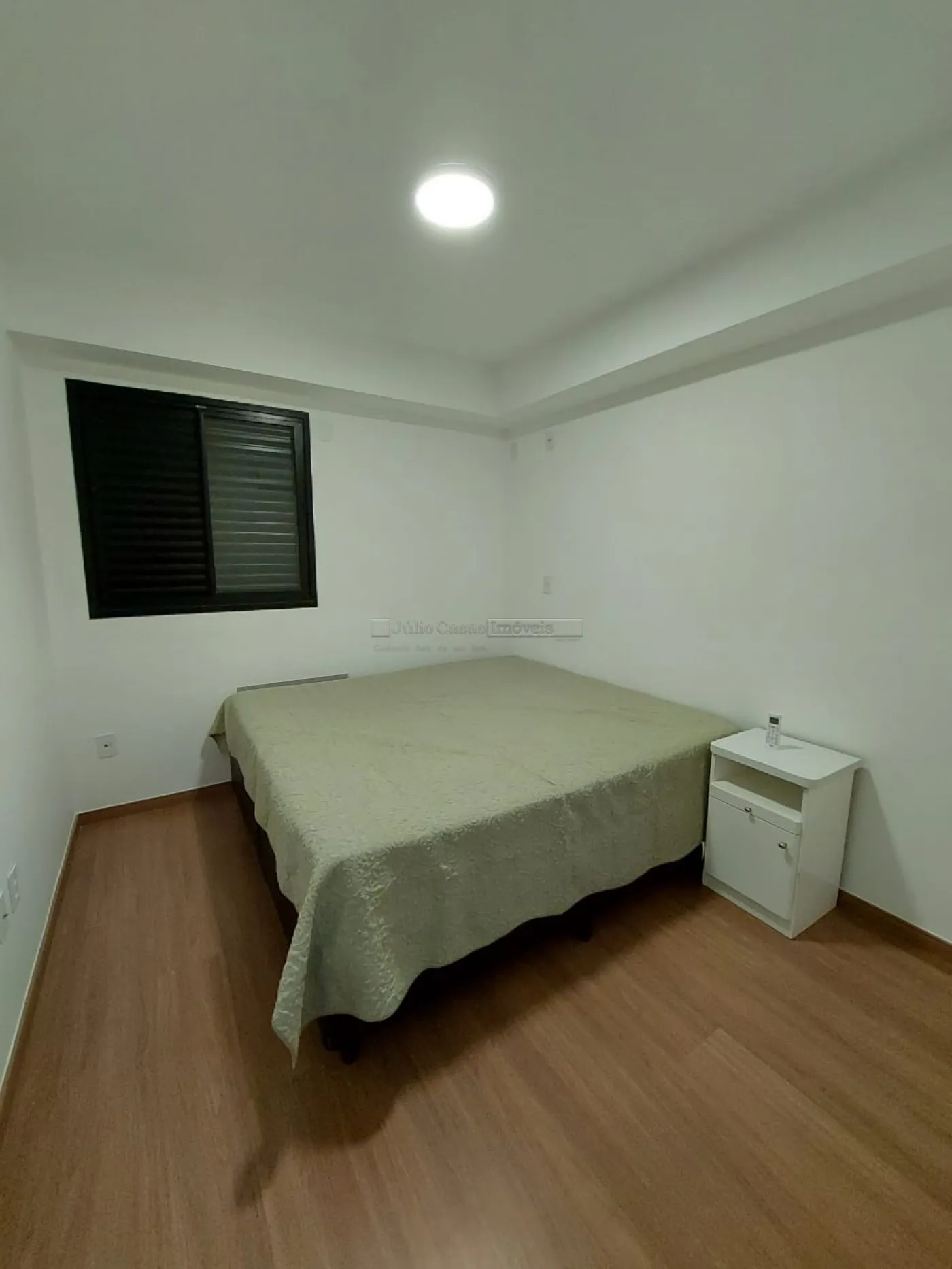 O quarto, com piso laminado, está mobiliado com cama e criado-mudo, oferecendo um ambiente confortável e acolhedor. O banheiro social é moderno, com gabinete, espelho e box de vidro, garantindo um espaço elegante e bem cuidado.