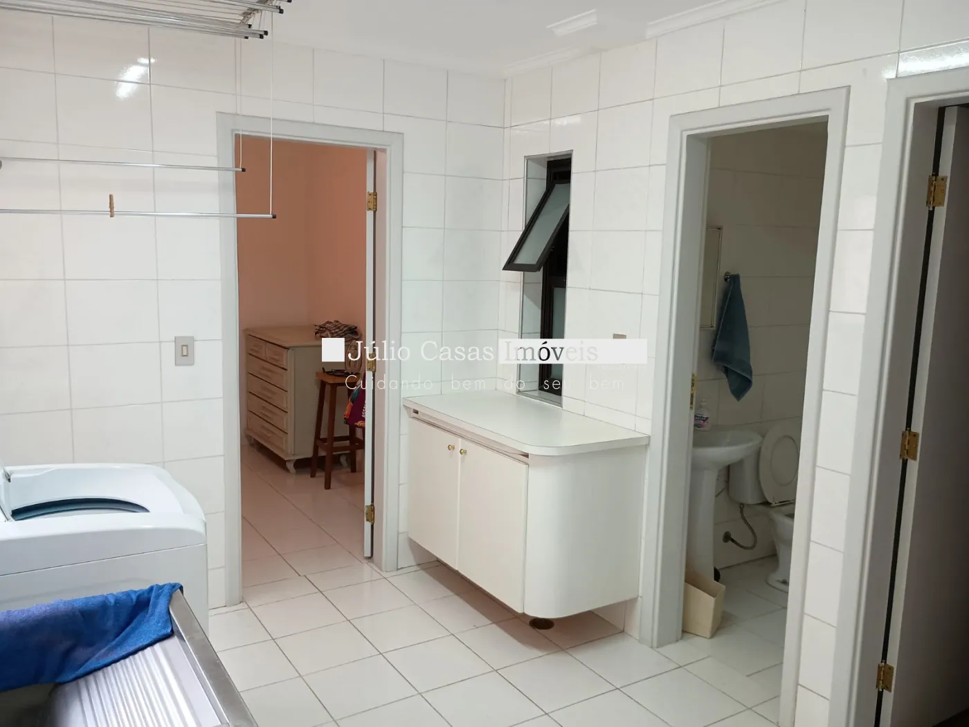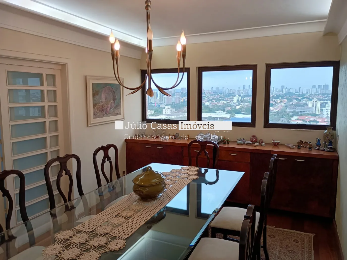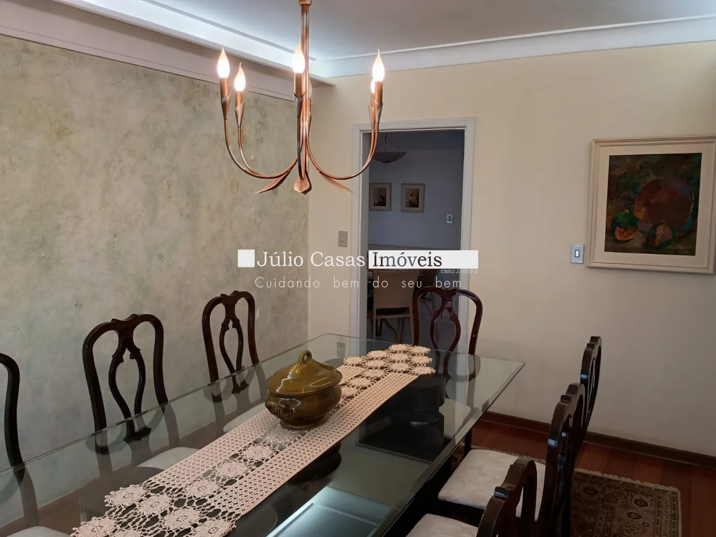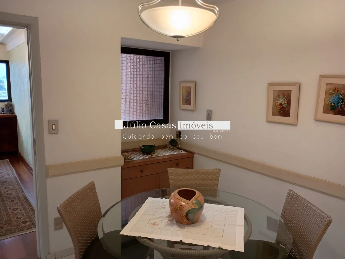 O apartamento conta com uma ampla sala de estar com porta balcão e sacada, salas de TV, jantar e almoço que se integram harmoniosamente. A cozinha, toda modulada, está conectada à área de serviço funcional, além de quarto e banheiro de empregada. São três dormitórios, sendo duas suítes, incluindo a master com banheira e closet. Há também um banheiro social, todos com aquecimento a gás.