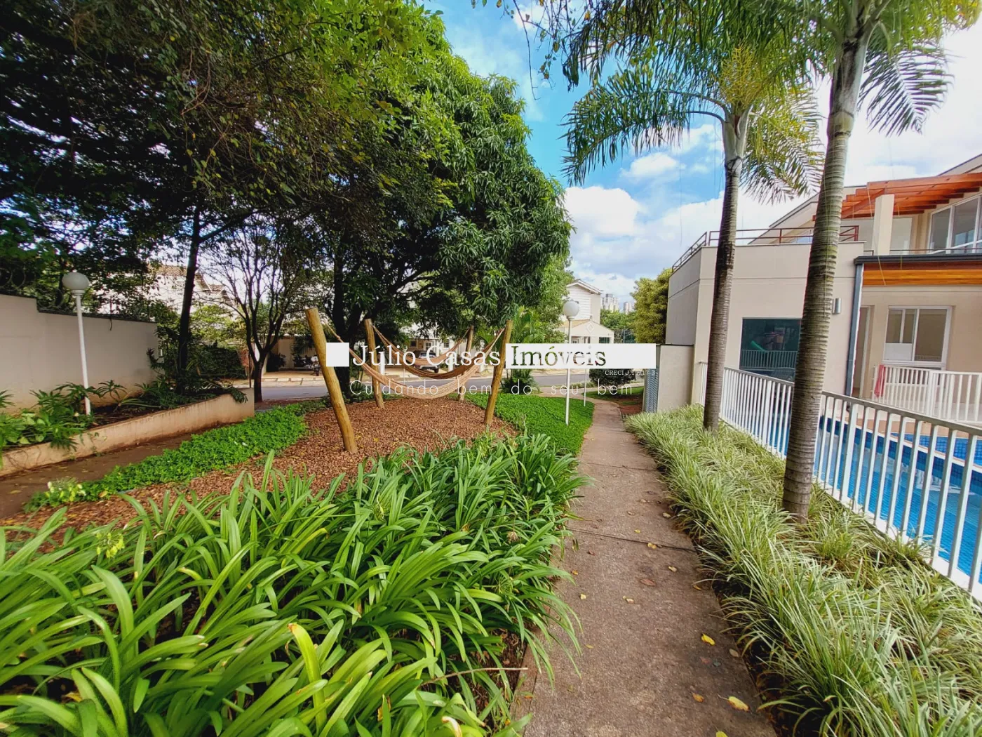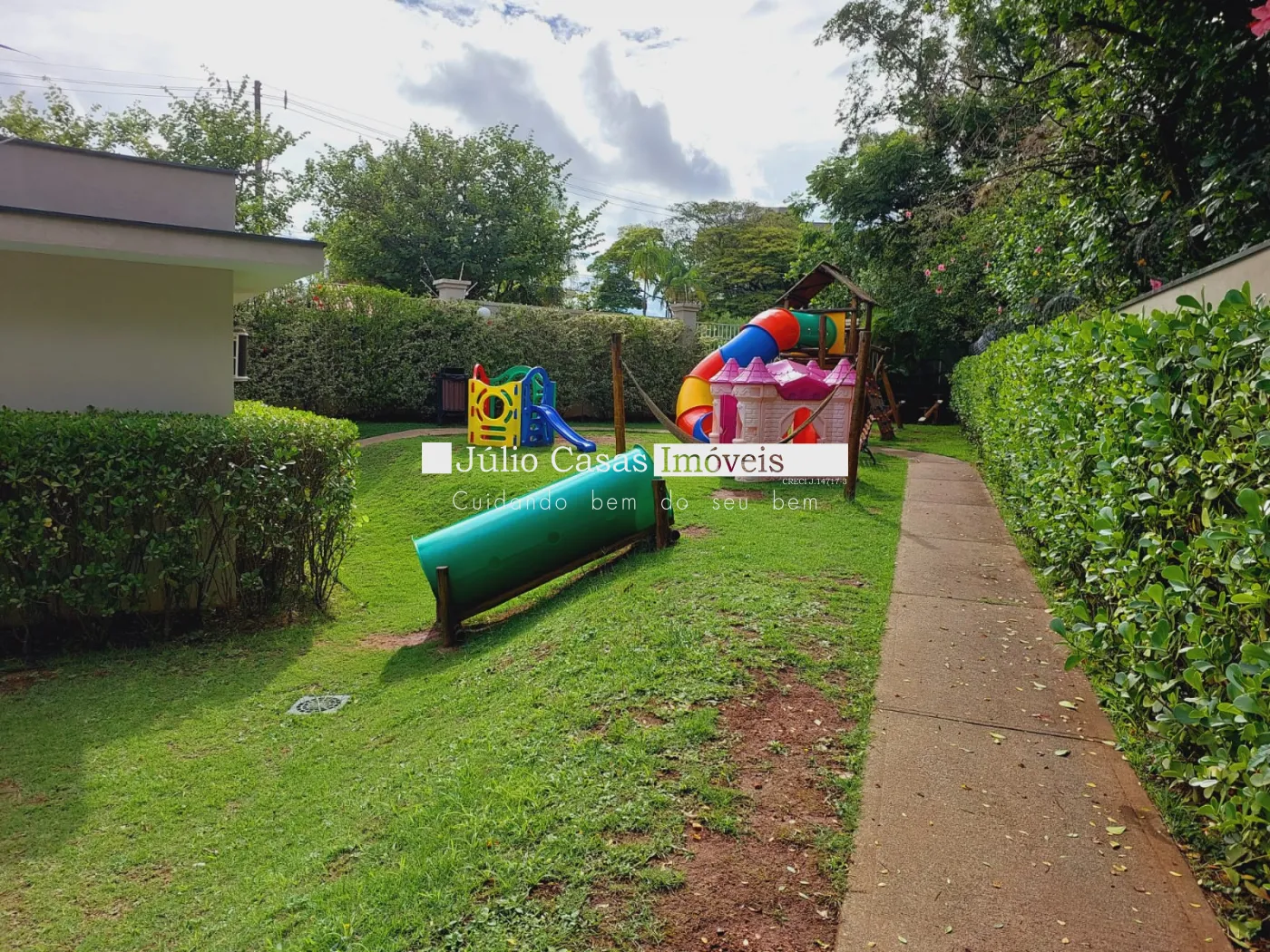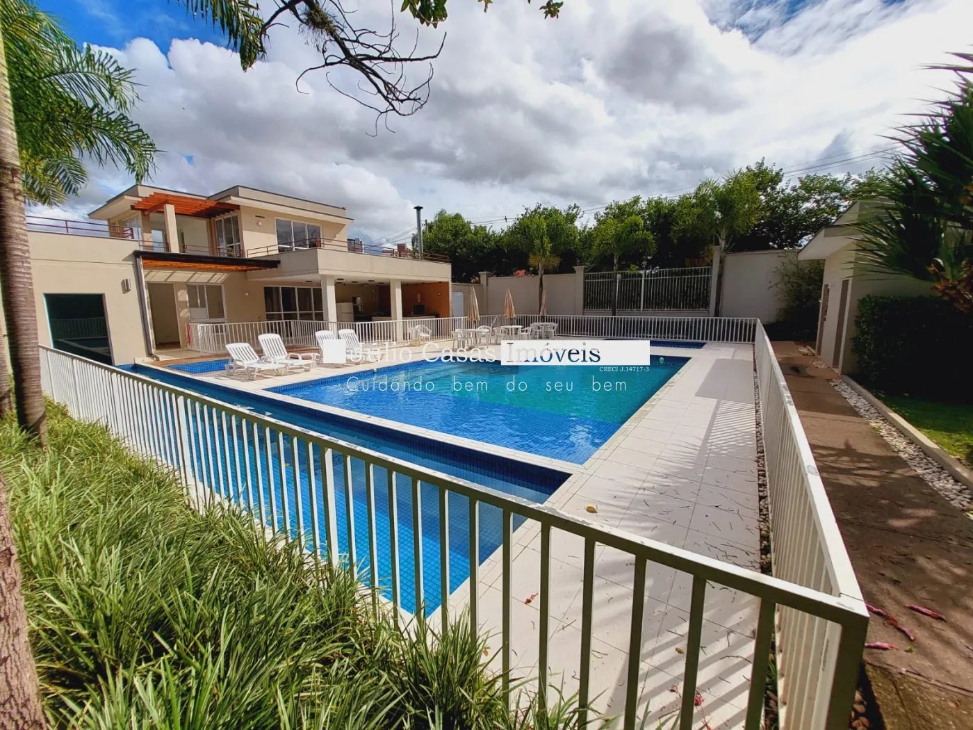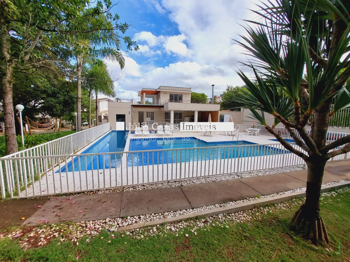 Condomínio com piscina adulto e infantil, playground, quadra poliesportiva e salão de festas.