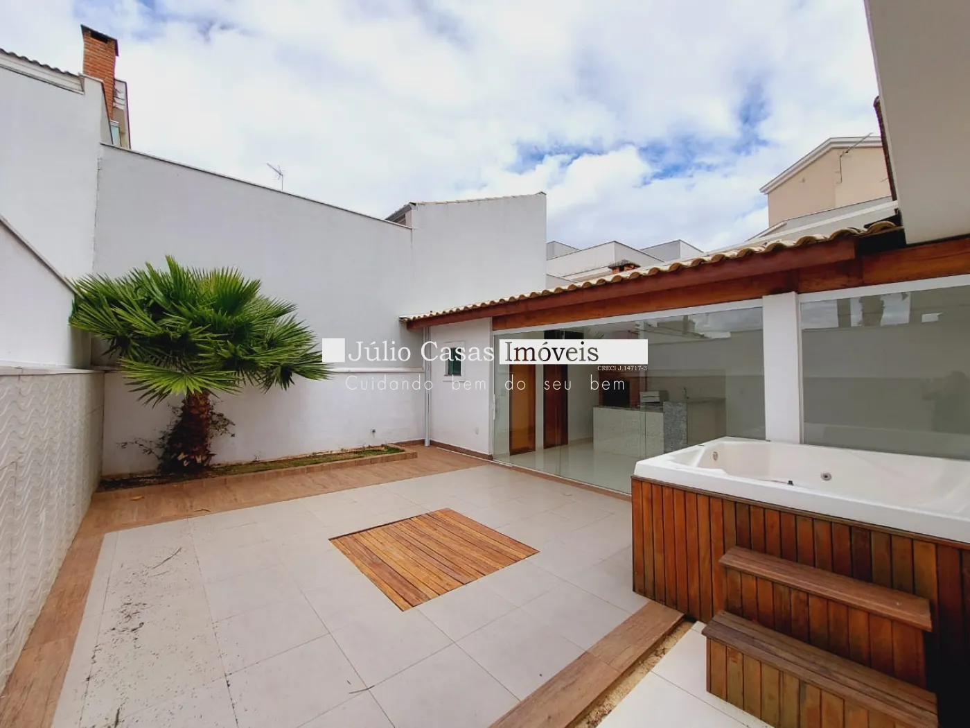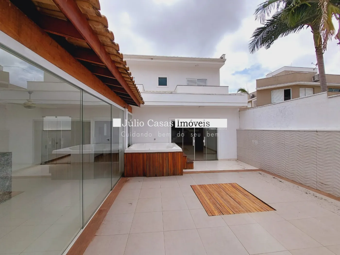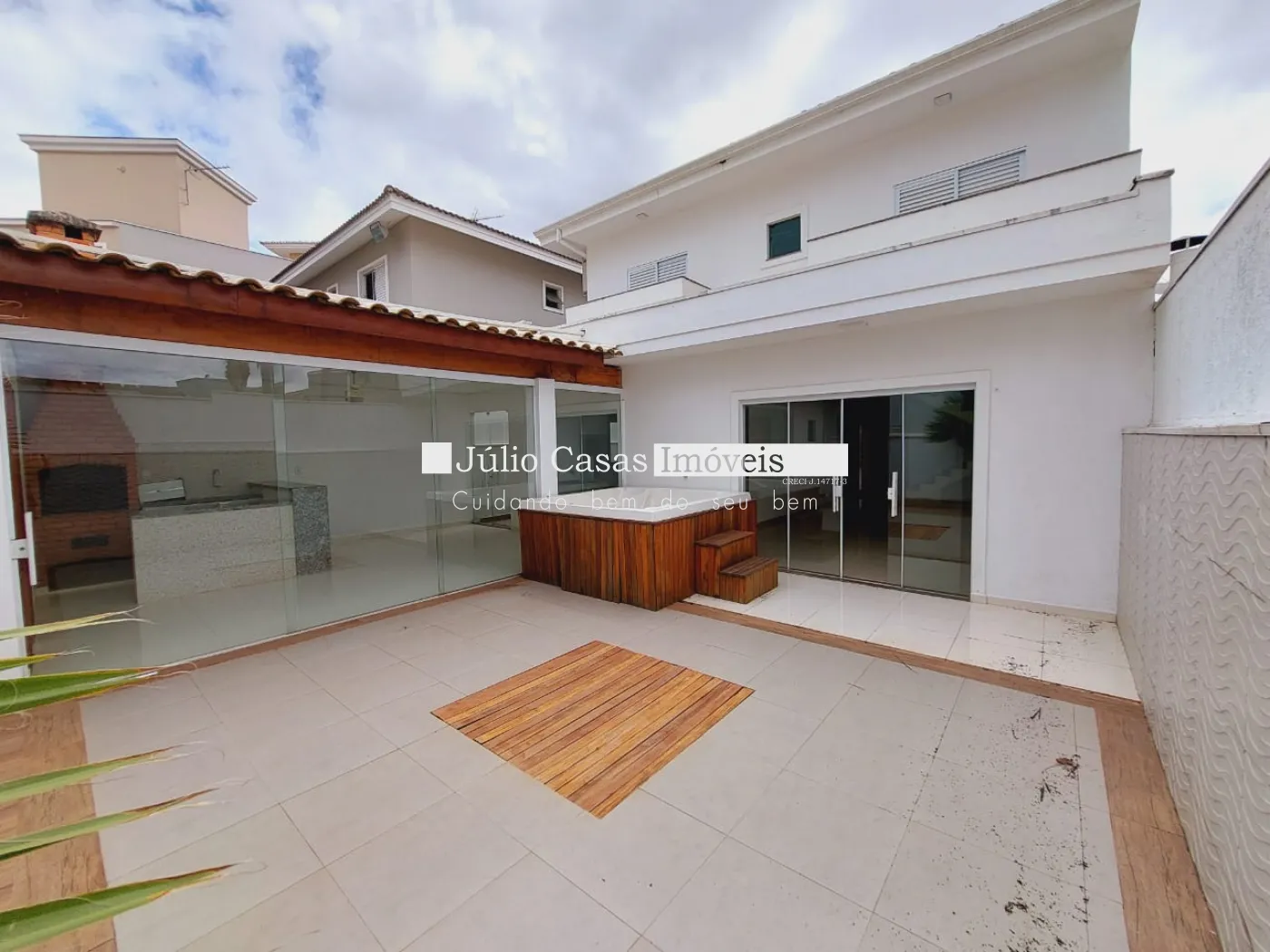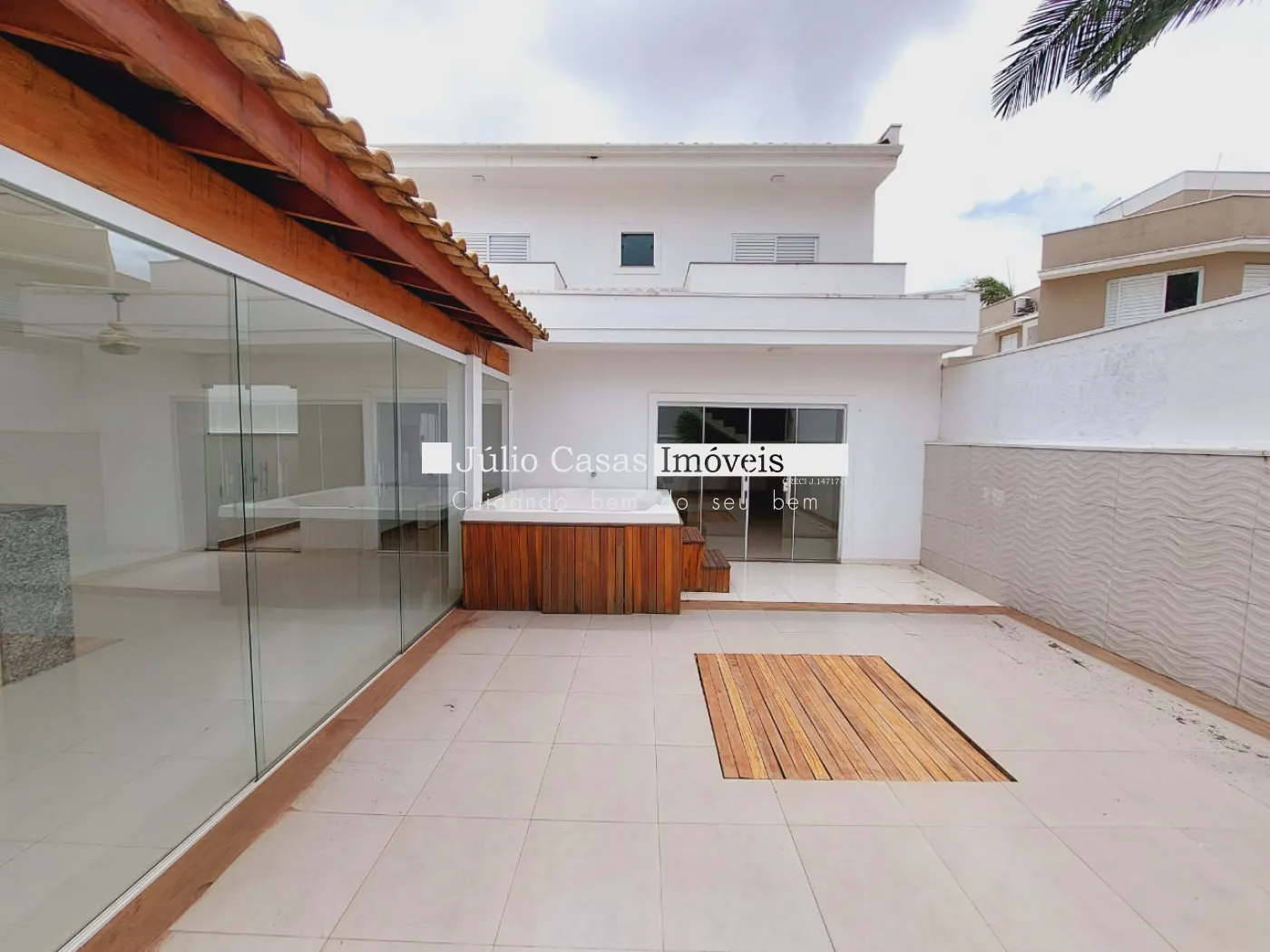 Casa em condomínio para aluguel com sala ampla em piso porcelanato, escritório modulado em piso cerâmico, lavabo, cozinha modulada com coifa em inox, despensa, lavanderia com armários, área gourmet com churrasqueira, pia de apoio, armários com fechamento em vidro temperado, quarto com modulados e wc. Quintal com Jacuzzi.