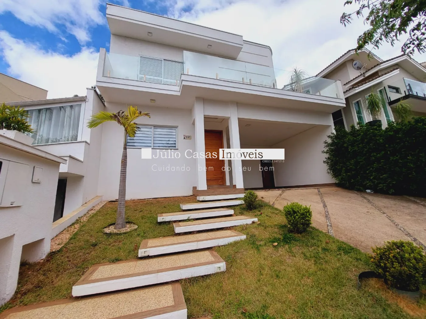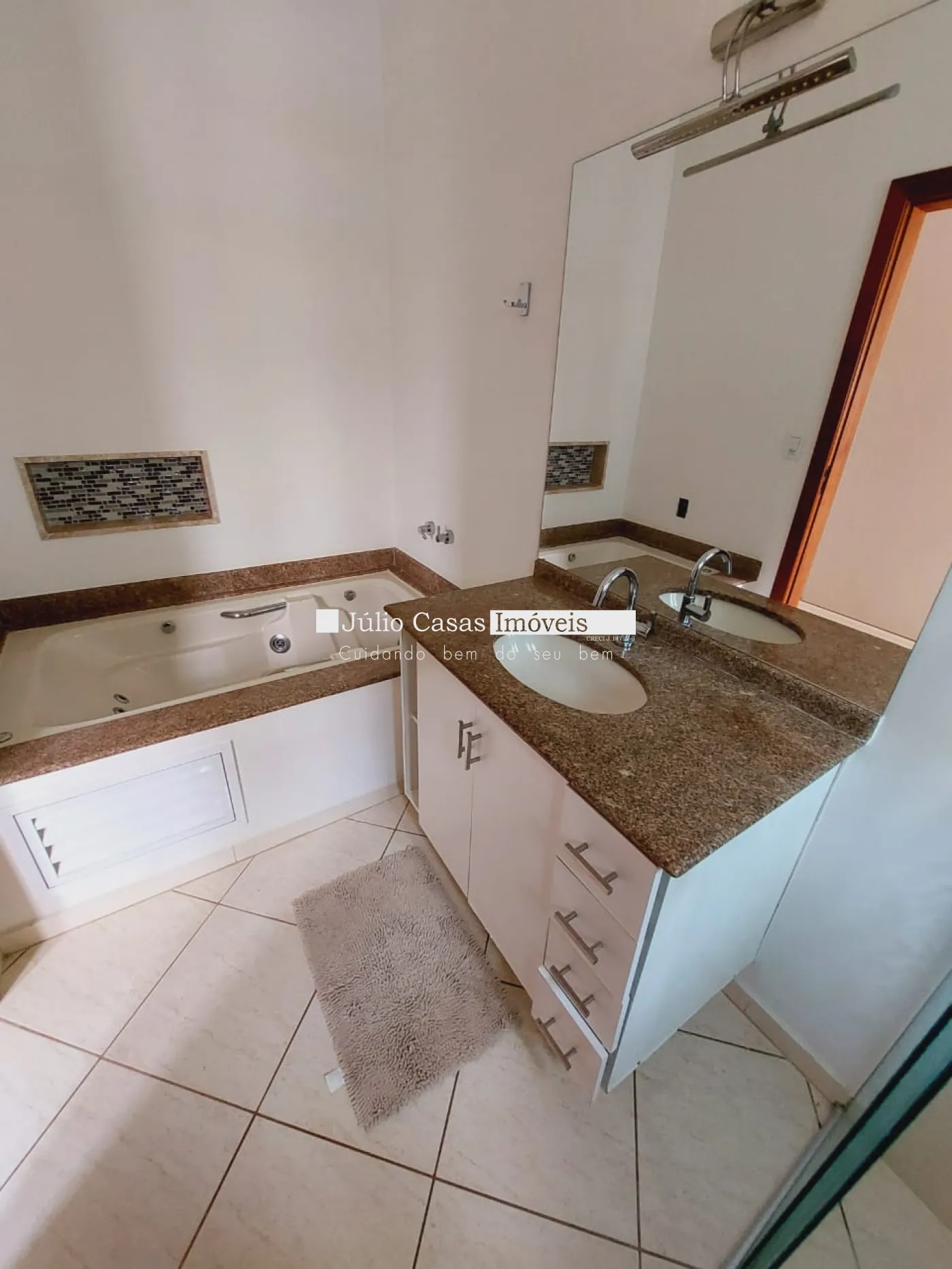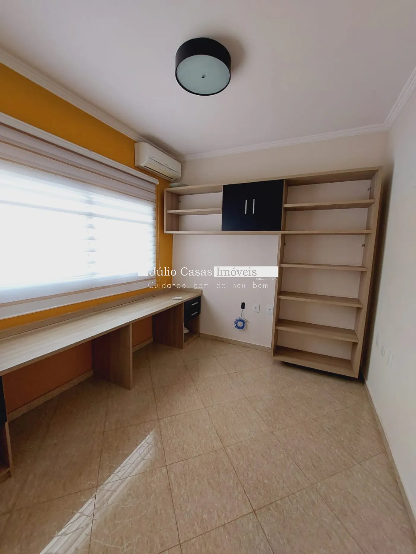 Casa em condomínio para aluguel com sala ampla em piso porcelanato, escritório modulado em piso cerâmico, lavabo, cozinha modulada com coifa em inox, despensa, lavanderia com armários, área gourmet com churrasqueira, pia de apoio, armários com fechamento em vidro temperado, quarto com modulados e wc. Quintal com Jacuzzi.