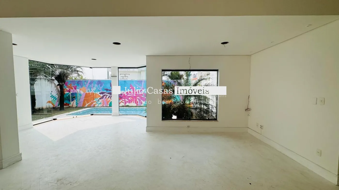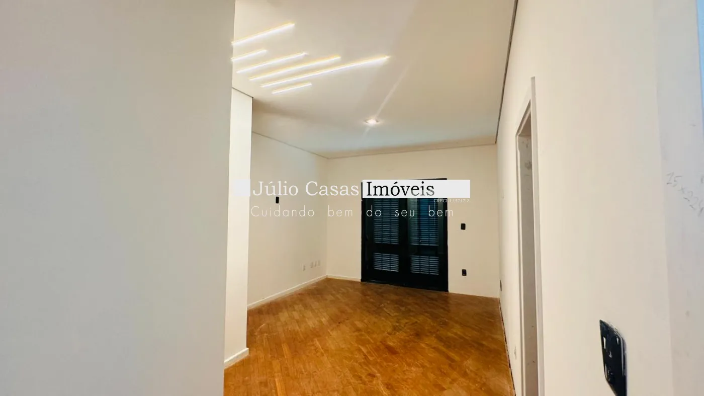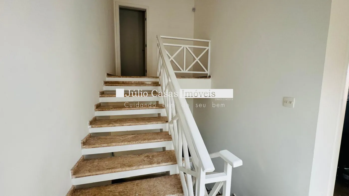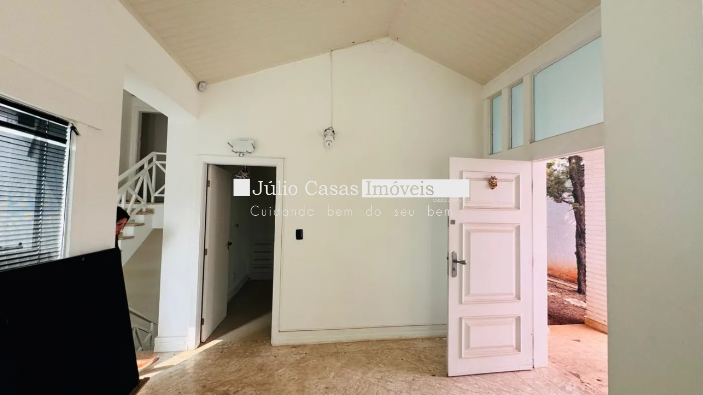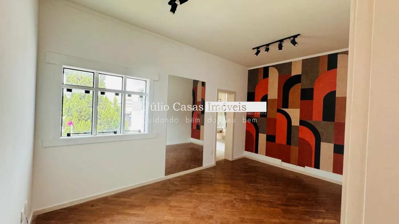 No primeiro pavimento, a casa possui um hall de entrada e uma sala ampla com três ambientes, revestida em piso de madeira. A cozinha é espaçosa e modulada, assim como a área de serviço, que tem saídas para o jardim.