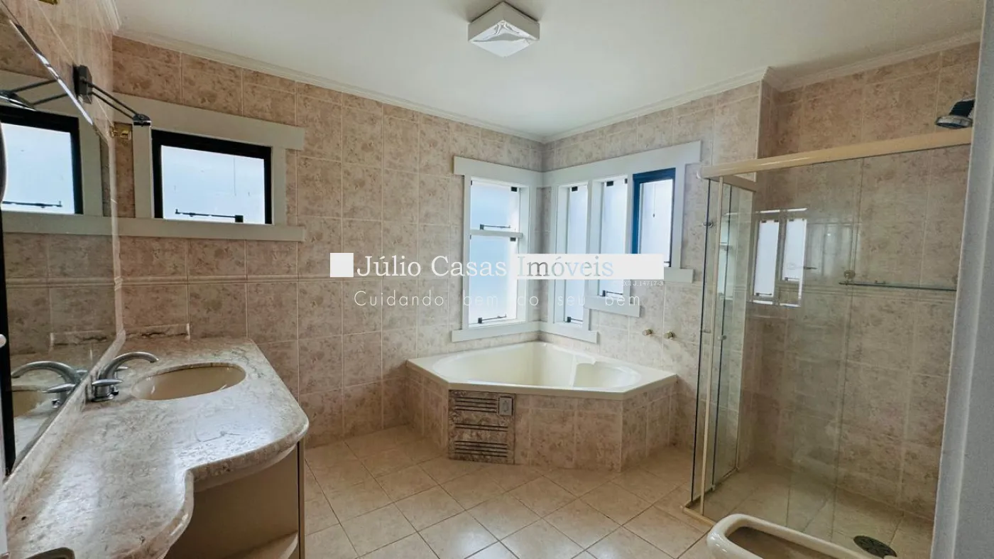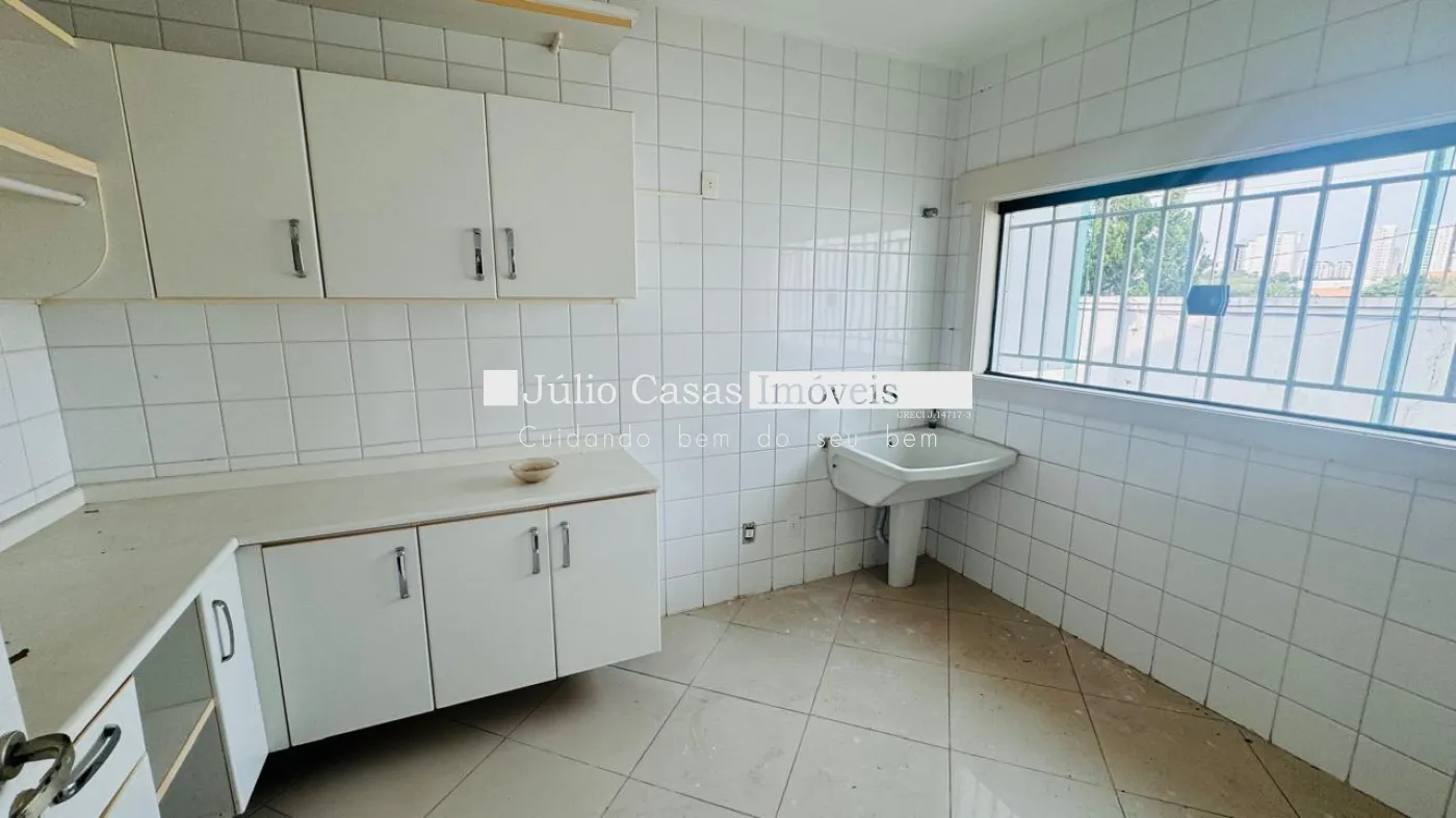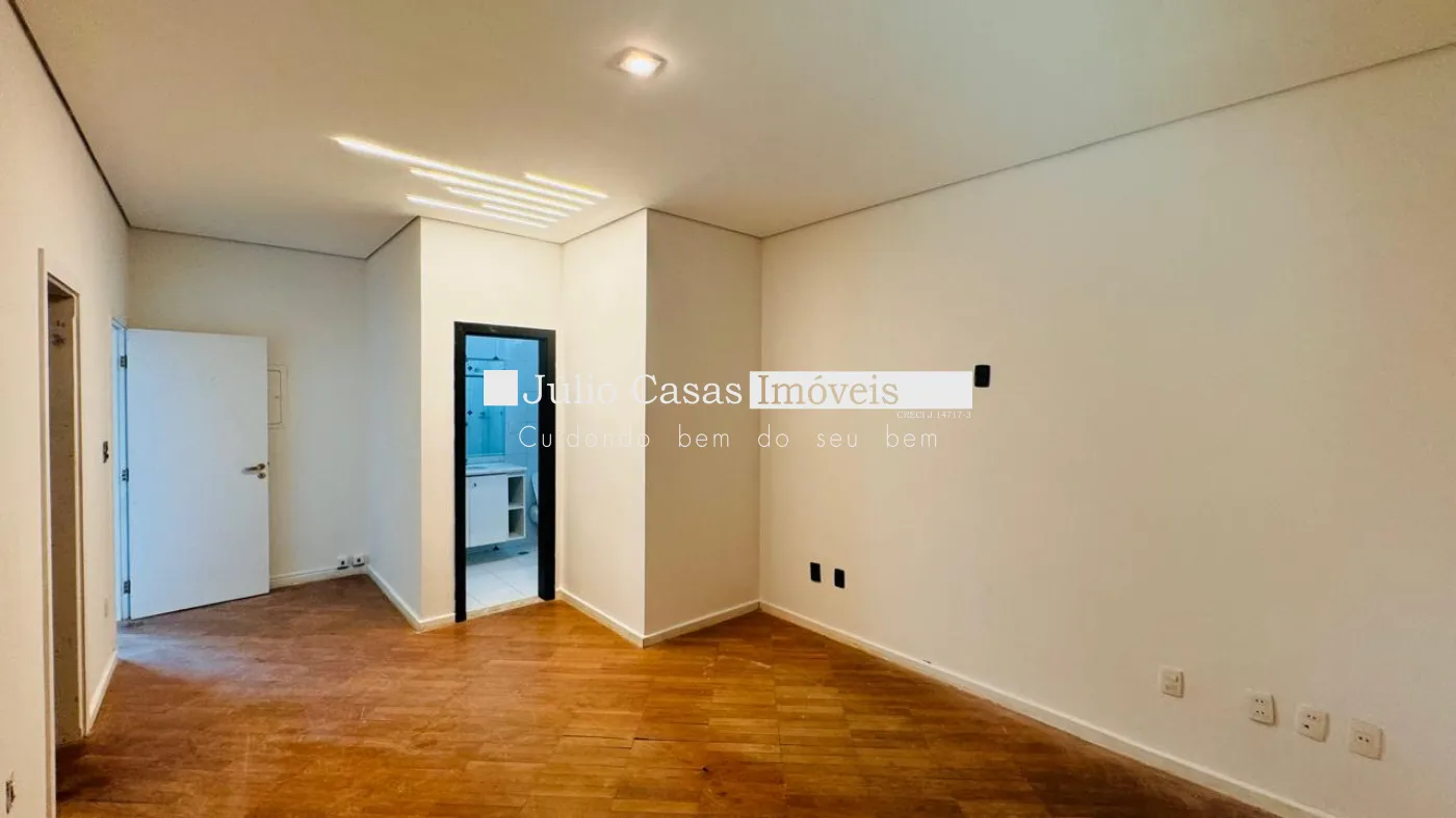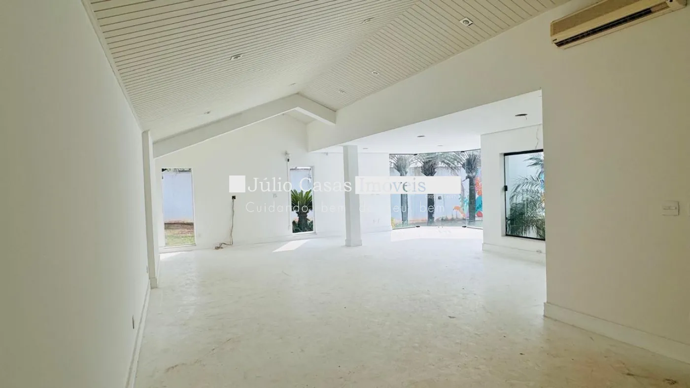 No primeiro pavimento, a casa possui um hall de entrada e uma sala ampla com três ambientes, revestida em piso de madeira. A cozinha é espaçosa e modulada, assim como a área de serviço, que tem saídas para o jardim.