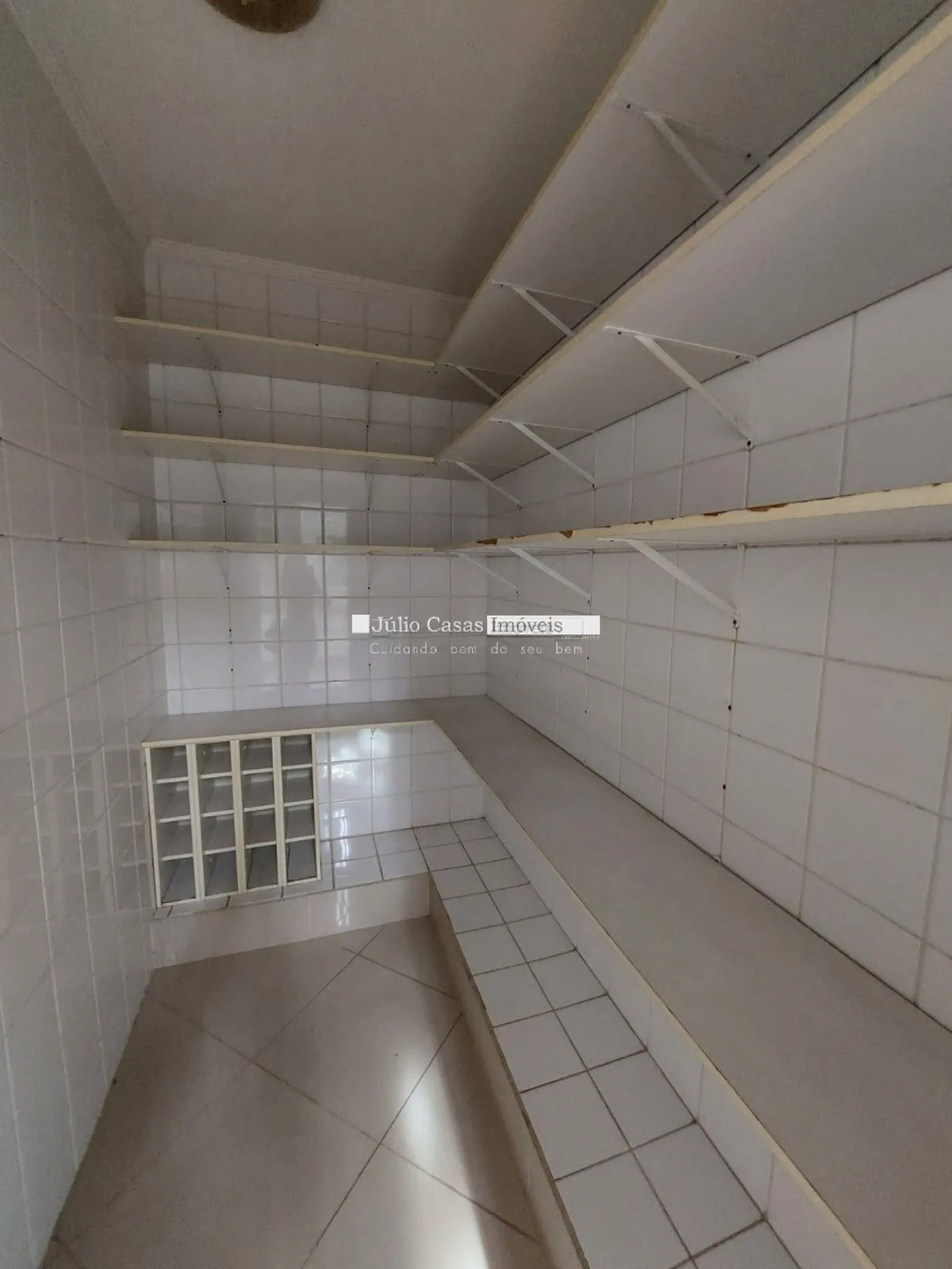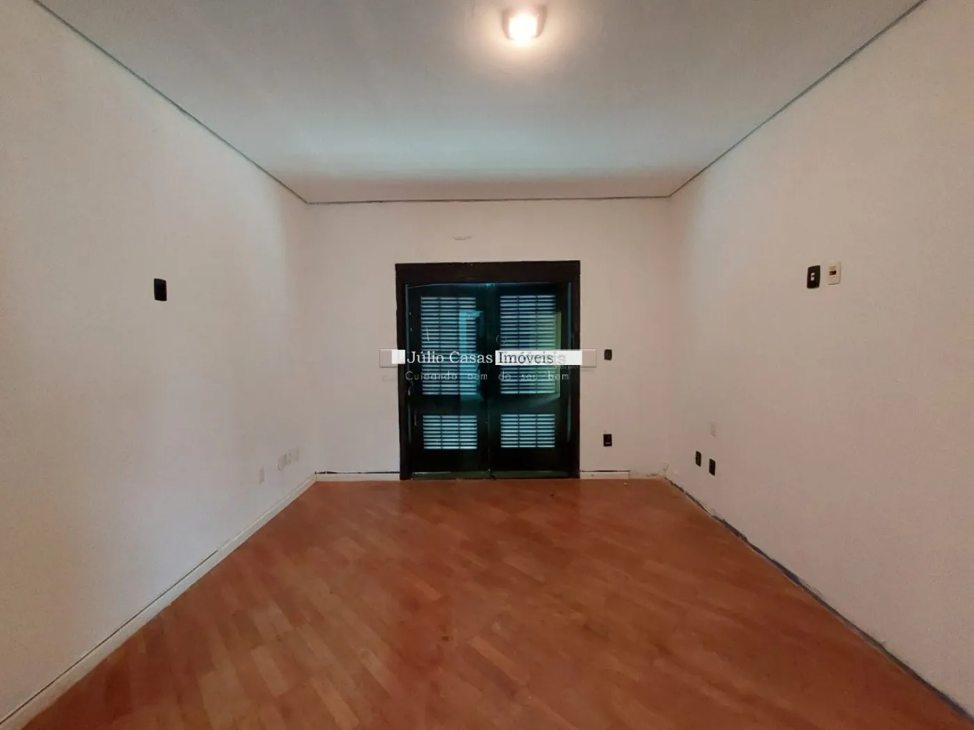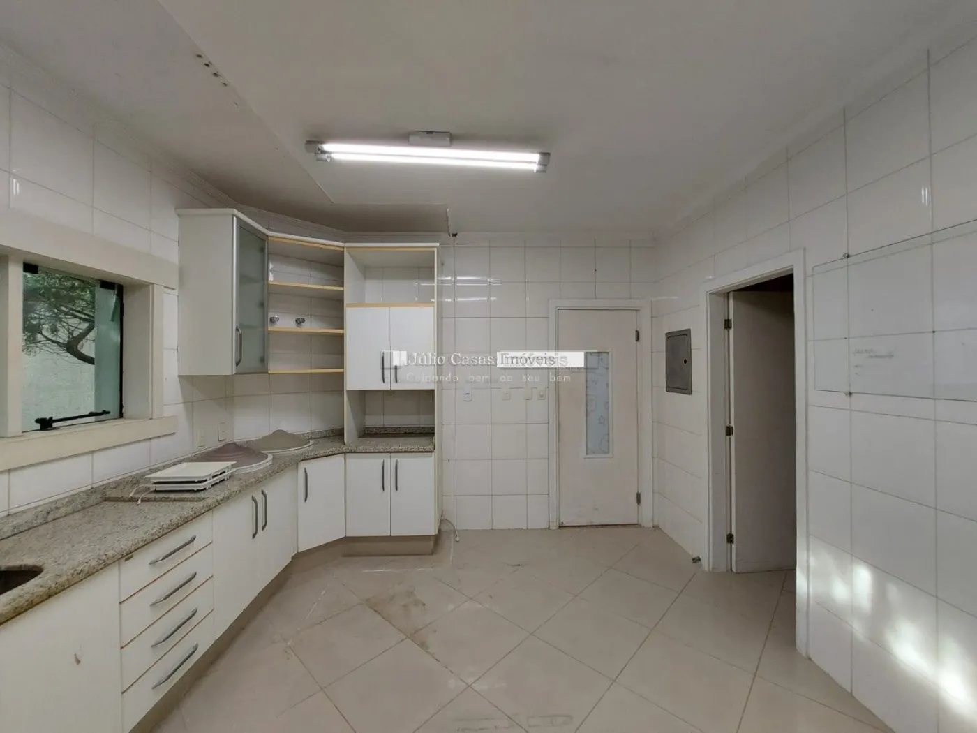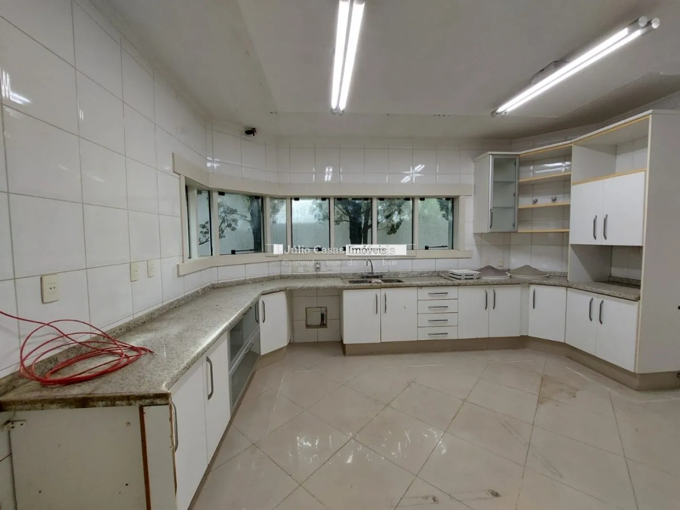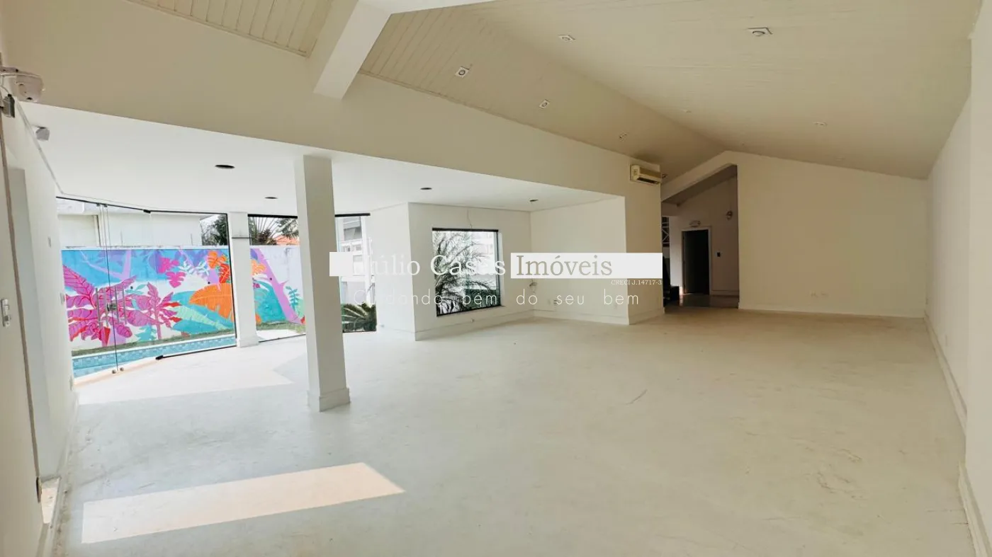 No primeiro pavimento, a casa possui um hall de entrada e uma sala ampla com três ambientes, revestida em piso de madeira. A cozinha é espaçosa e modulada, assim como a área de serviço, que tem saídas para o jardim.
