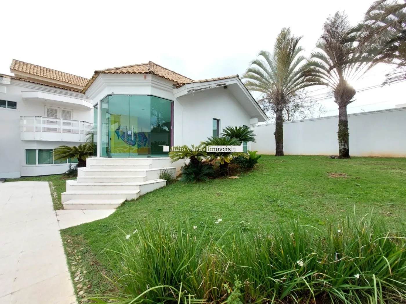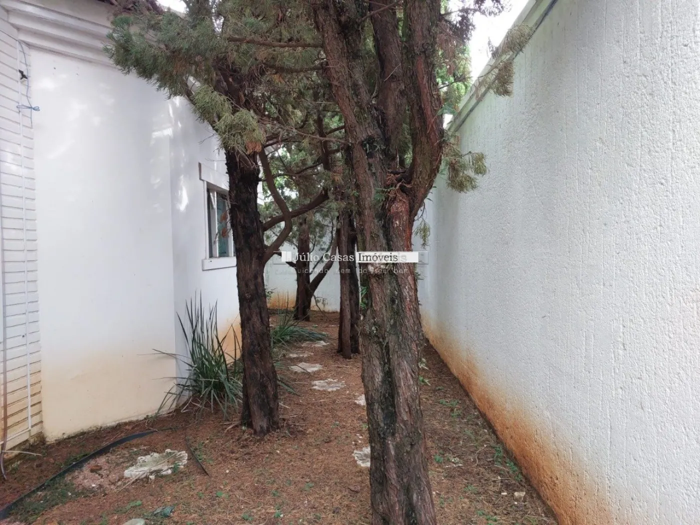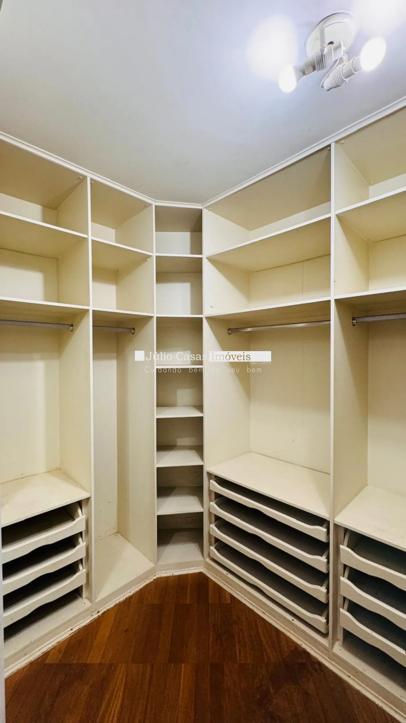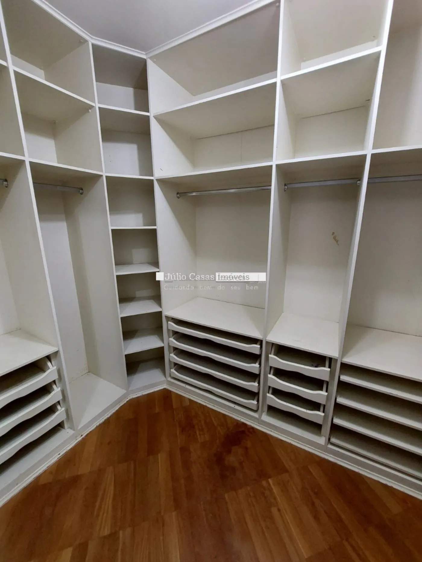 No primeiro pavimento, a casa possui um hall de entrada e uma sala ampla com três ambientes, revestida em piso de madeira. A cozinha é espaçosa e modulada, assim como a área de serviço, que tem saídas para o jardim.