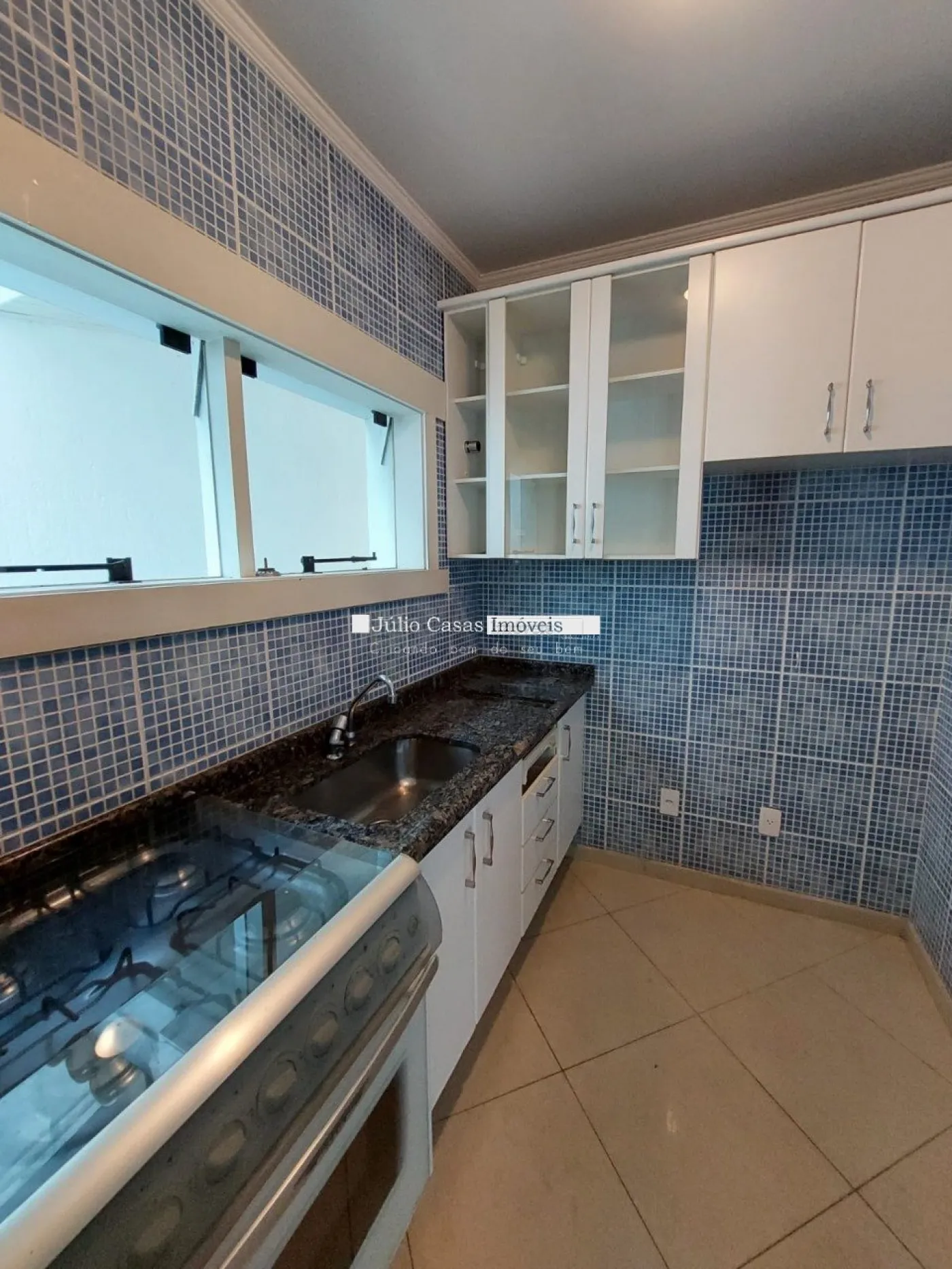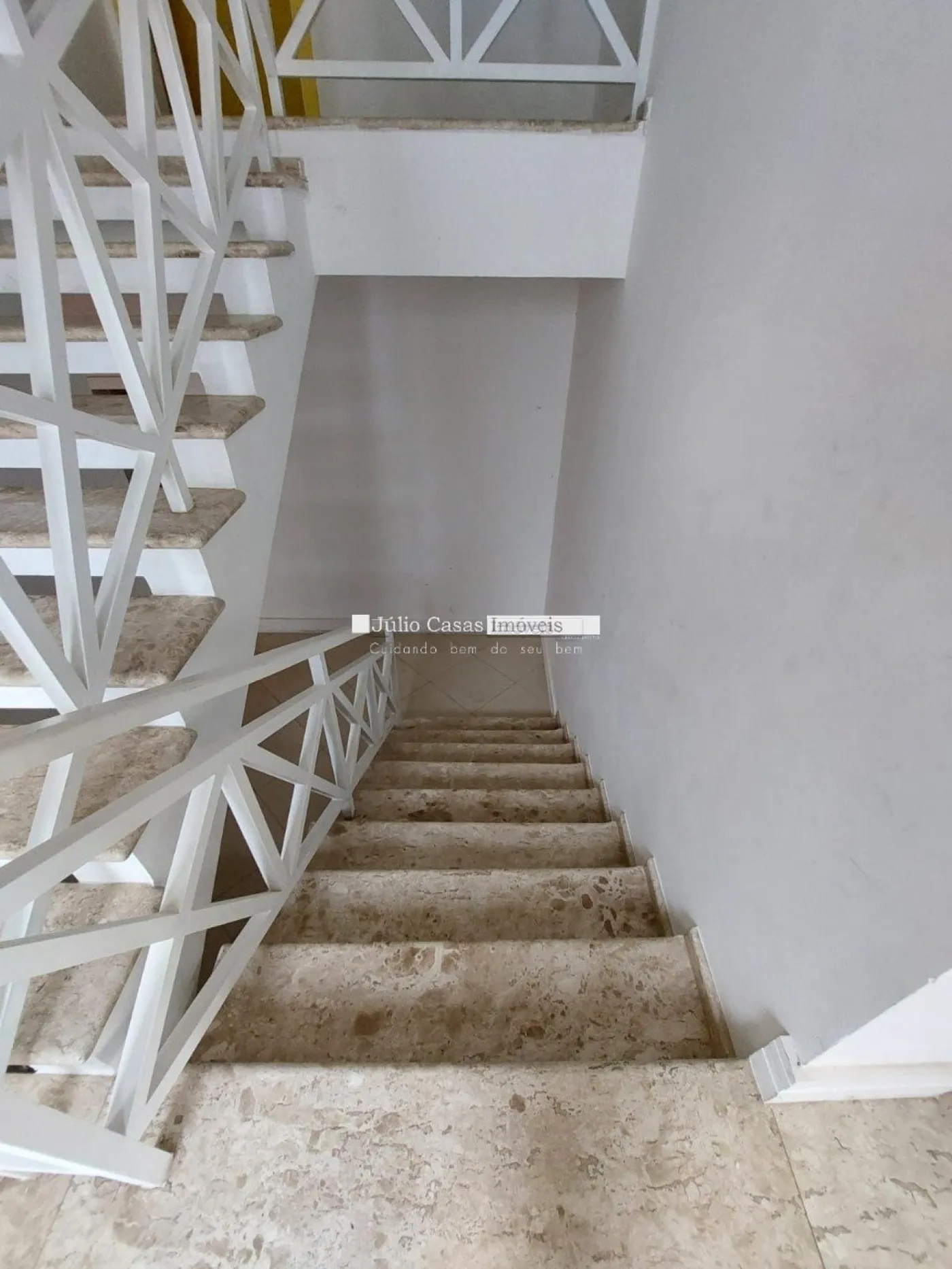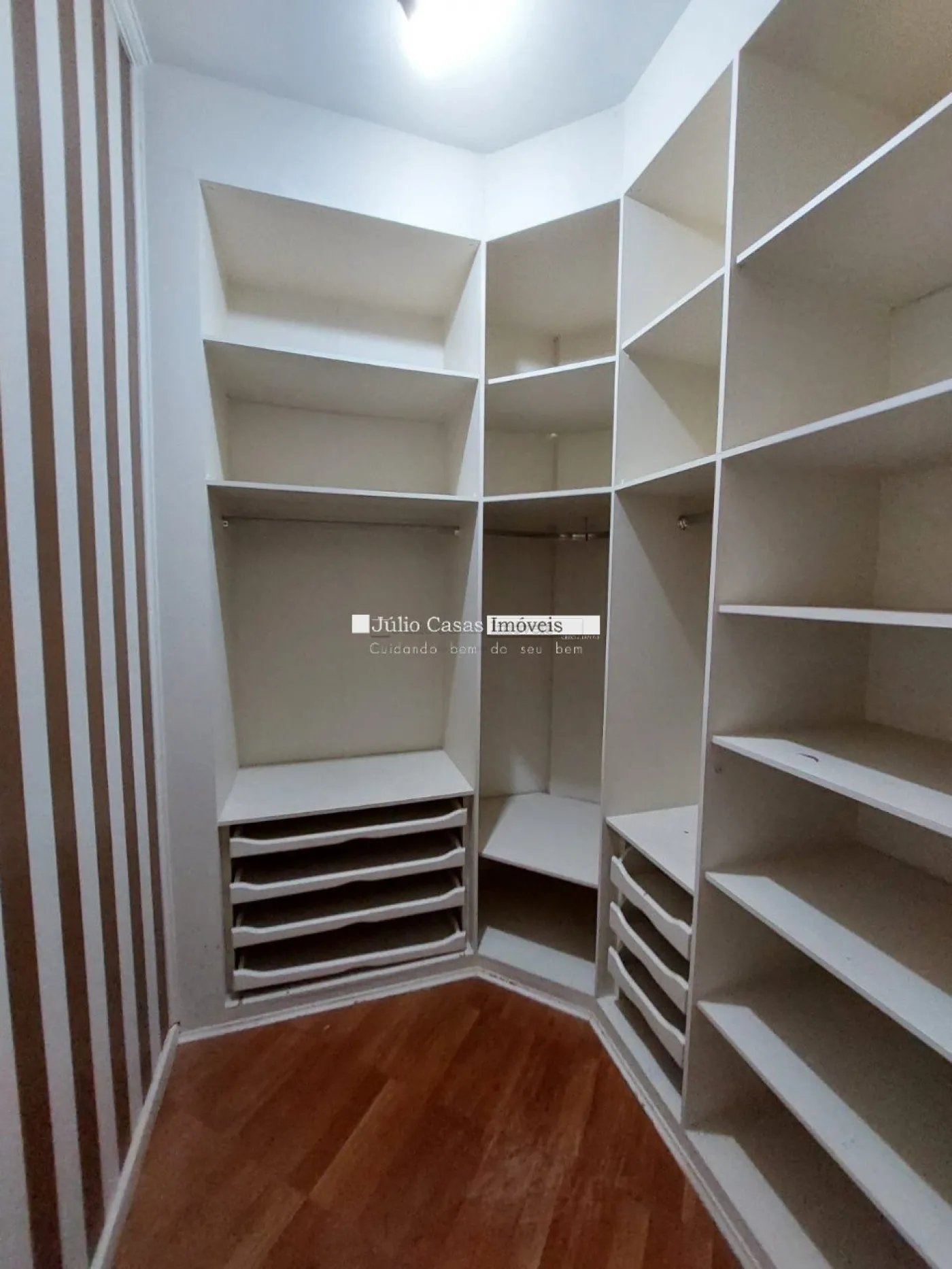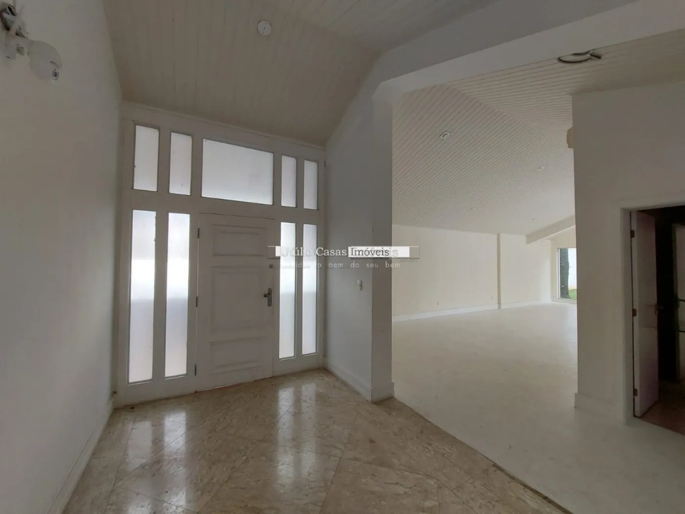 No primeiro pavimento, a casa possui um hall de entrada e uma sala ampla com três ambientes, revestida em piso de madeira. A cozinha é espaçosa e modulada, assim como a área de serviço, que tem saídas para o jardim.