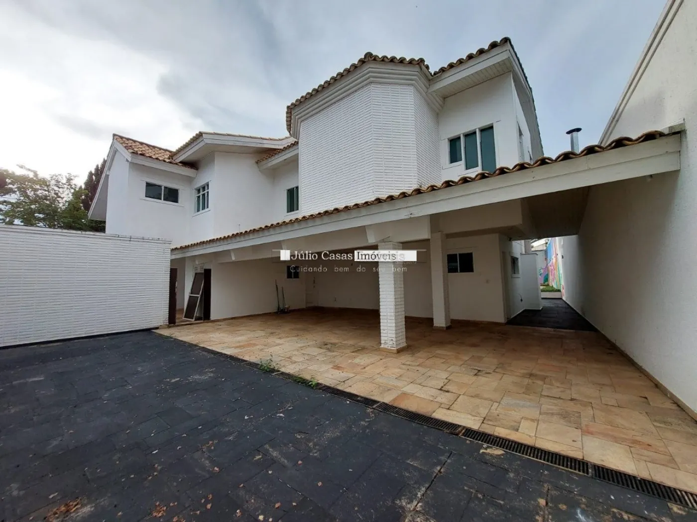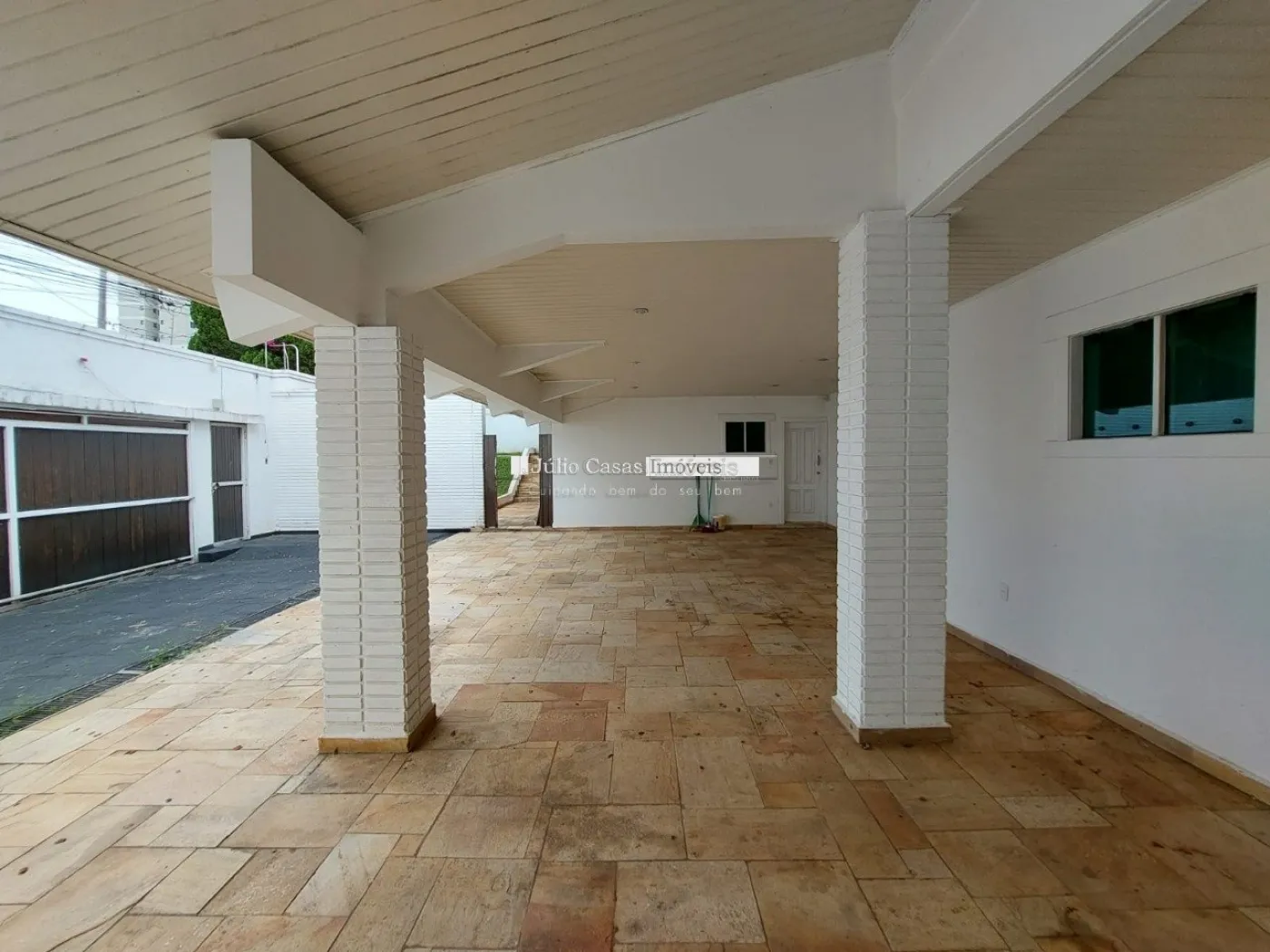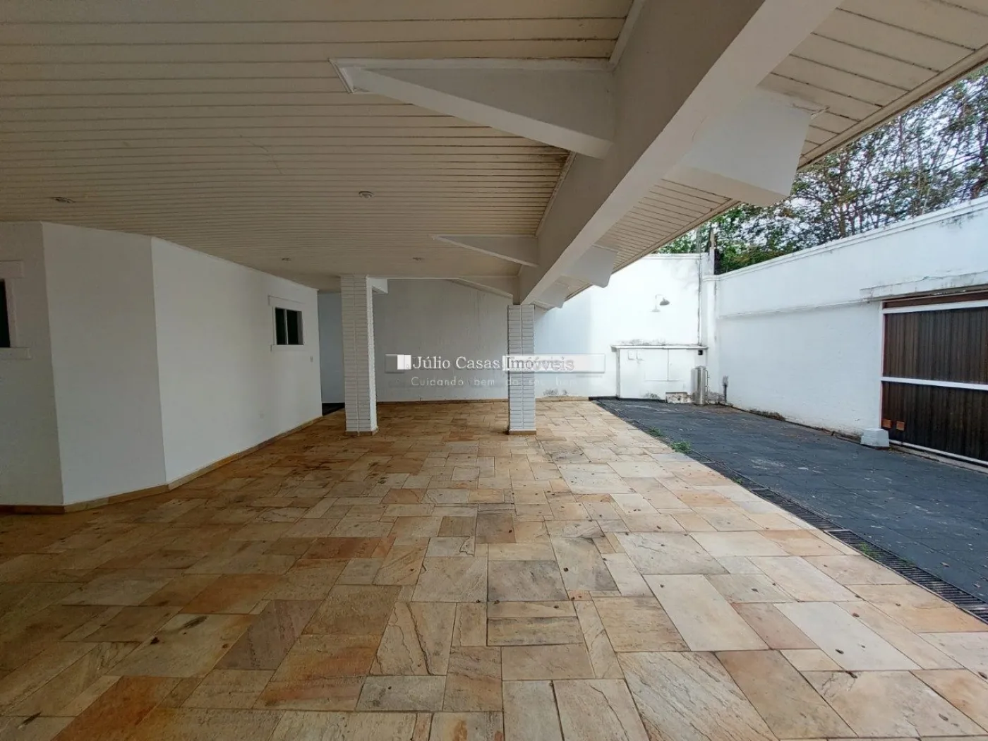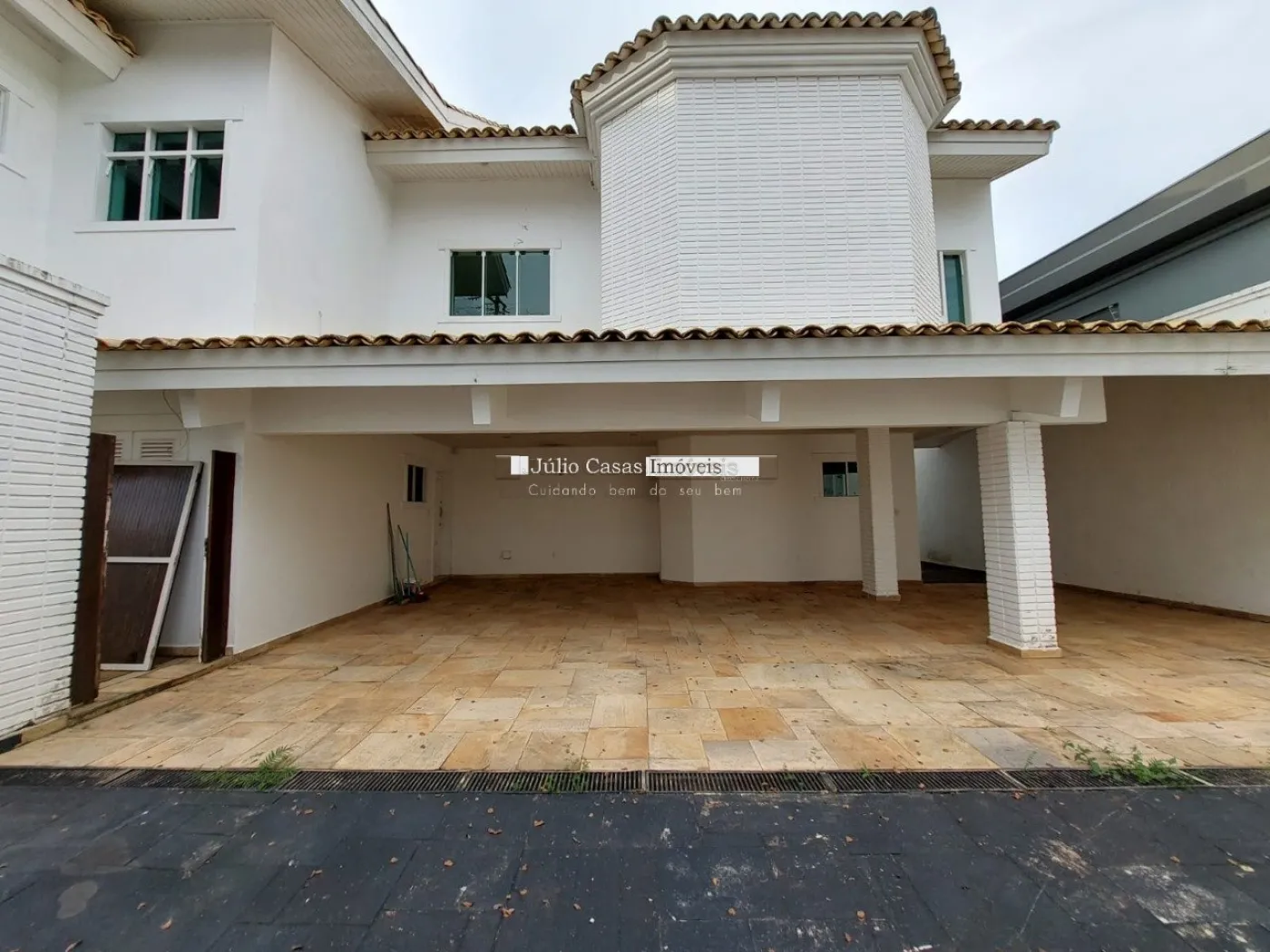 A garagem possui capacidade para seis veículos, com três vagas cobertas e três descobertas.