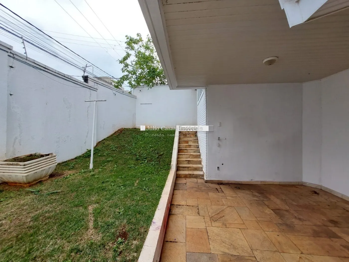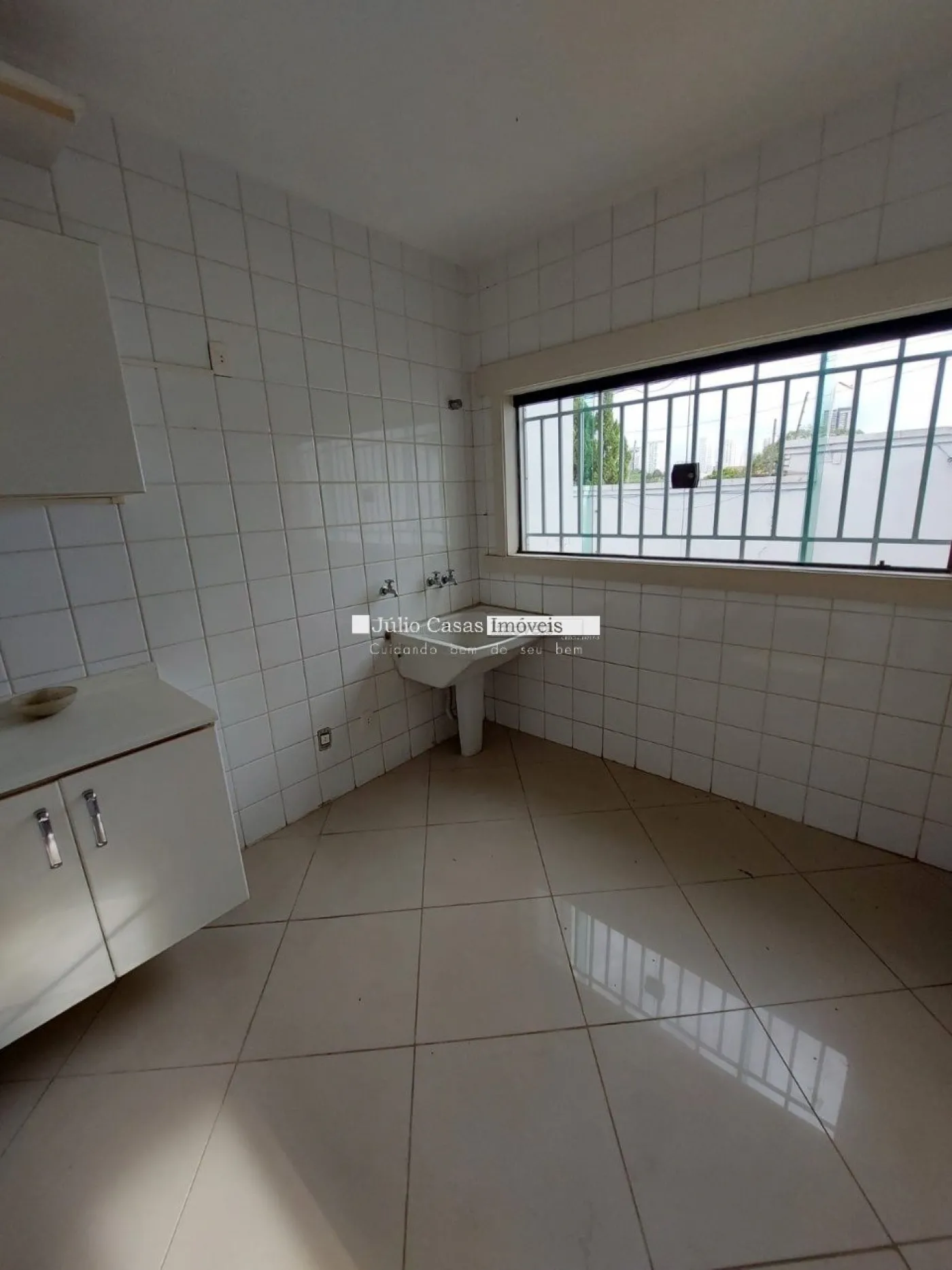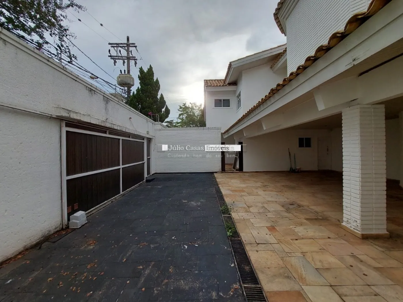 A garagem possui capacidade para seis veículos, com três vagas cobertas e três descobertas.