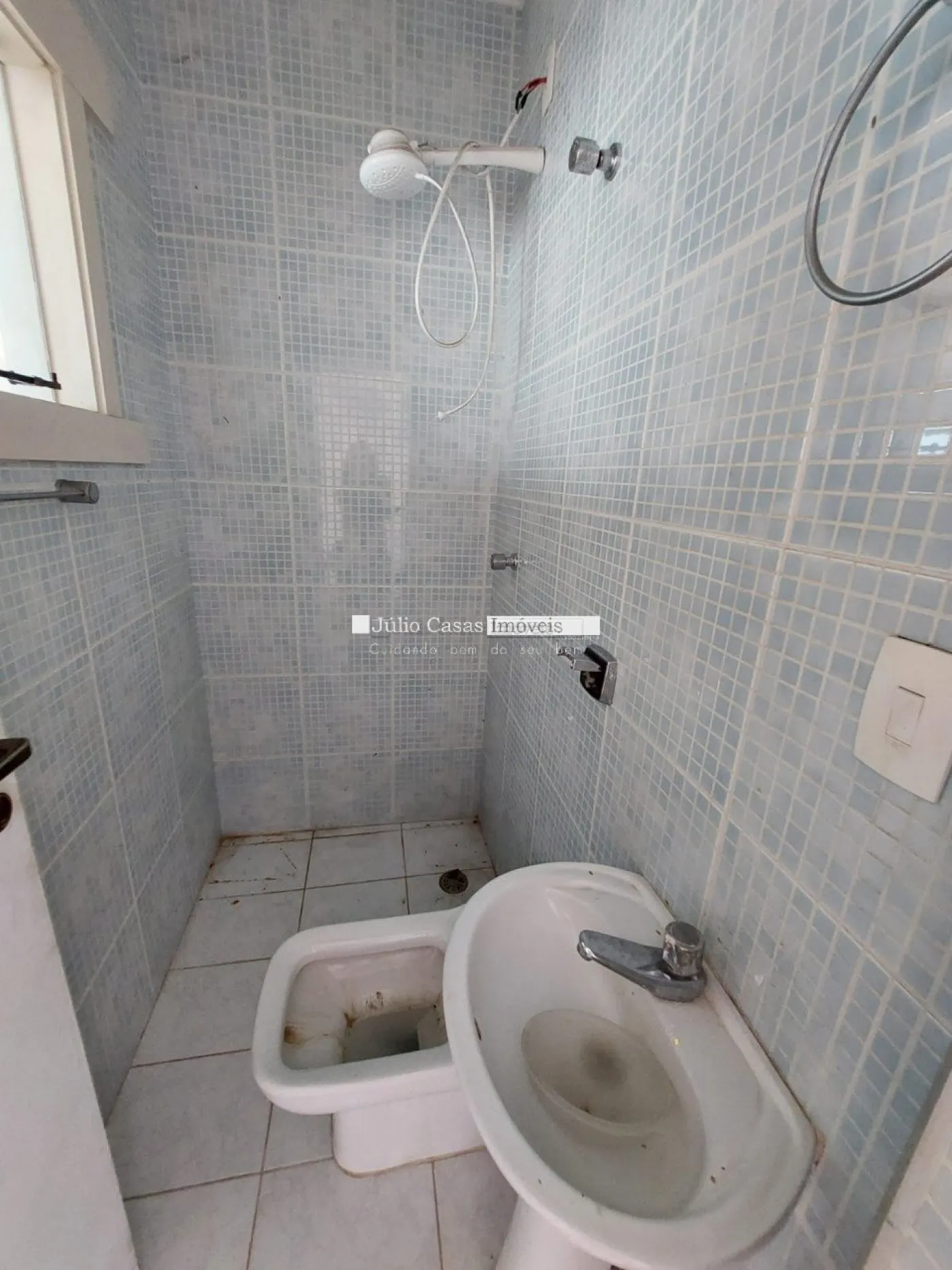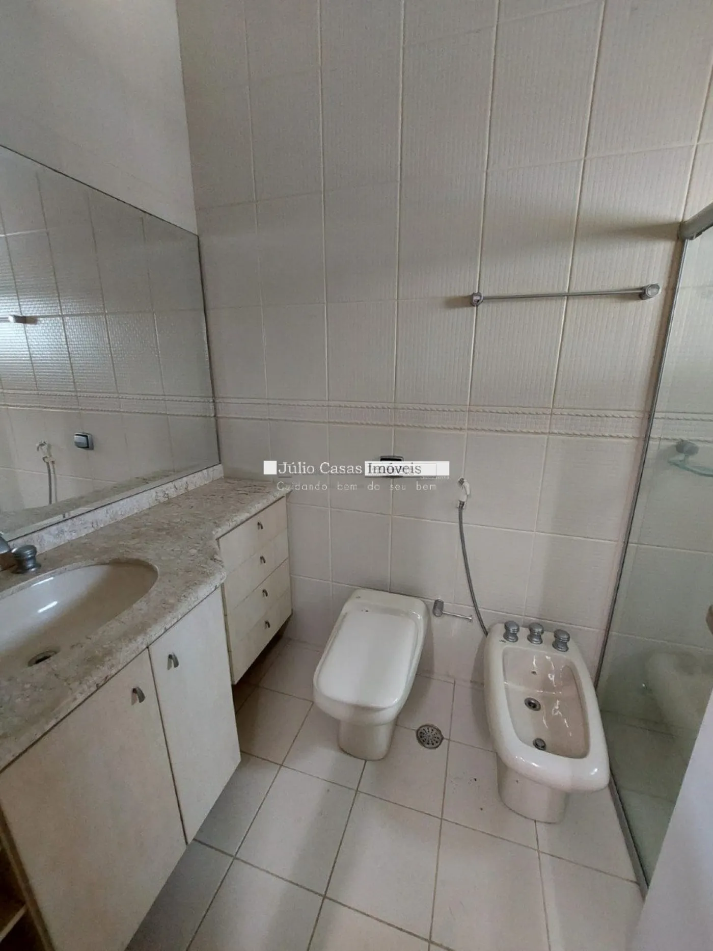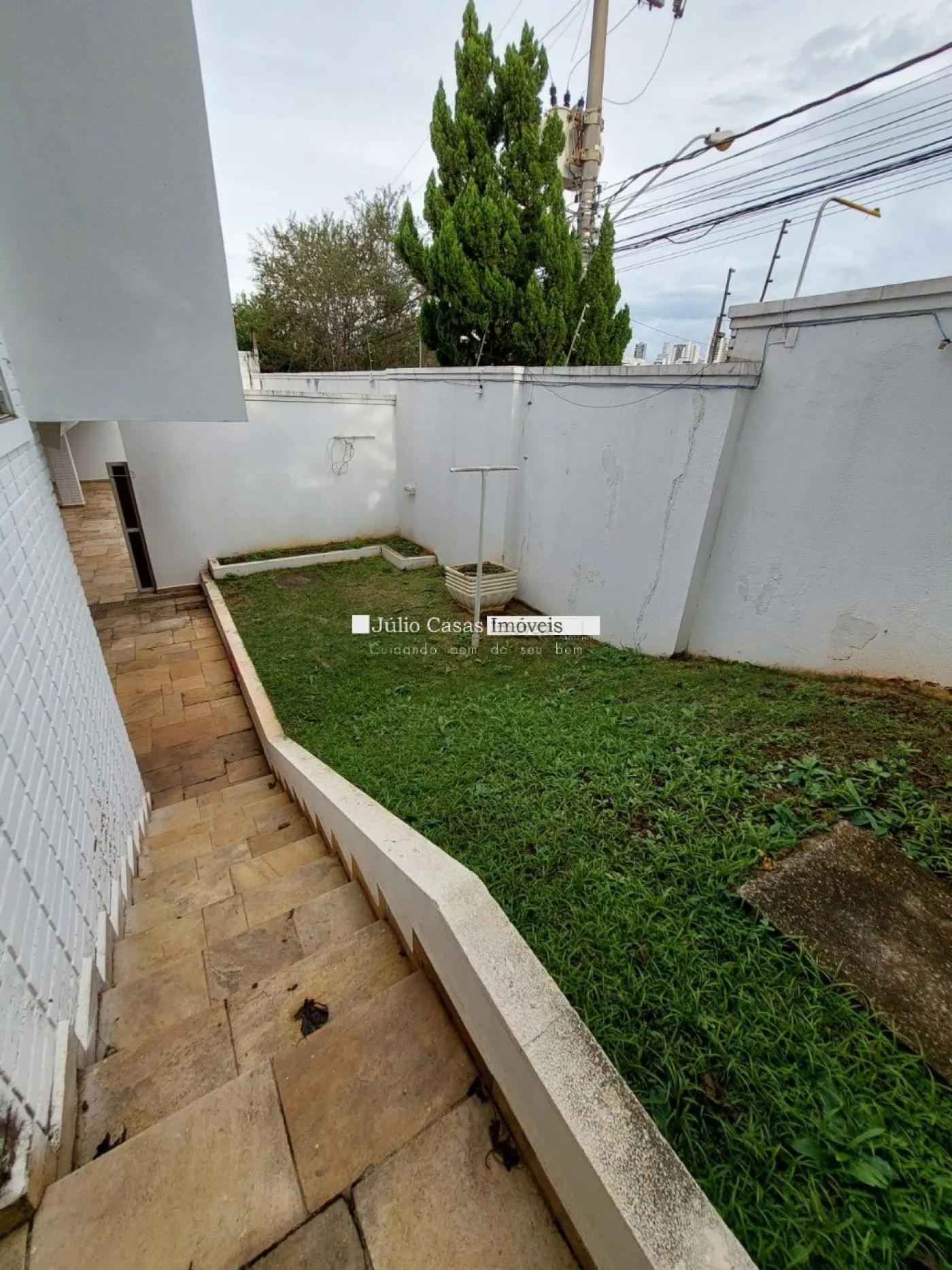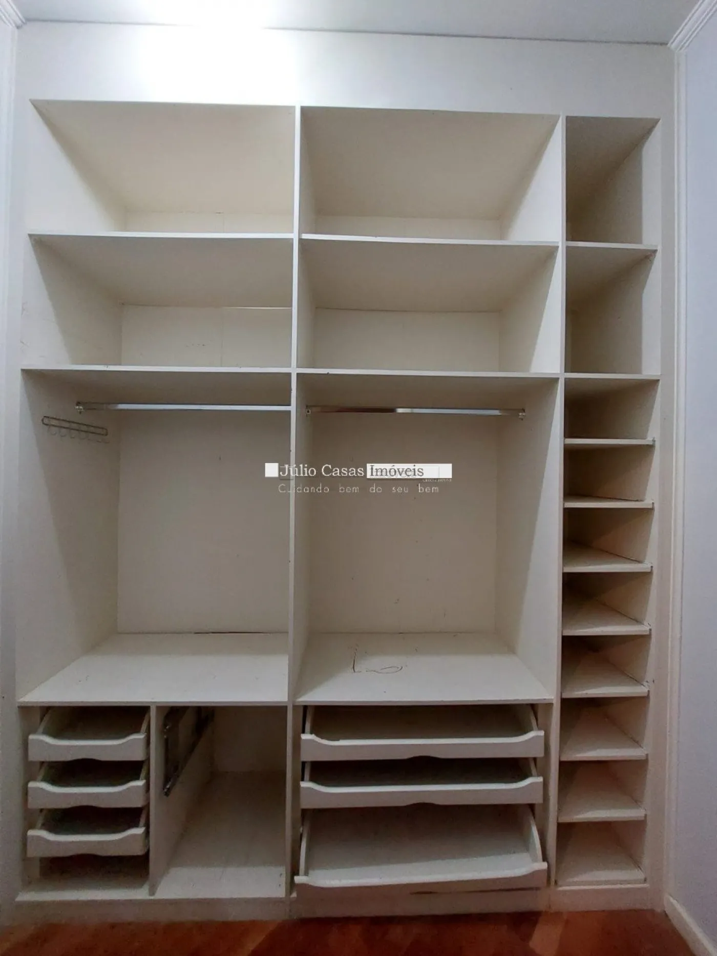A garagem possui capacidade para seis veículos, com três vagas cobertas e três descobertas.