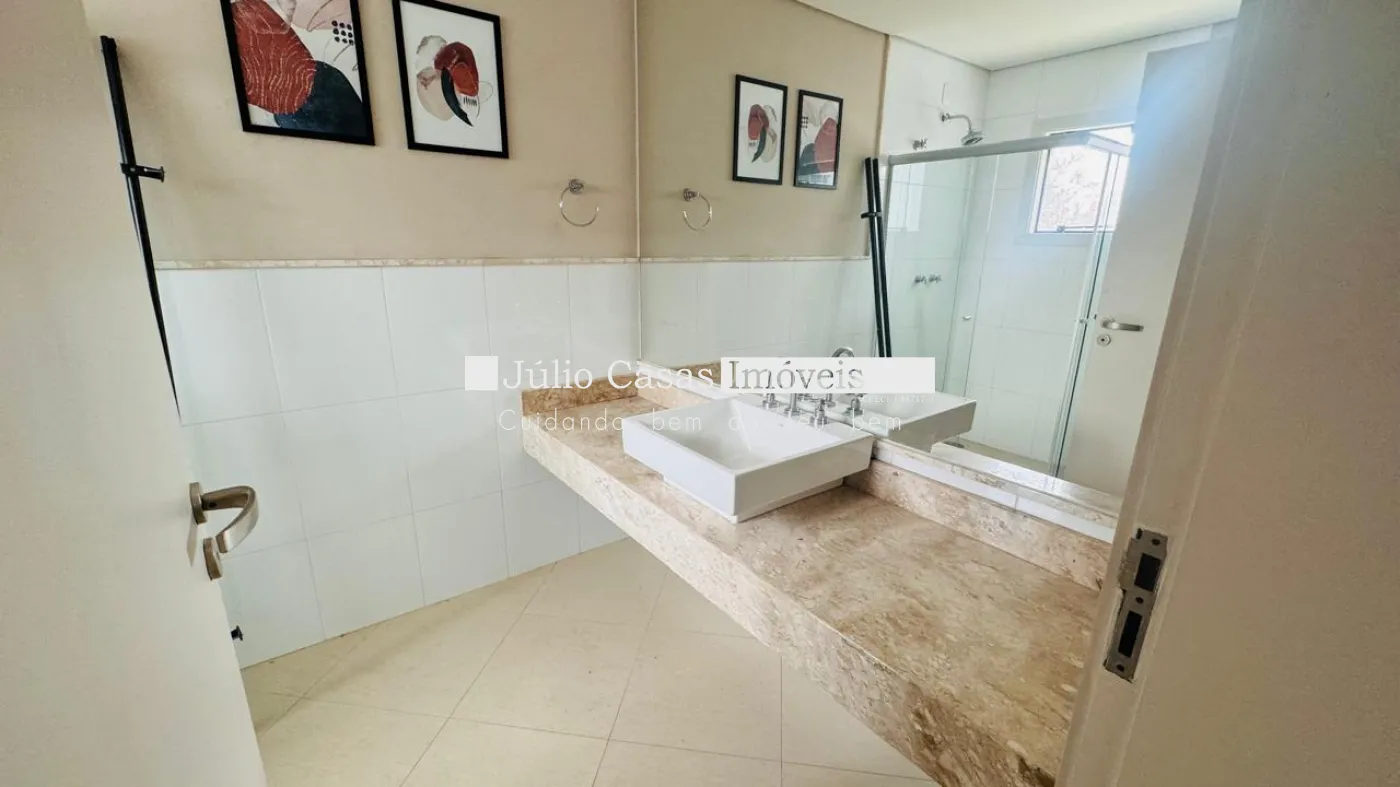 No segundo pavimento, estão localizadas quatro suítes, todas com closet, sendo uma delas a suíte máster. Um hall entre os dormitórios oferece um espaço de circulação adicional. A casa é equipada com cerca elétrica, sistema de alarme em todas as portas de saída e monitoramento por câmeras, garantindo segurança e tranquilidade.