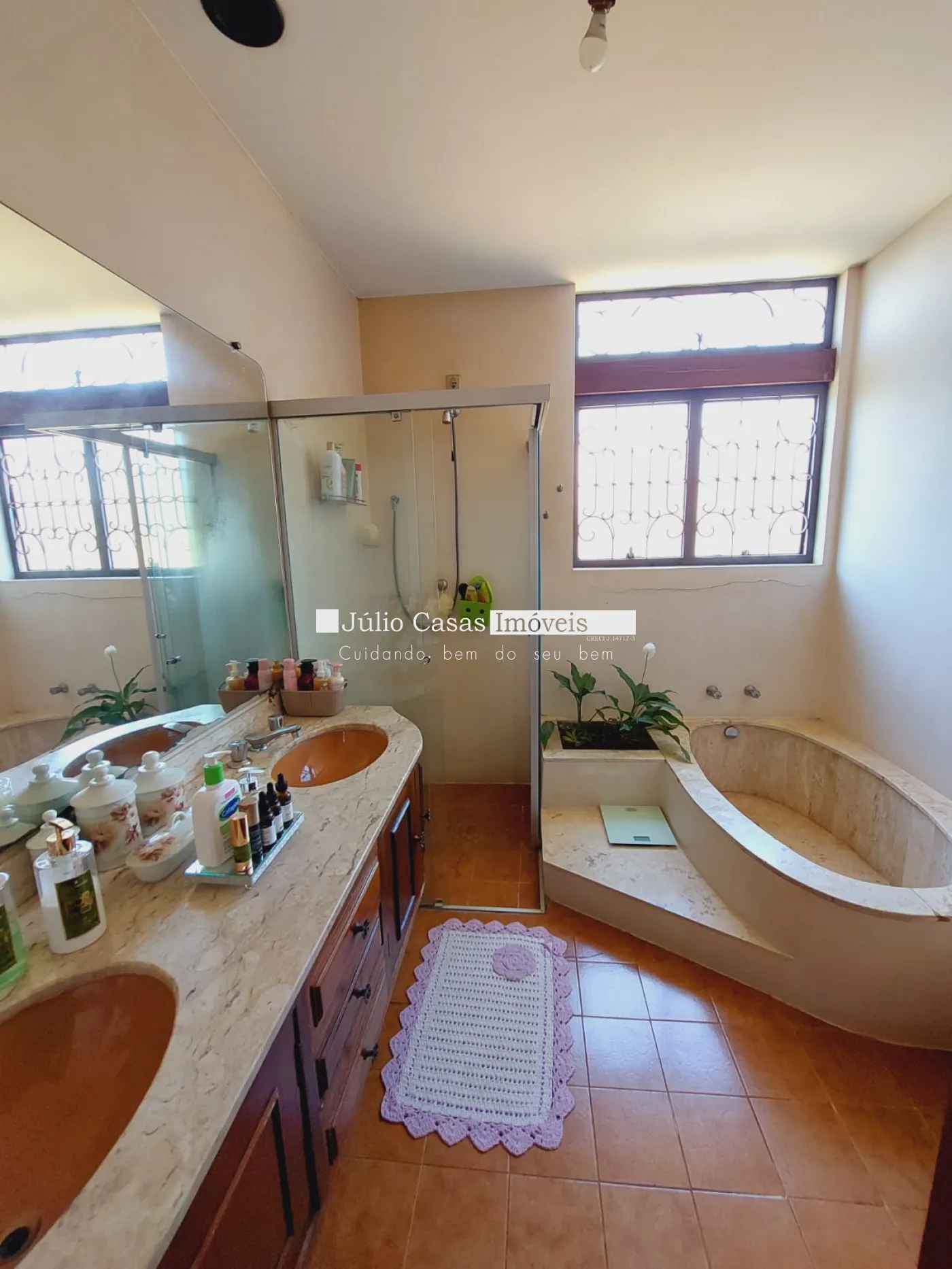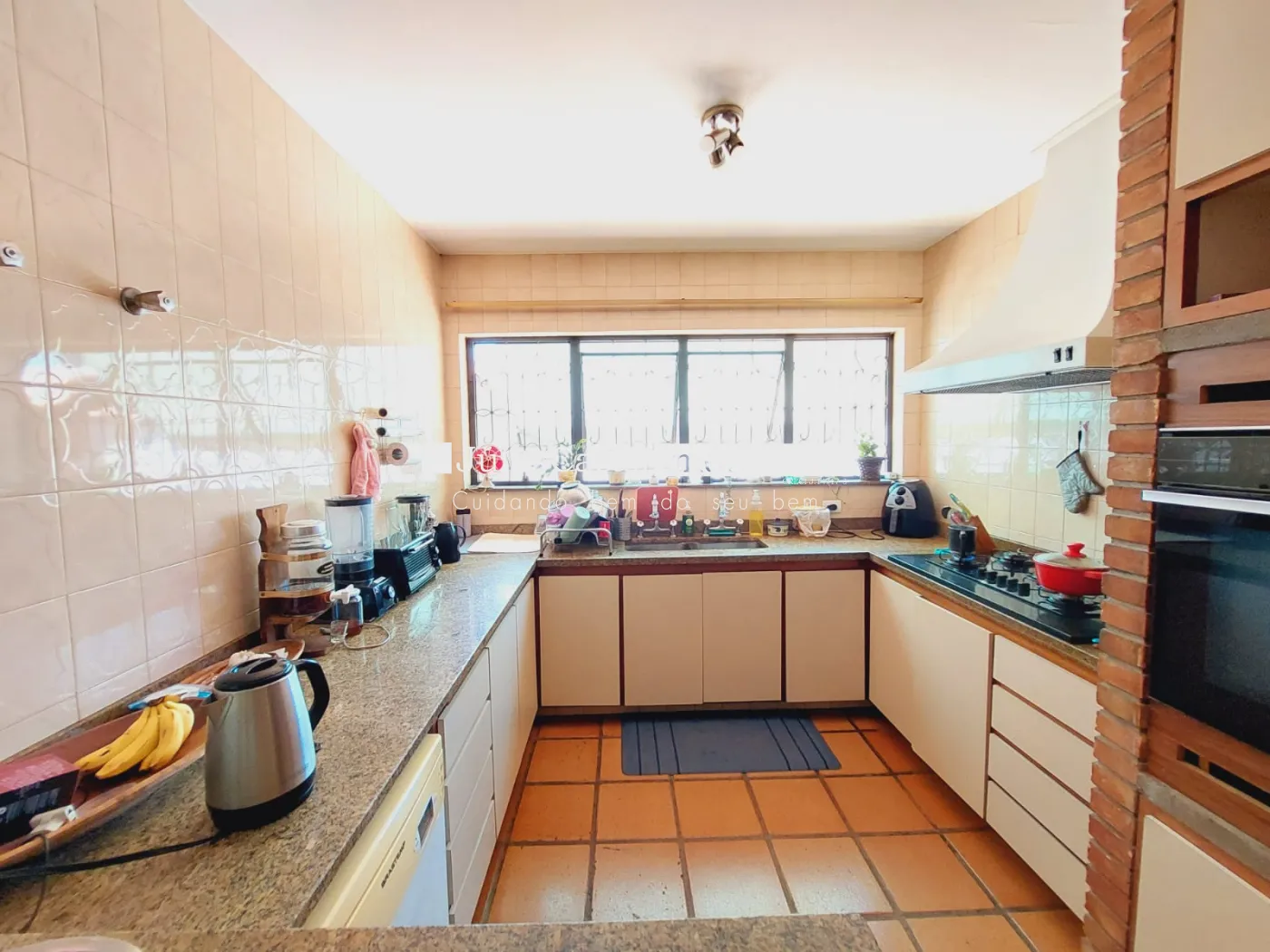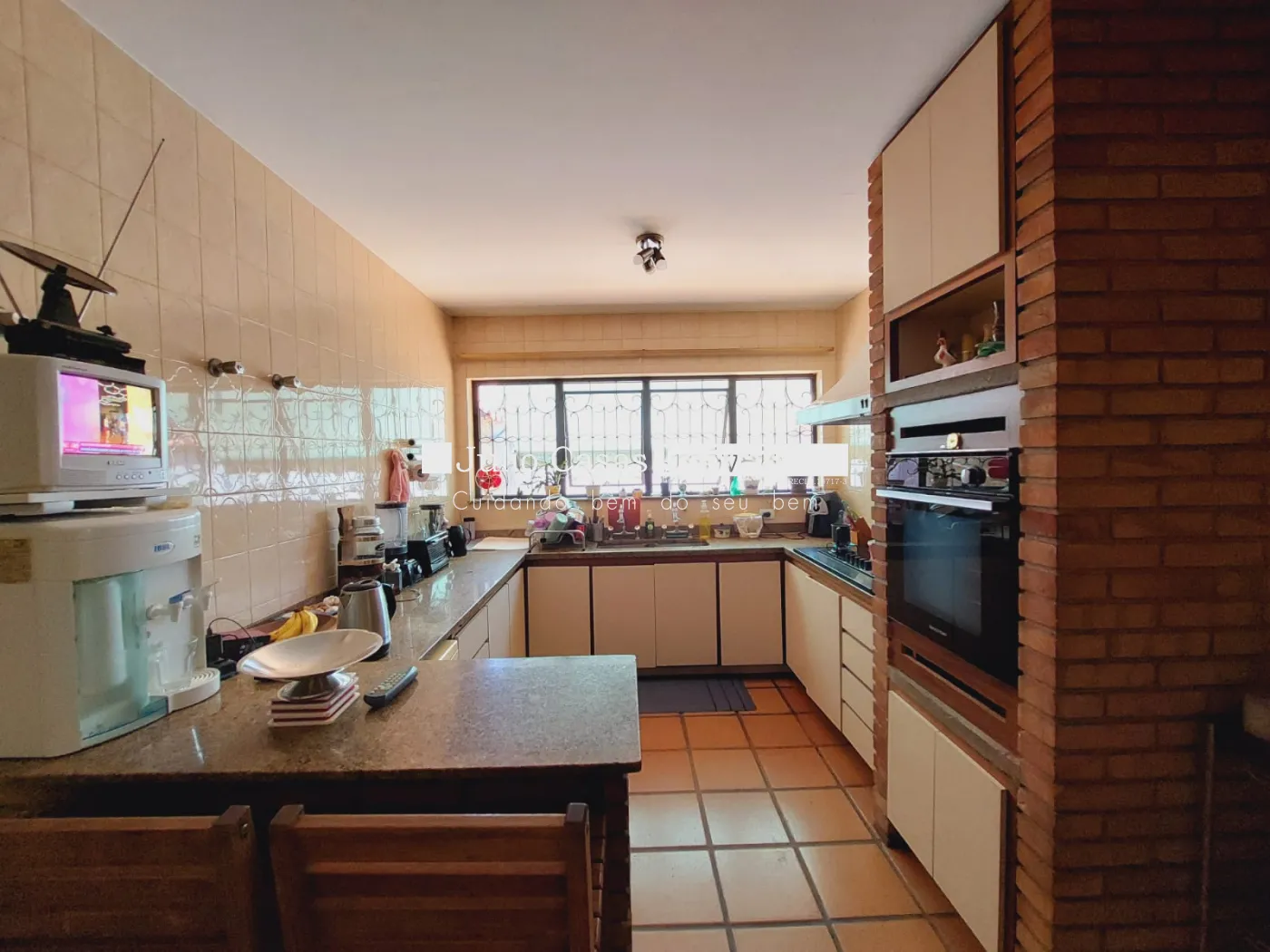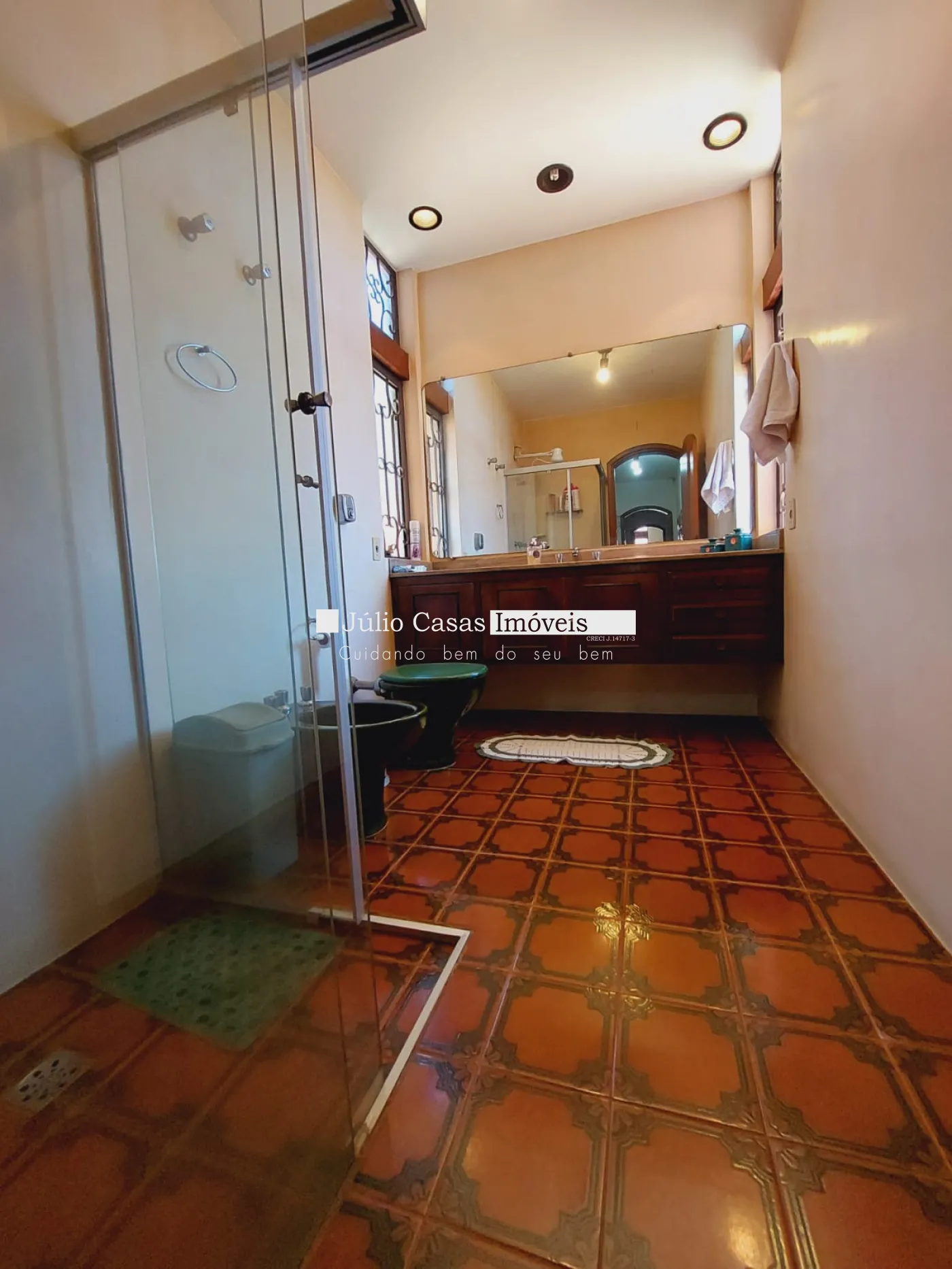 lavabo, cozinha com armários e despensa, sala de almoço, banheiros grandes com armários, espelho e box em vidro.