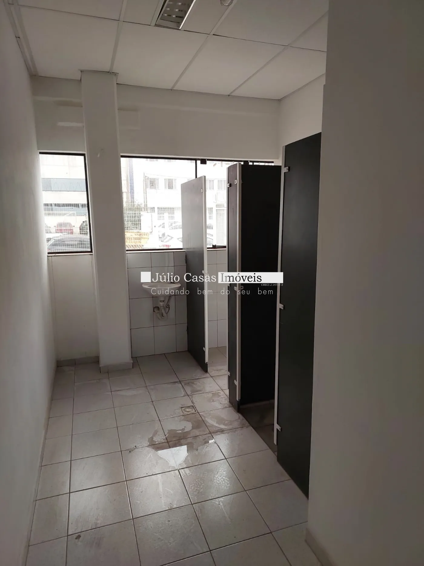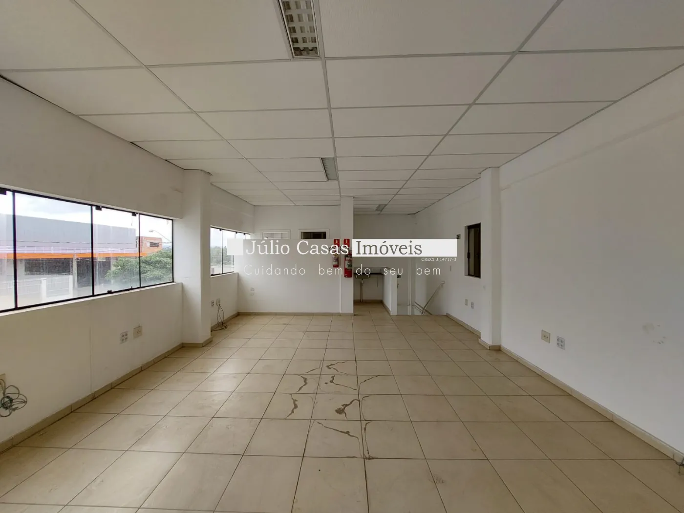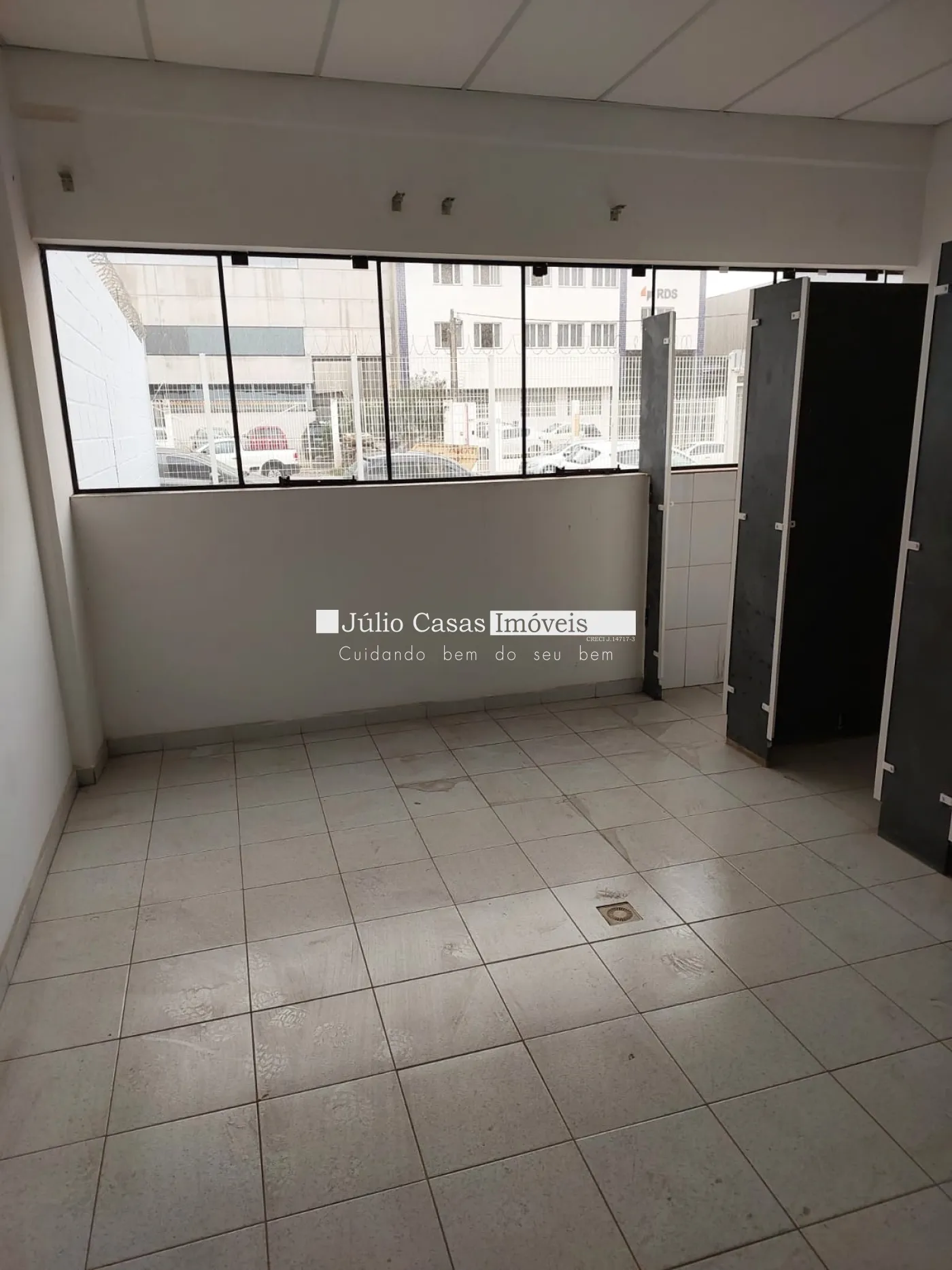 Amplo escritório com piso em porcelanato e estrutura de apoio: vestiários