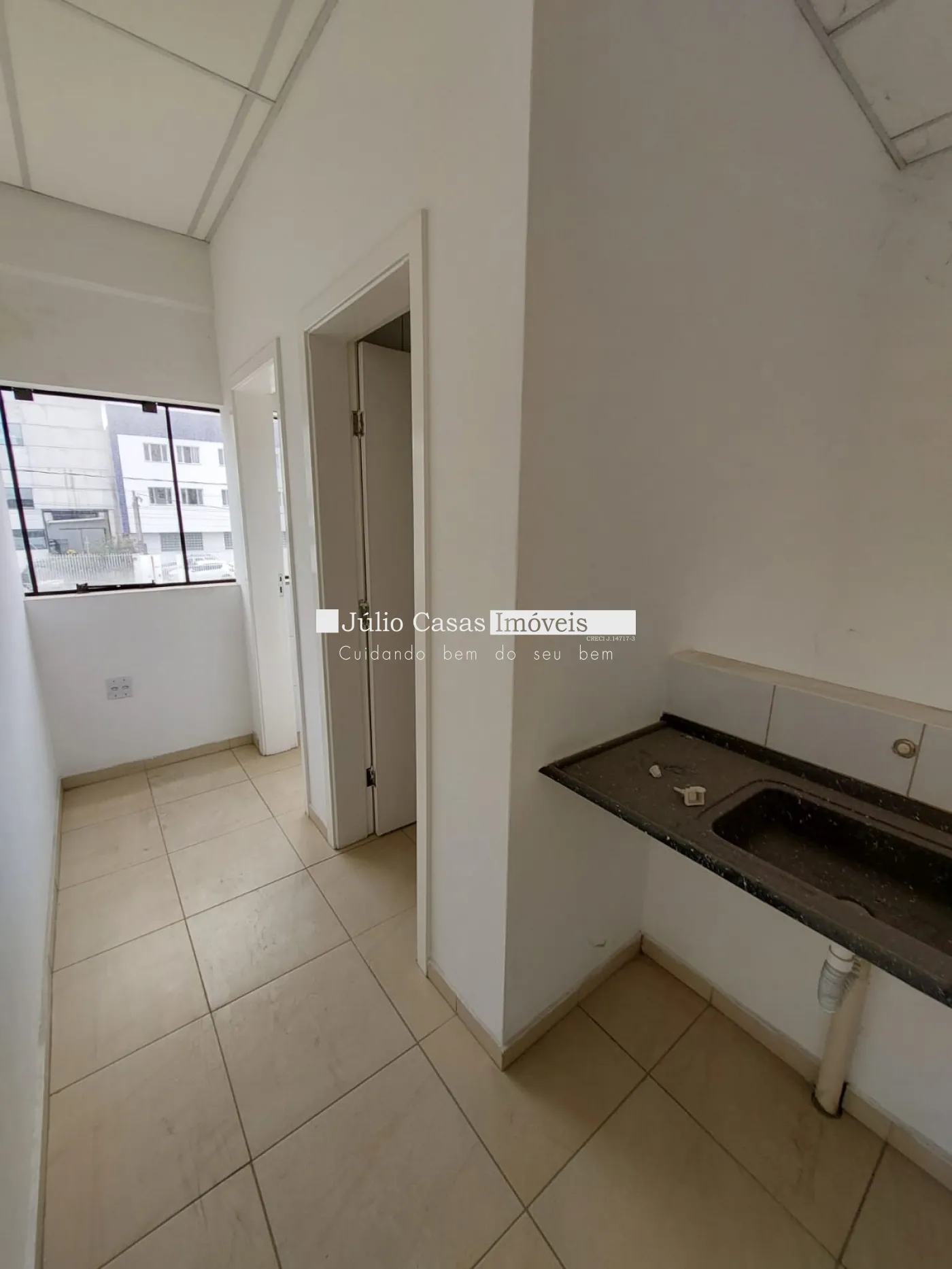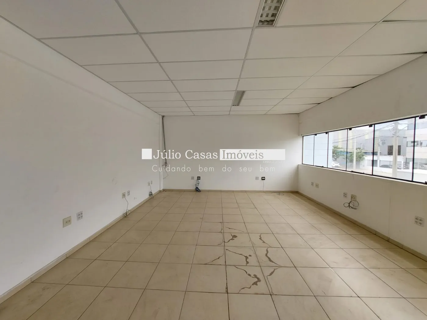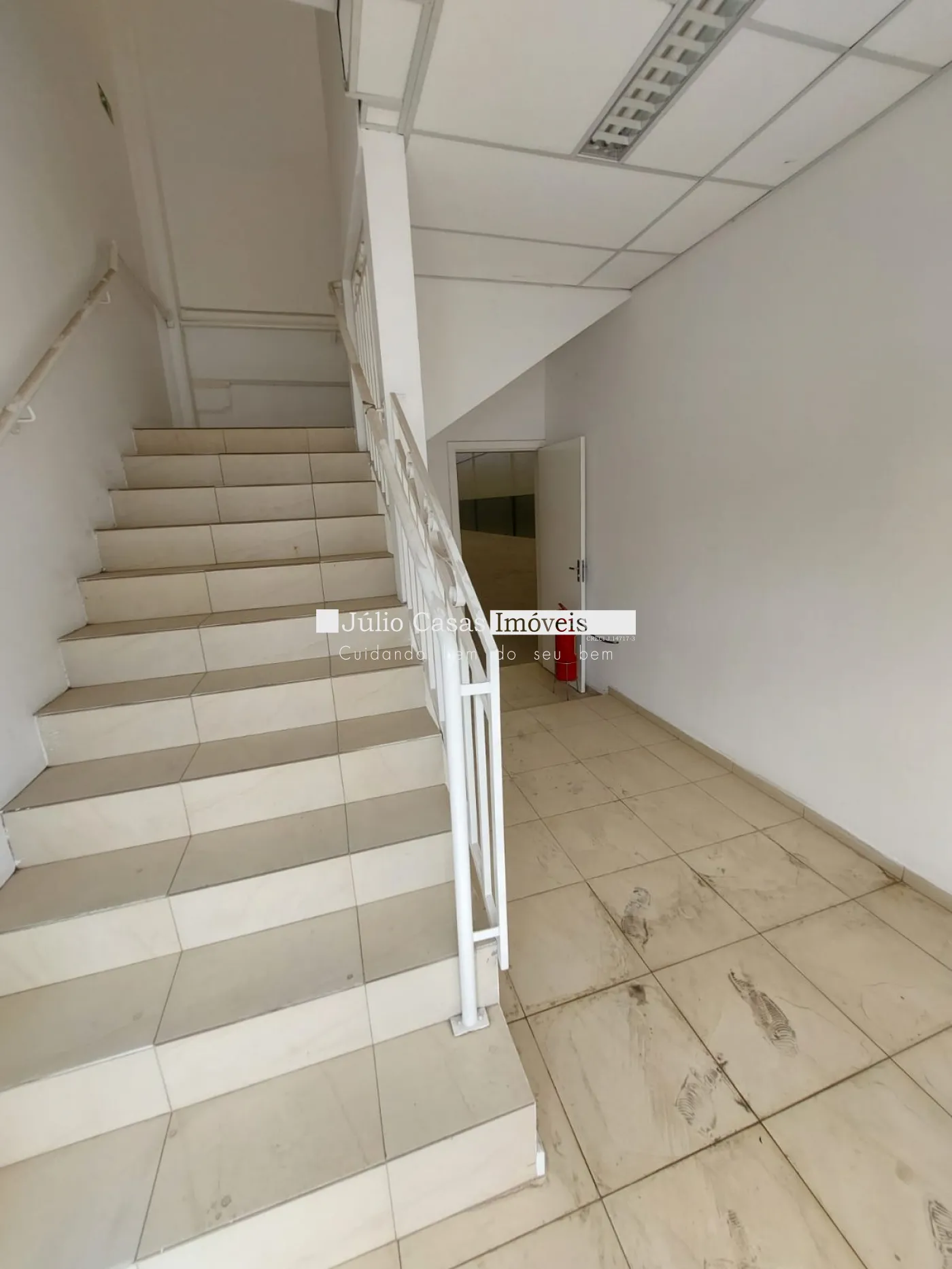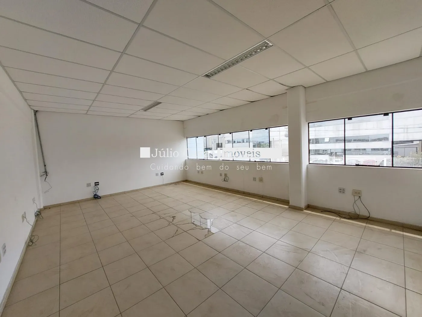 Amplo escritório com piso em porcelanato e estrutura de apoio: vestiários