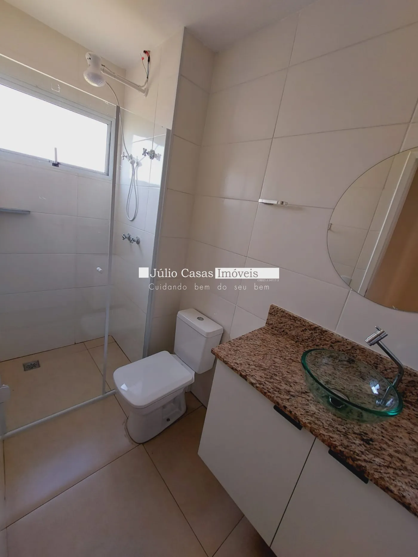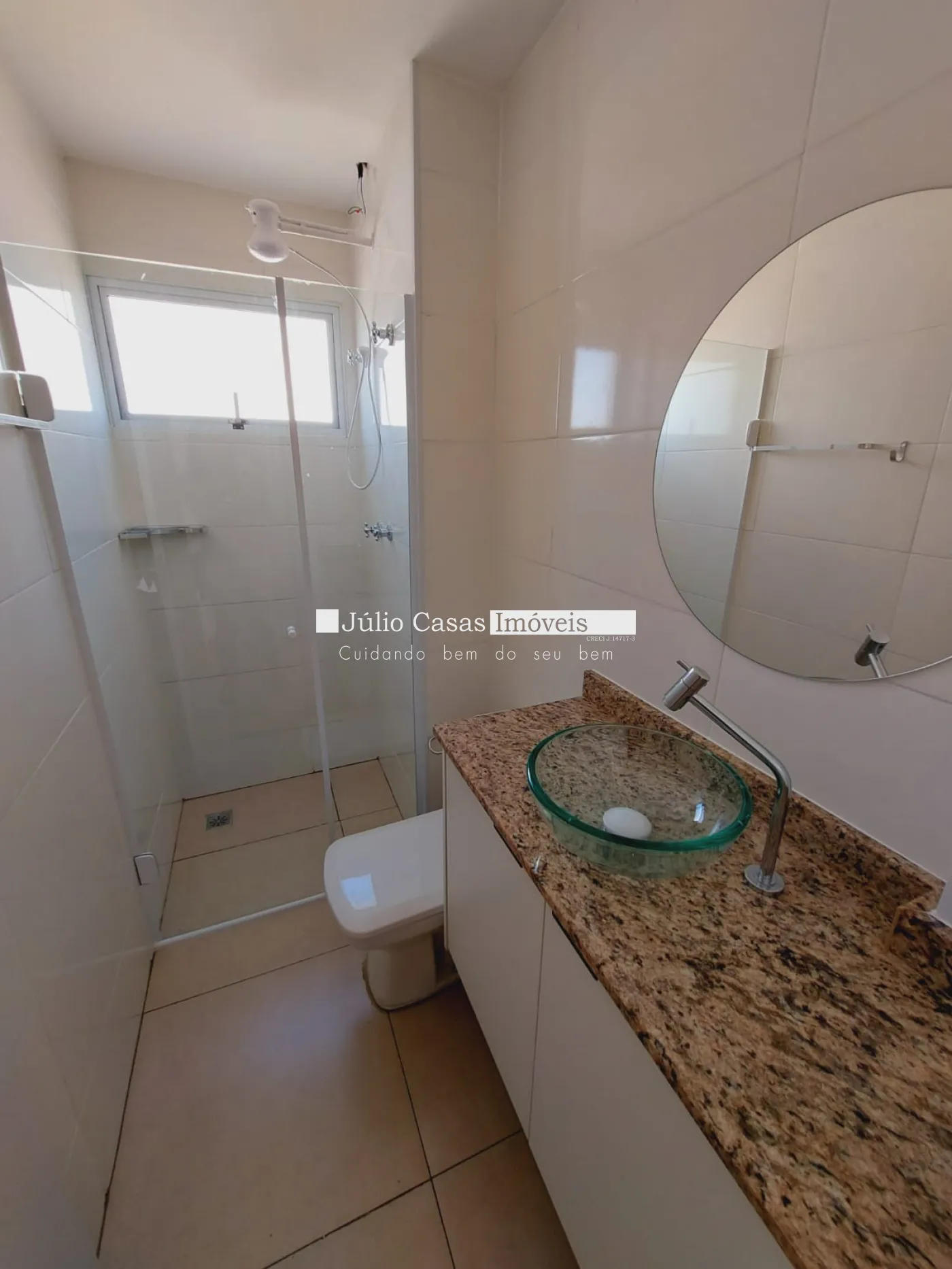 O piso é em porcelanato, e os banheiros possuem gabinete, pia em granito, cuba sobreposta e box em vidro temperado.