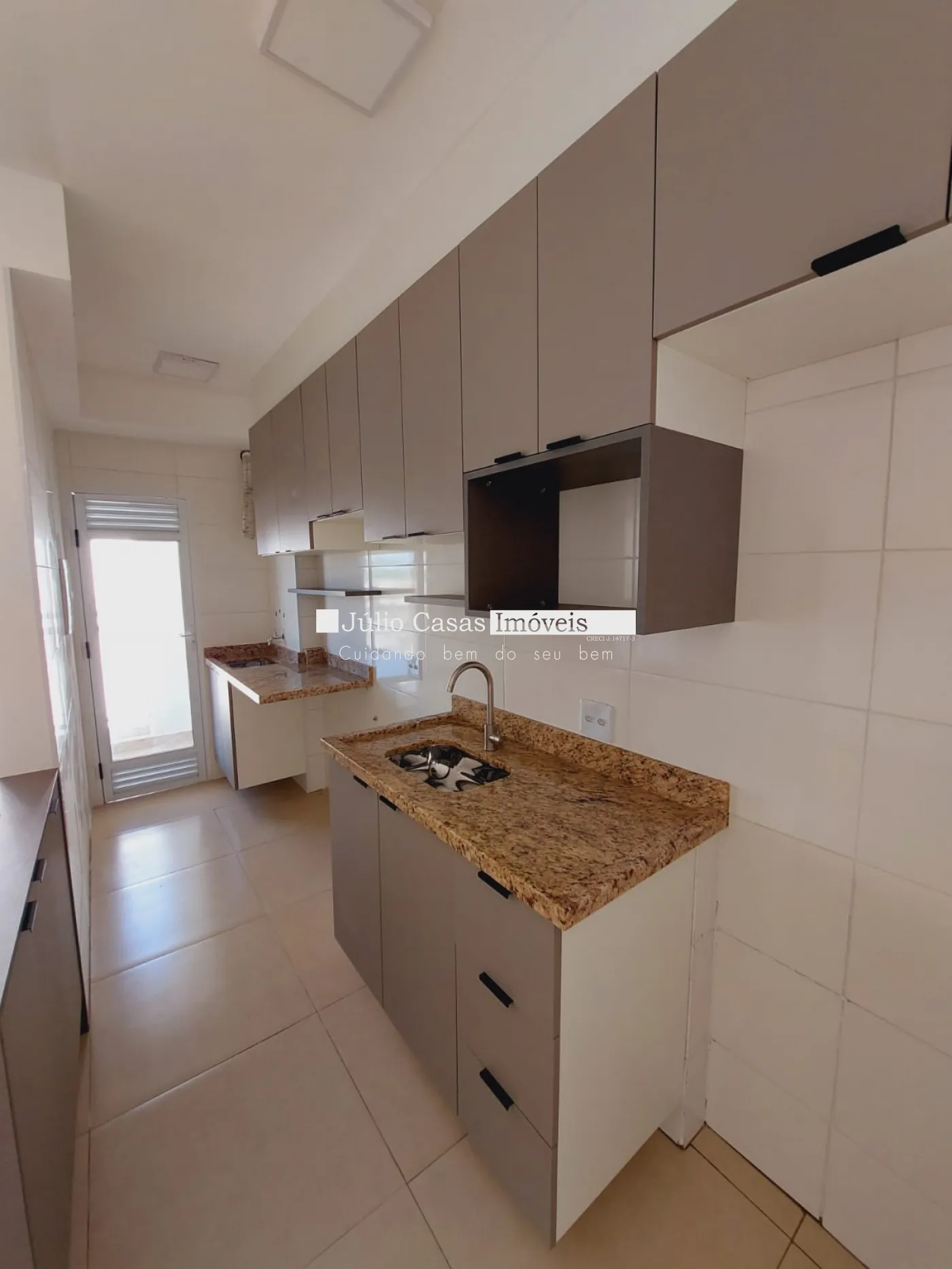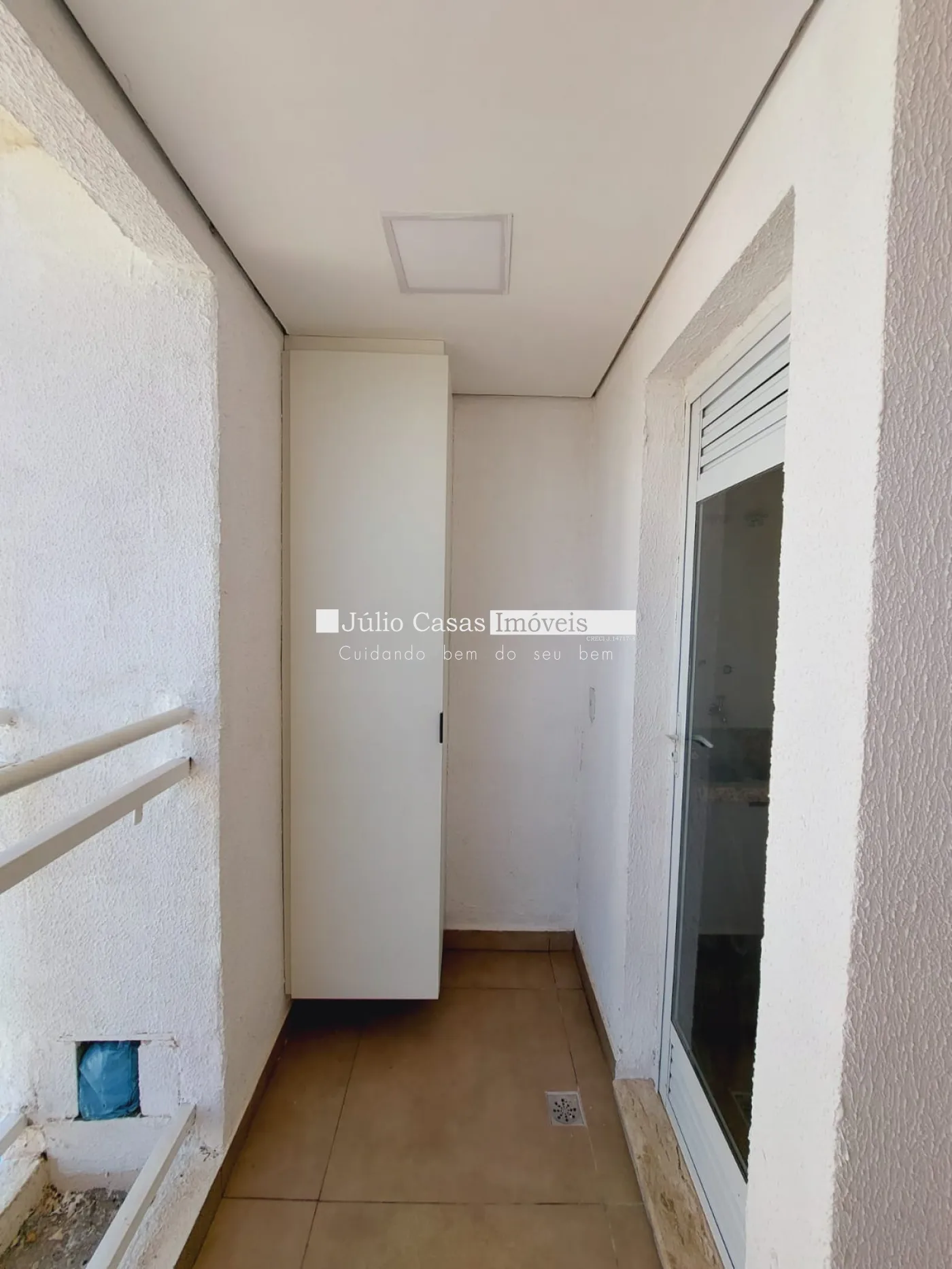 Apartamento com sala ampla e cozinha integrada com armários planejados, área de serviço com armários