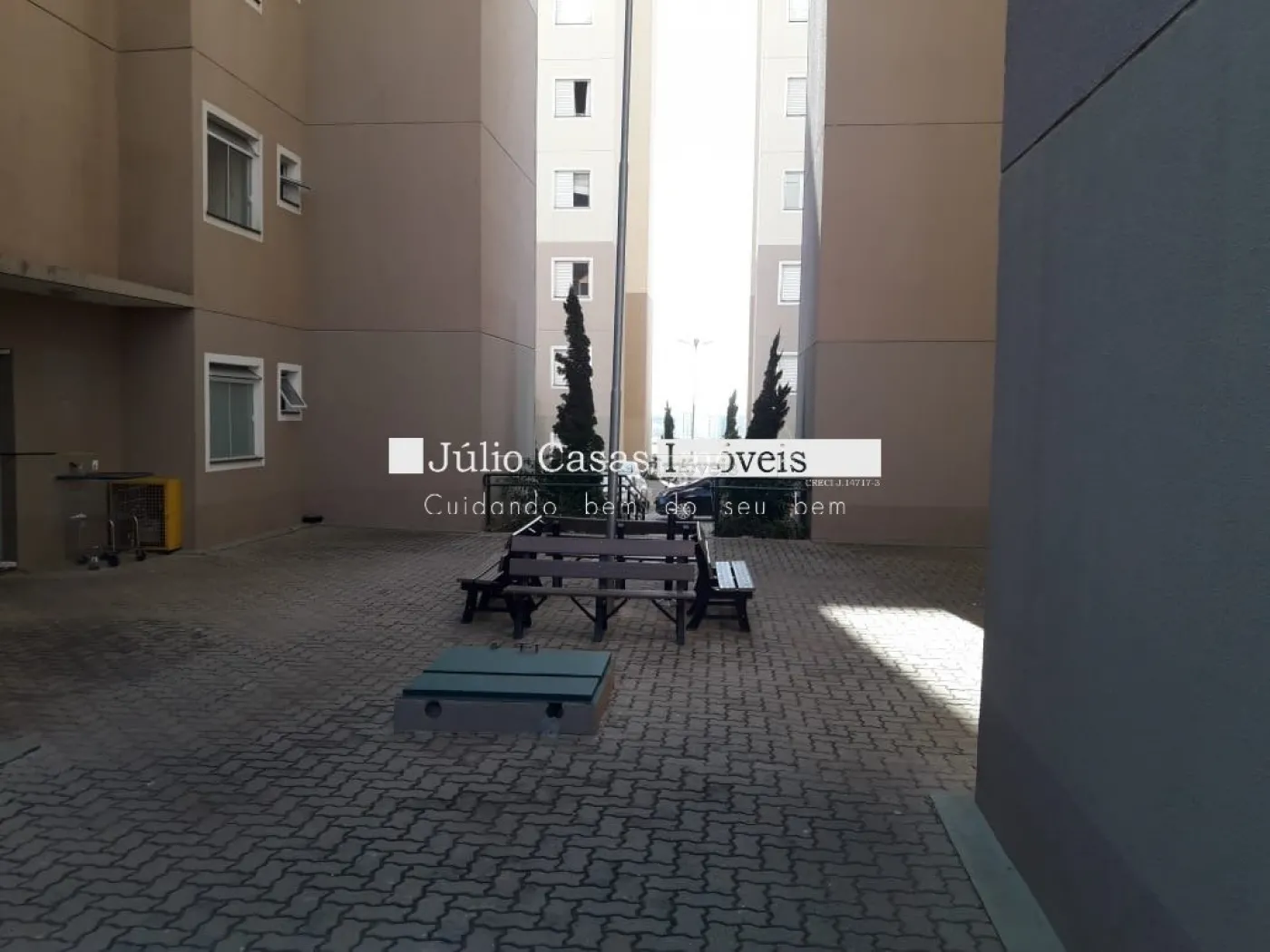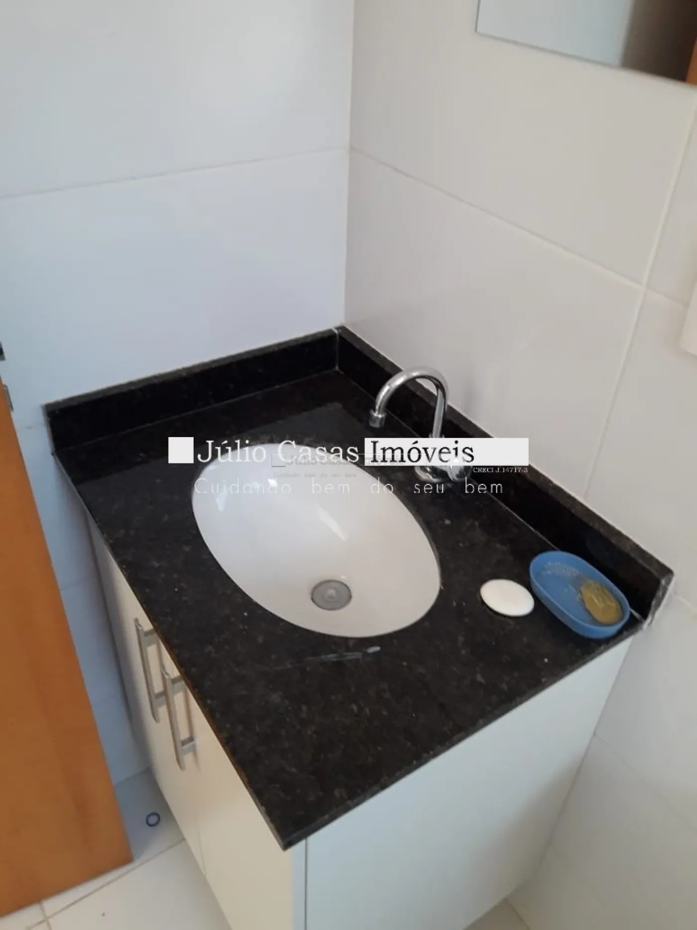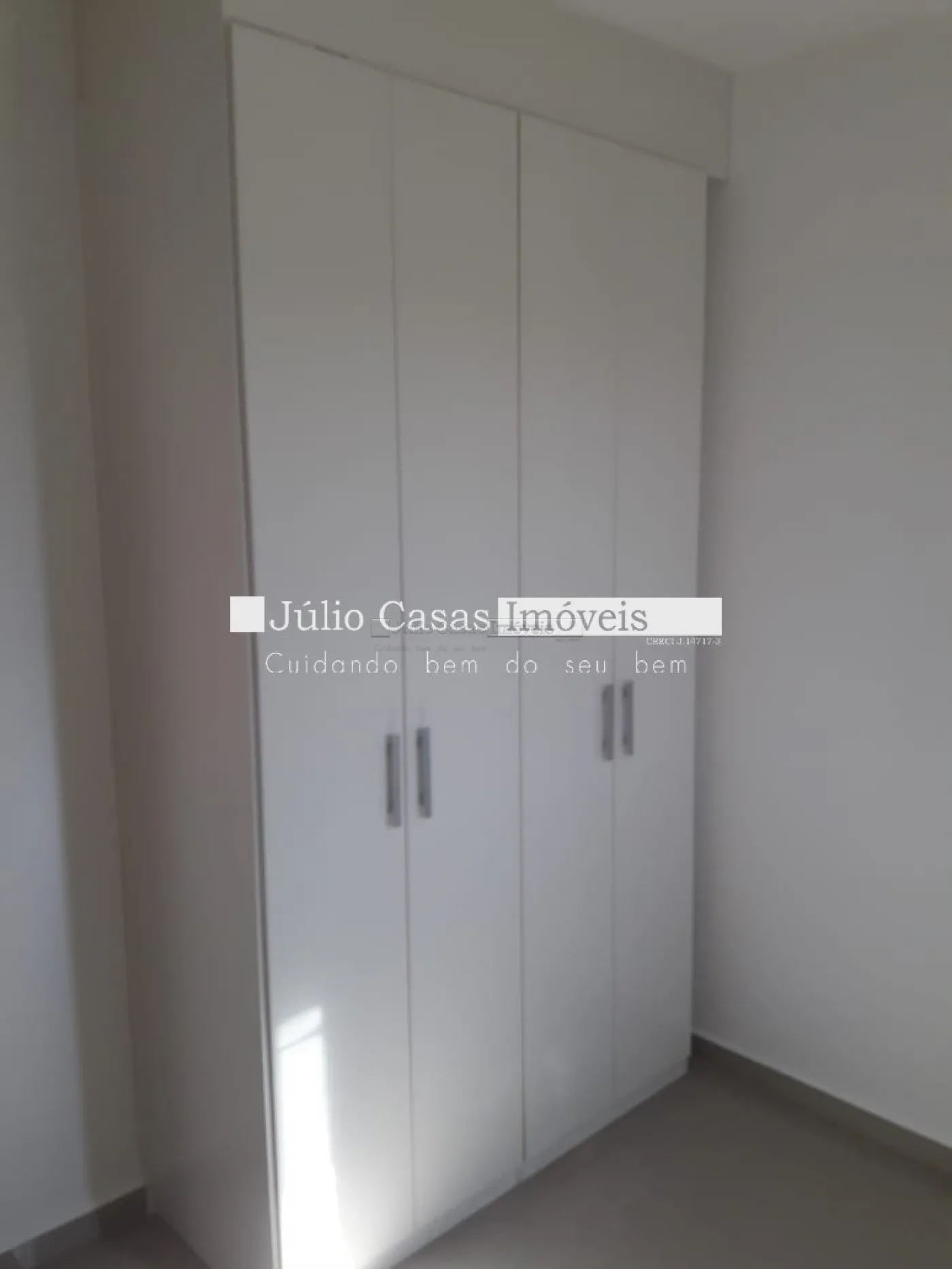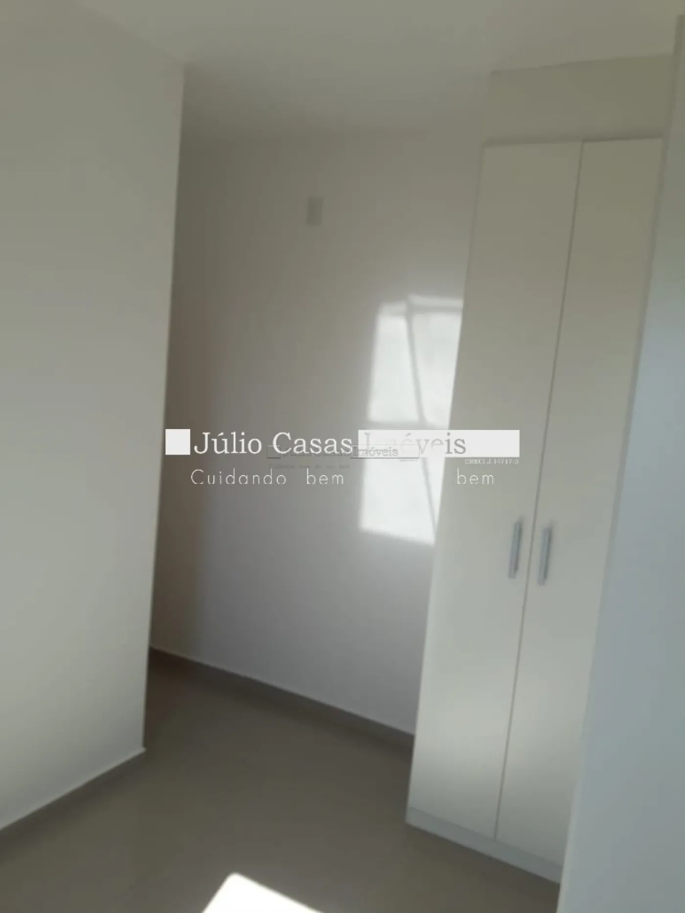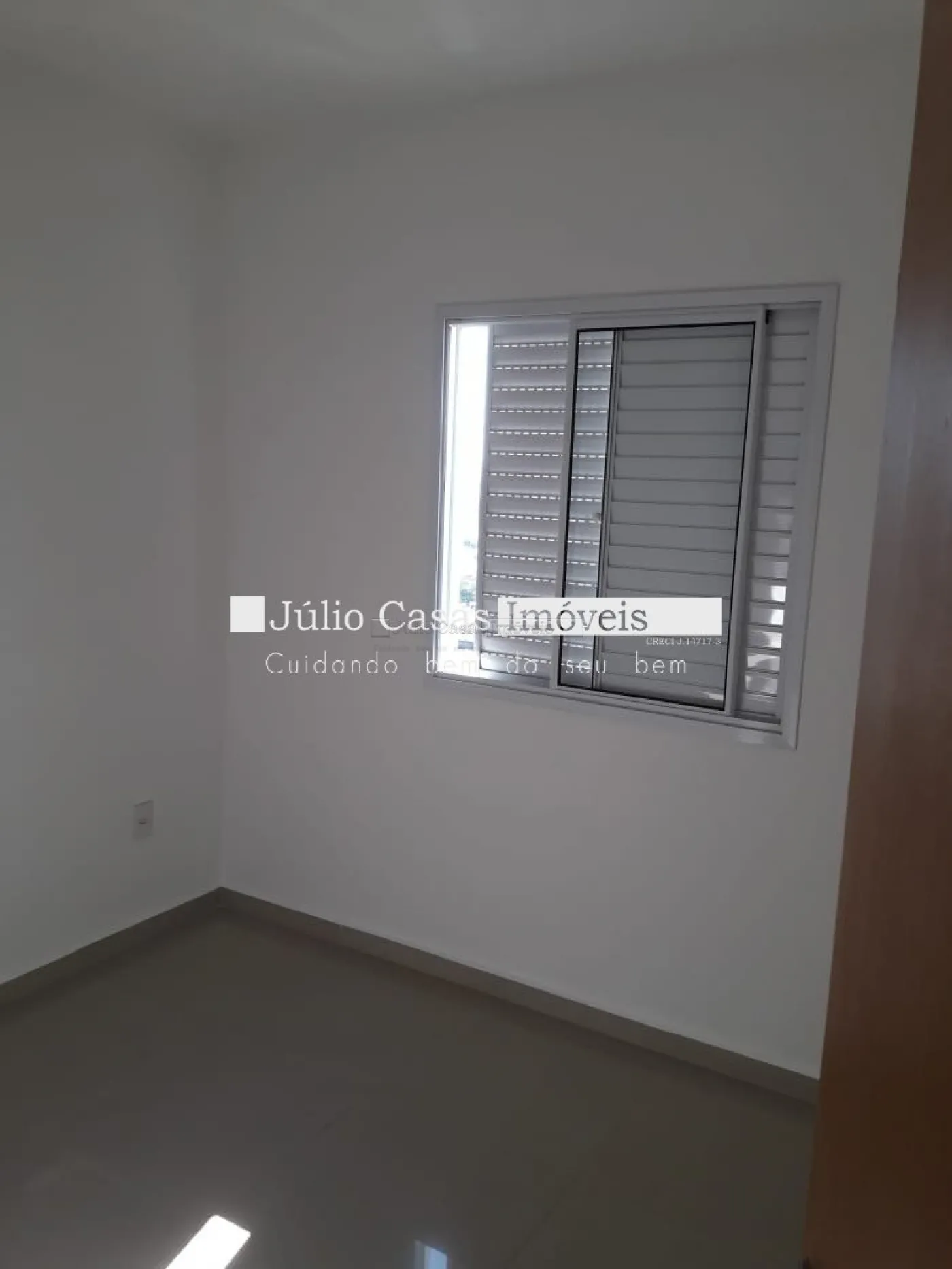 Sala de estar com sacada, integrada com a cozinha com armários e área de serviço. 2 quartos sendo 1 com armário, wc social com box em vidro e gabinete. 1 vaga de garagem rotativa, apartamento todo em piso cerâmico. 2 elevadores, mercadinho, portaria 24 h, salão de festas, piscina, playground.