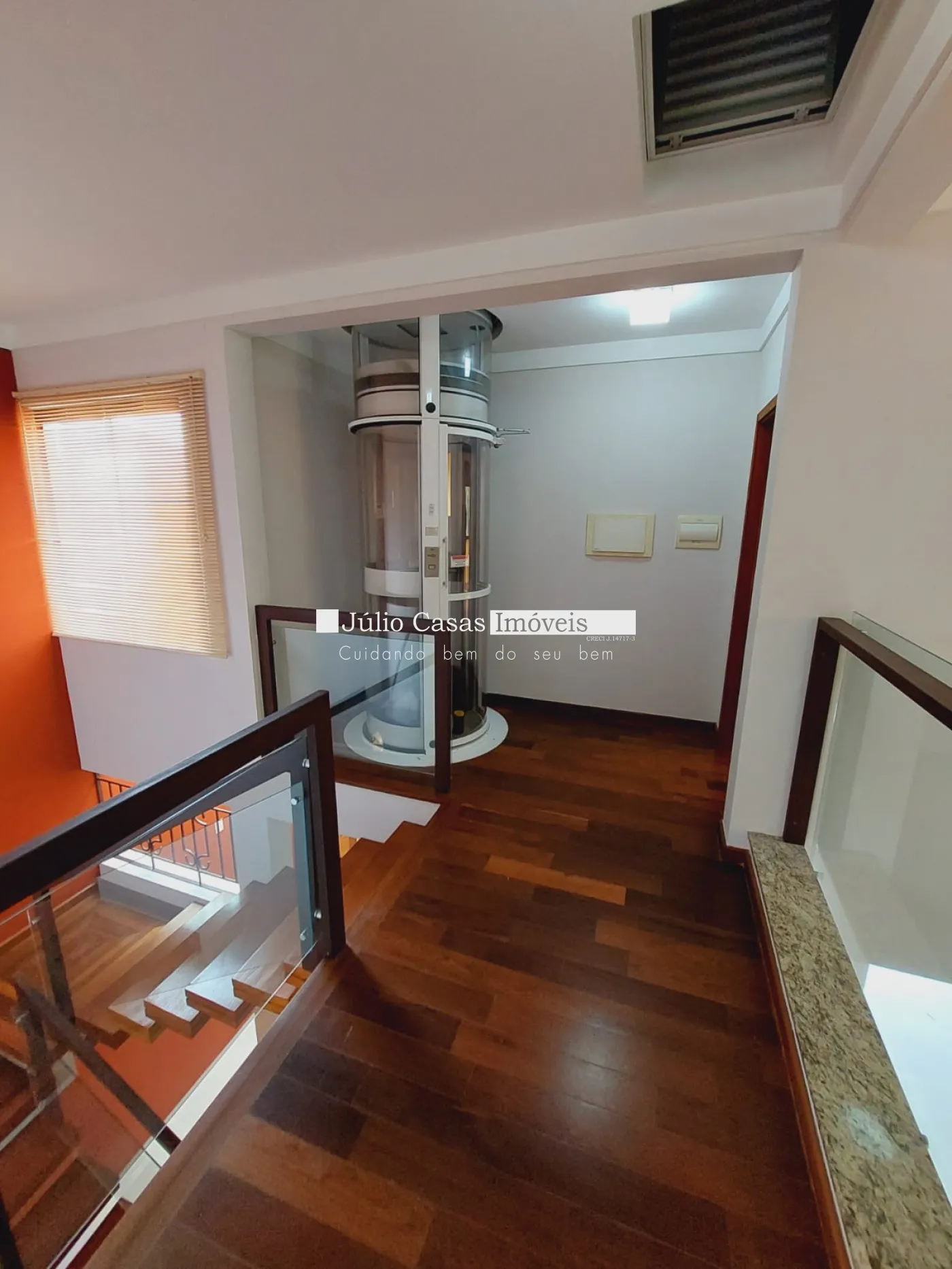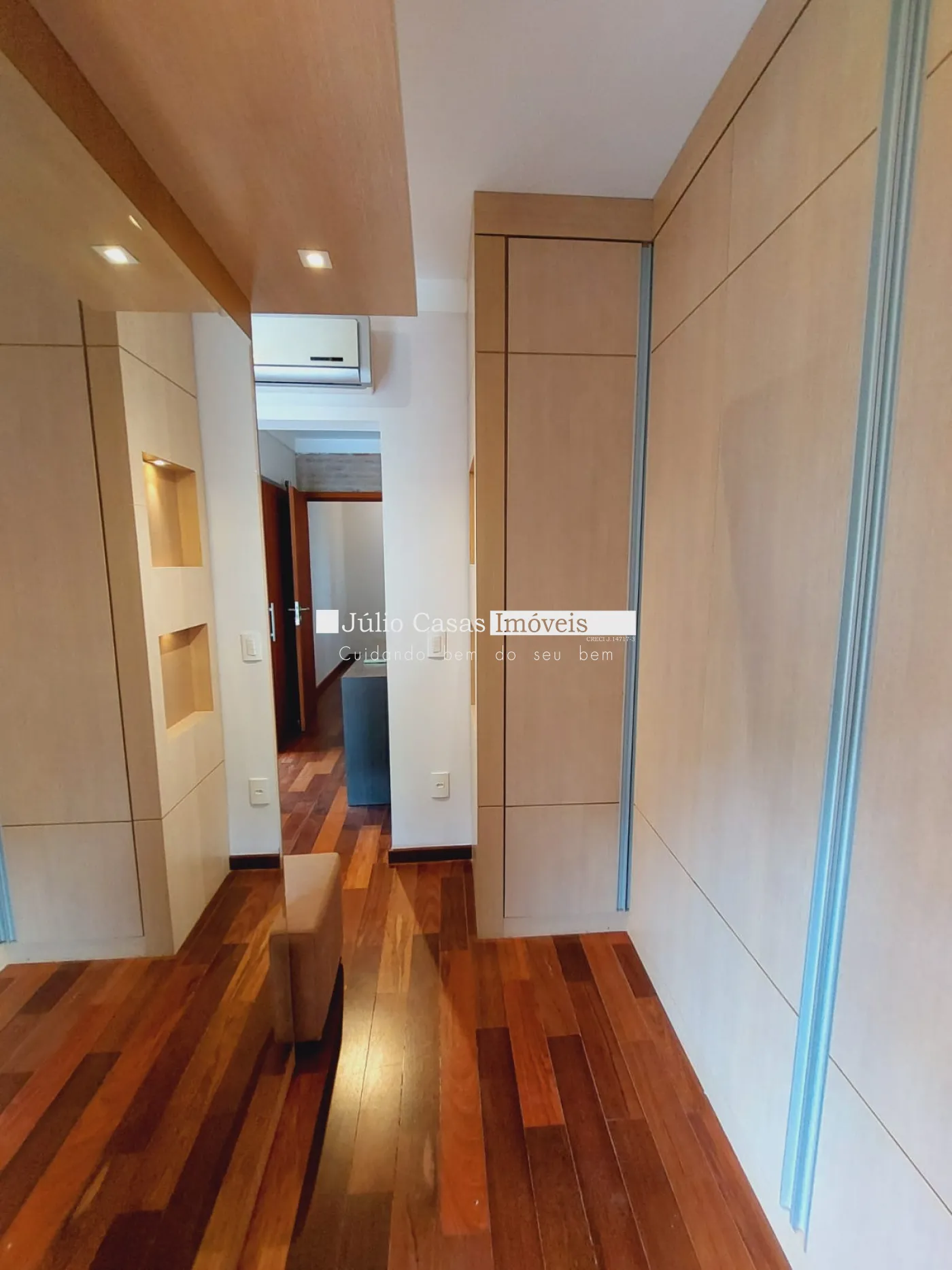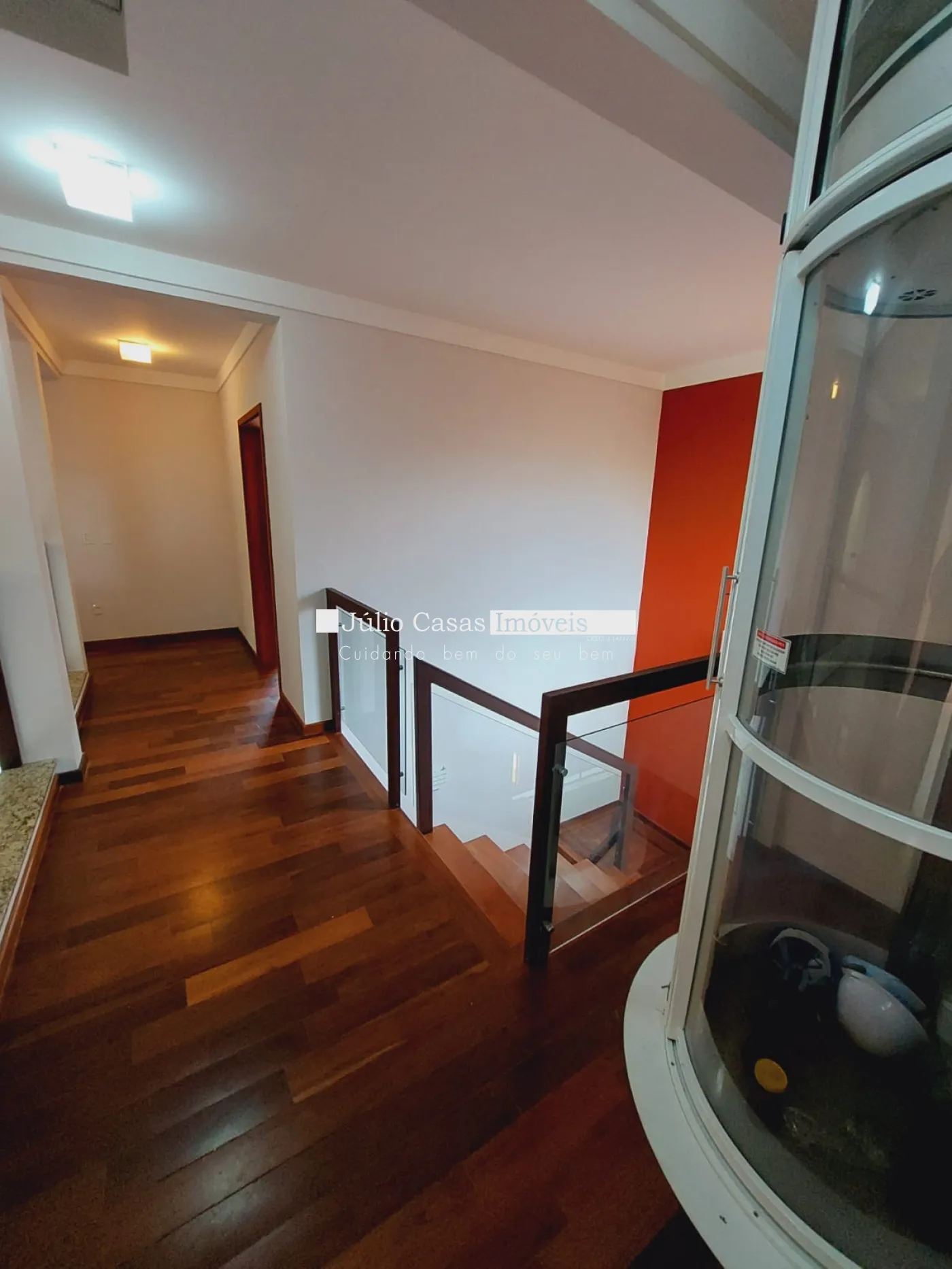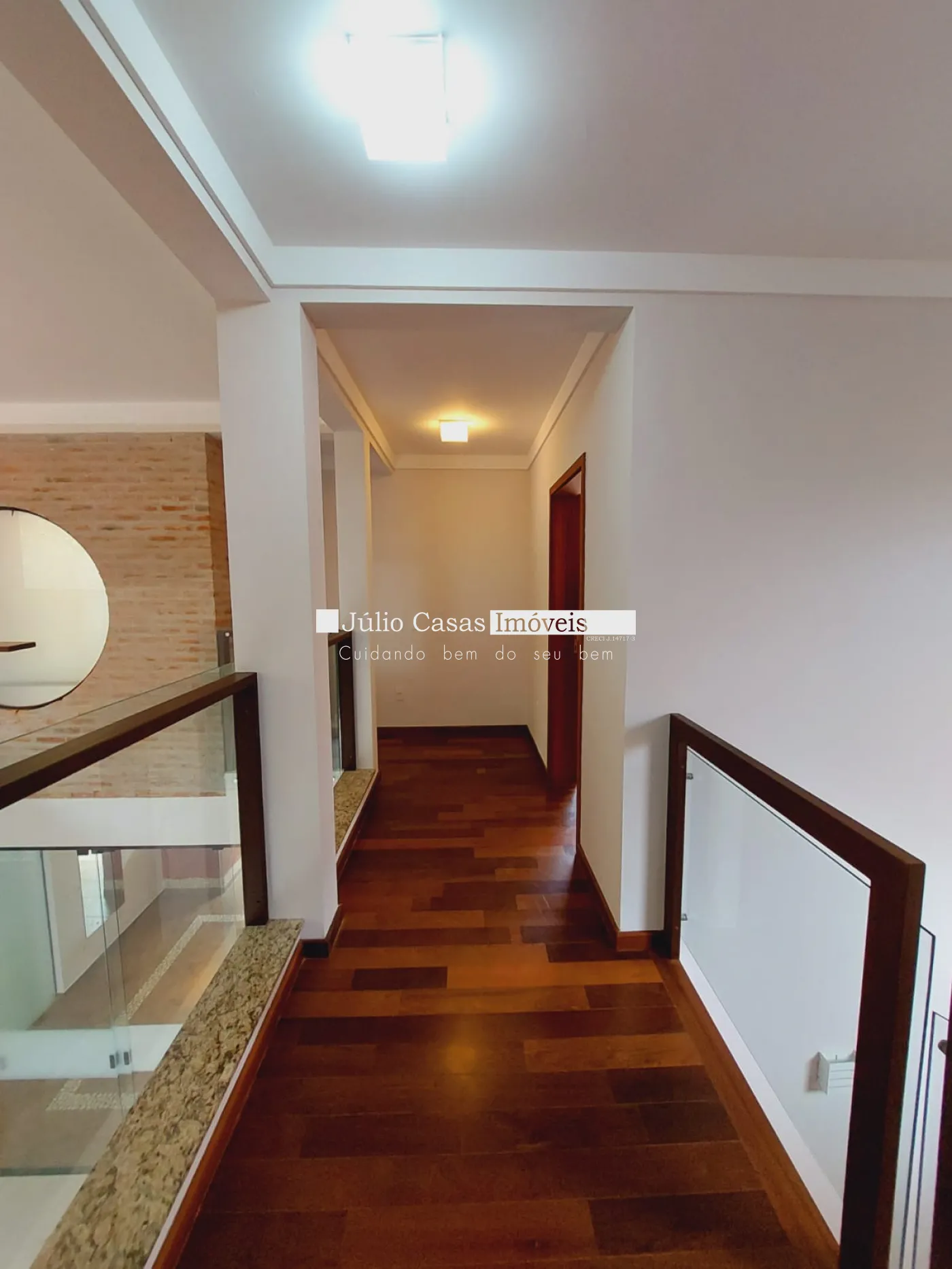 Andar superior com 3 suítes amplas 1 sendo máster com closet todas com ar condicionado, banheiros com box em vidro e gabinetes, quartos em piso madeira.