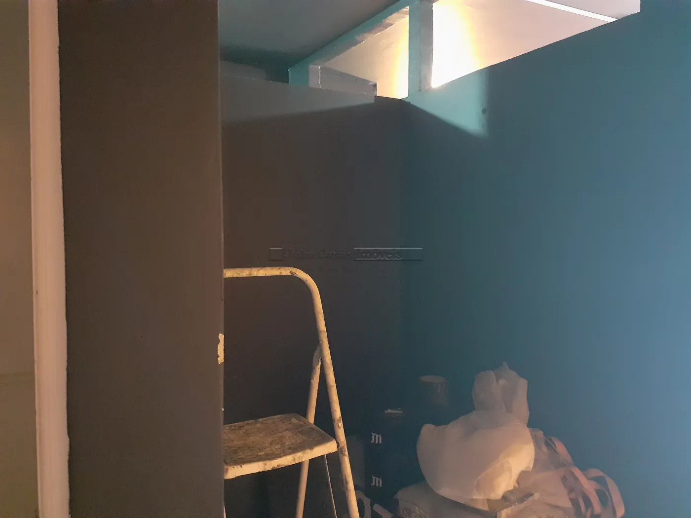 Acesso ao Mezanino através de escada caracol, piso pintado (emborrachado) e portão pequeno de ferro, telhado com telha sanduiche e exaustor ,