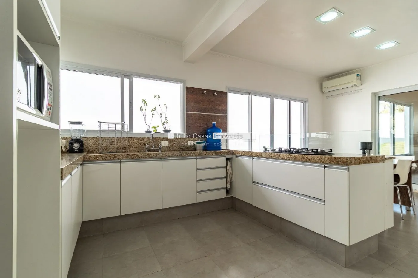 A cozinha americana é equipada com armários planejados e ar condicionado, além de uma despensa e uma lavanderia. Há também um dormitório e um banheiro de serviço.