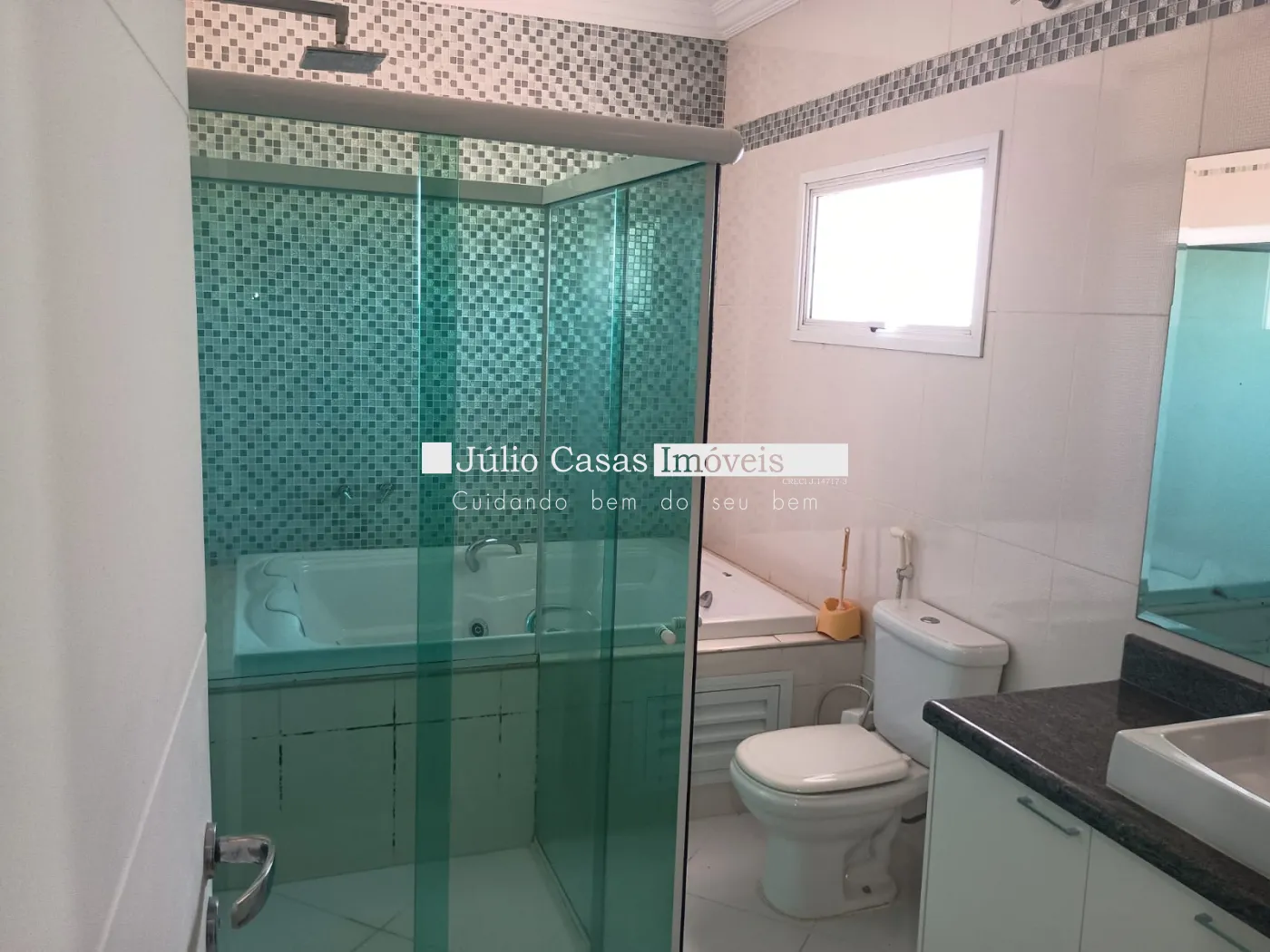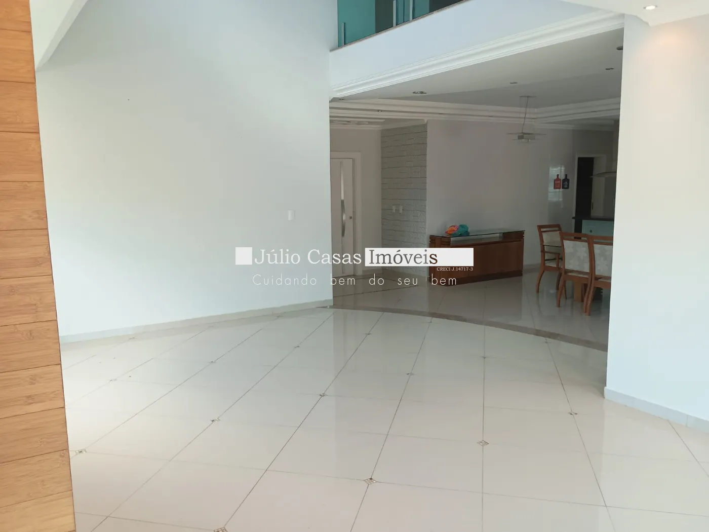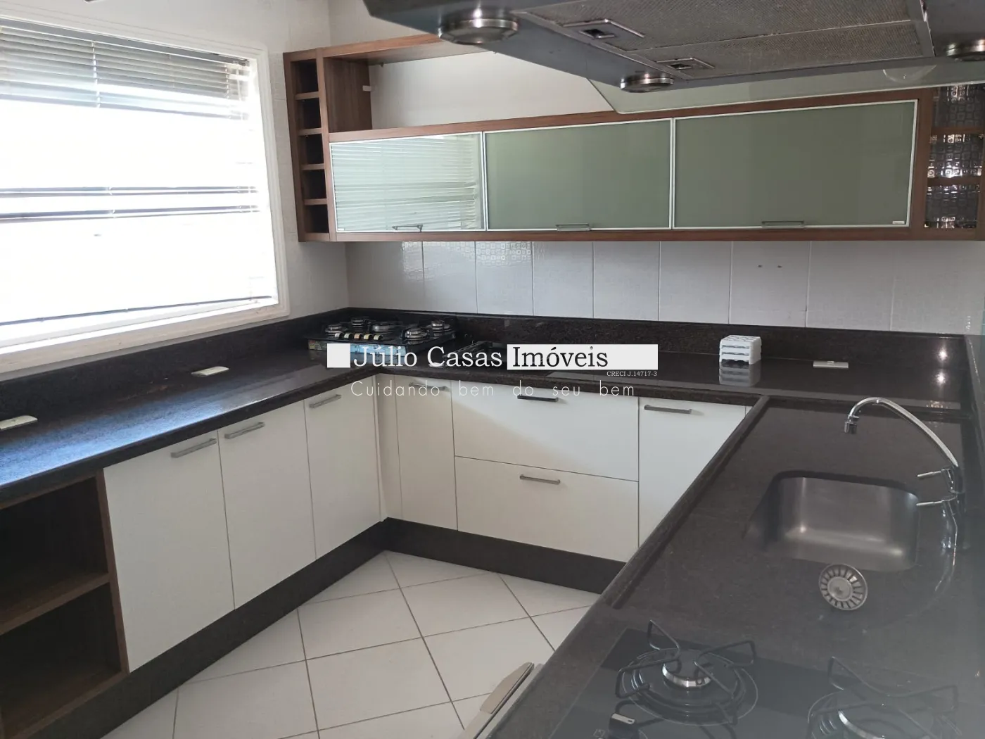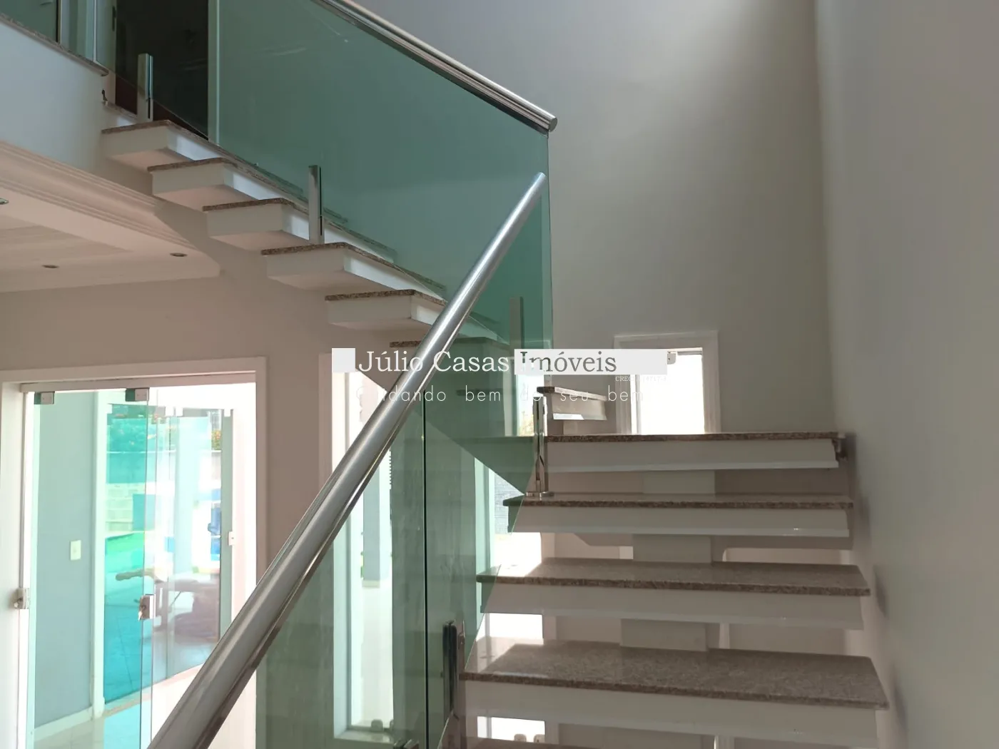 No andar térreo, há sala de jantar, sala de estar com lareira e com excelente iluminação natural, todas com piso em porcelanato. Além disso, um cômodo escritório, também com piso em porcelanato e repleto de armários modulados e ar condicionado. O térreo inclui ainda um lavabo, uma cozinha modulada estilo americano, uma despensa e uma lavanderia. No andar superior, encontram-se três dormitórios todos suítes com piso laminado, ar condicionado, varanda sendo uma suíte master com closet e hidromassagem. no hall de entrada para as suítes encontra-se uma sala de vídeo com piso em laminado de madeira, painel e ar condicionado.
