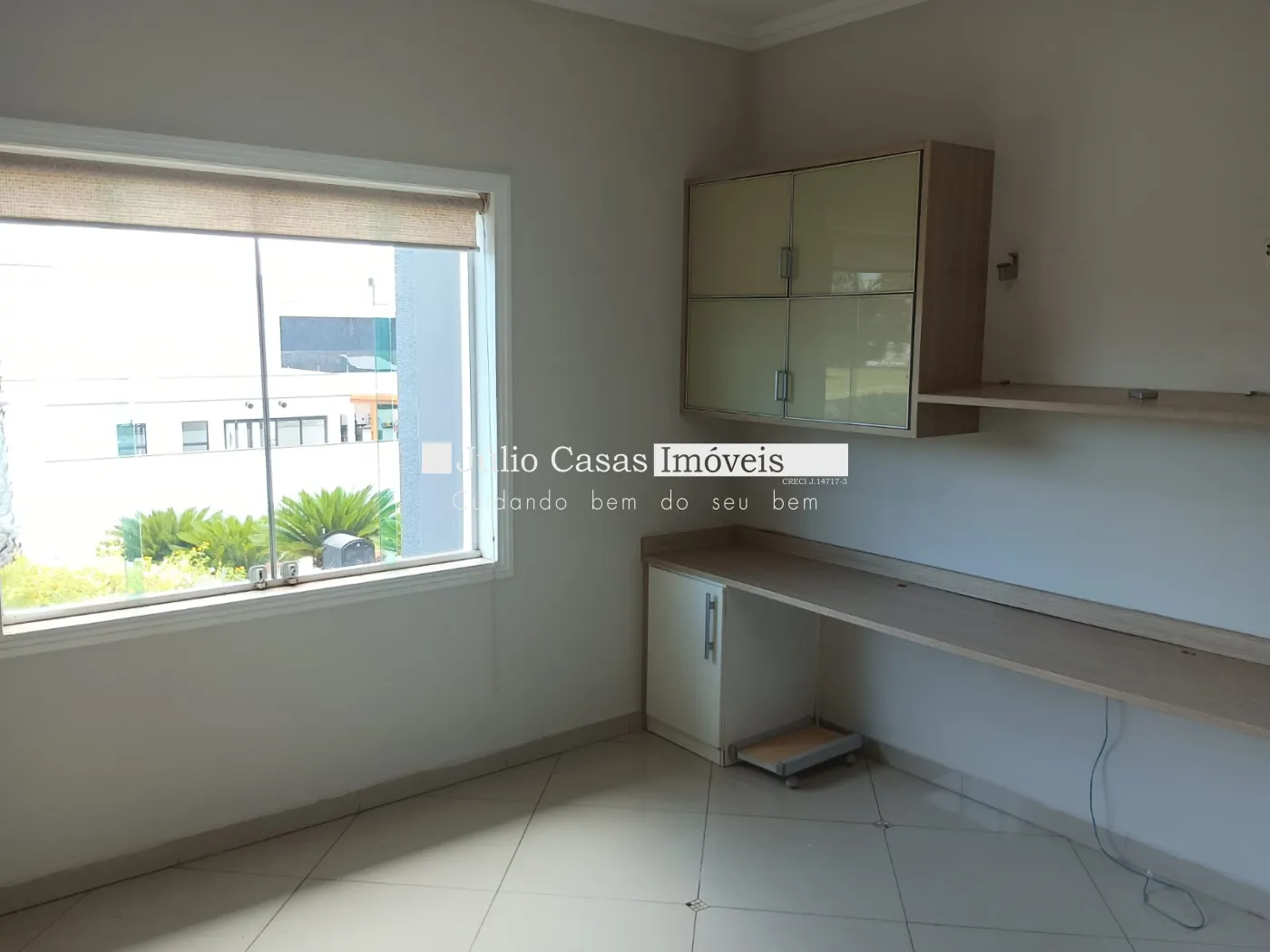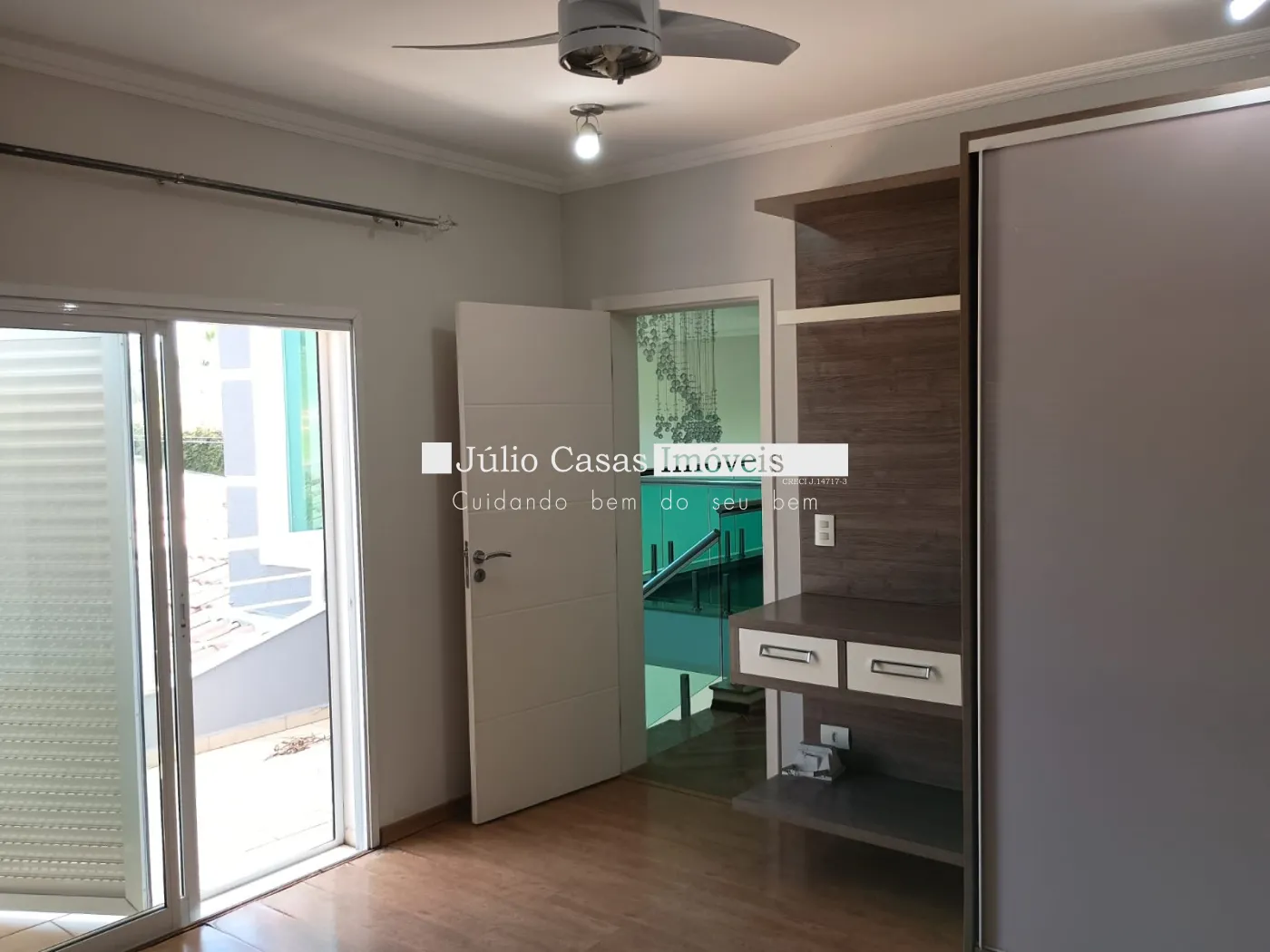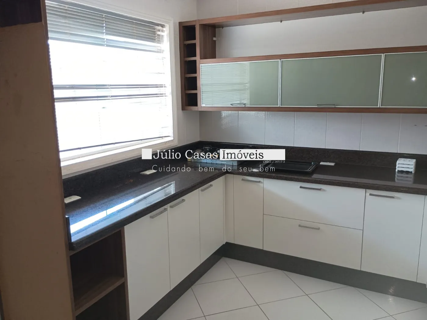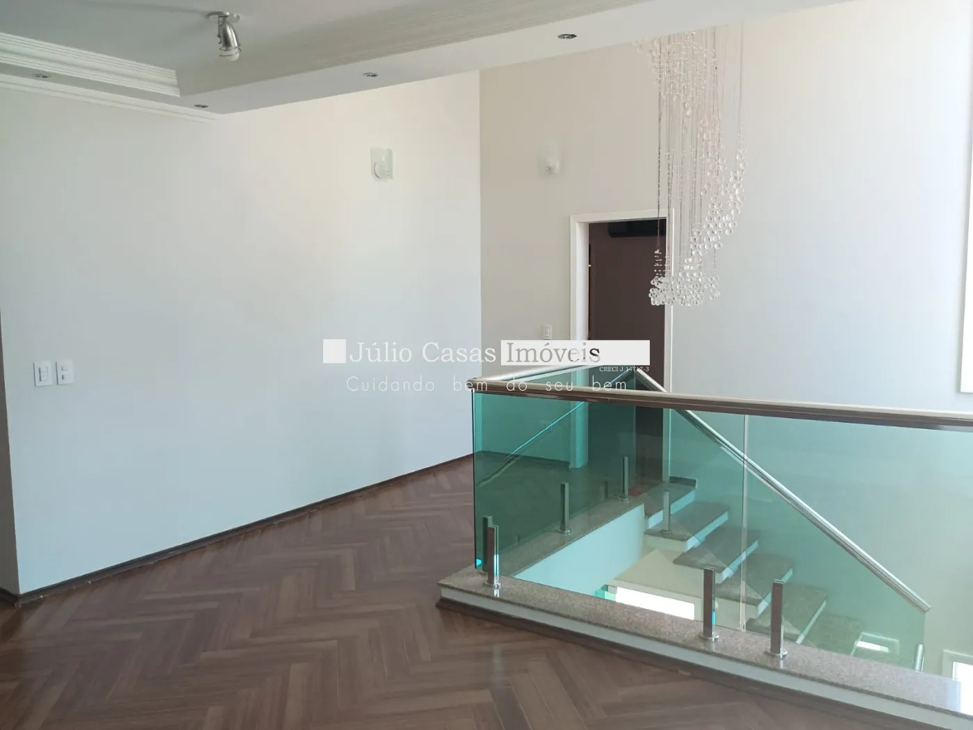 No andar térreo, há sala de jantar, sala de estar com lareira e com excelente iluminação natural, todas com piso em porcelanato. Além disso, um cômodo escritório, também com piso em porcelanato e repleto de armários modulados e ar condicionado. O térreo inclui ainda um lavabo, uma cozinha modulada estilo americano, uma despensa e uma lavanderia. No andar superior, encontram-se três dormitórios todos suítes com piso laminado, ar condicionado, varanda sendo uma suíte master com closet e hidromassagem. no hall de entrada para as suítes encontra-se uma sala de vídeo com piso em laminado de madeira, painel e ar condicionado.
