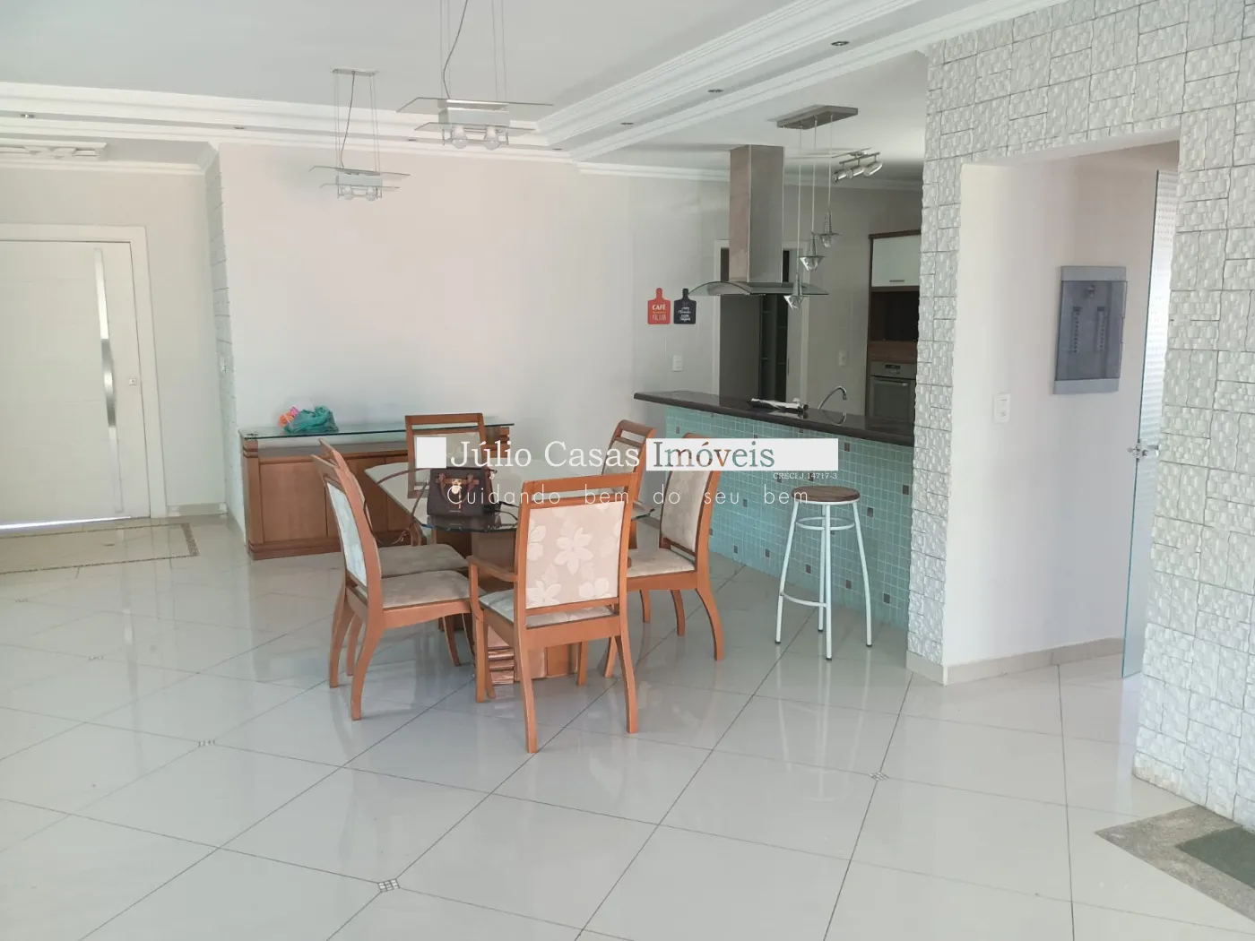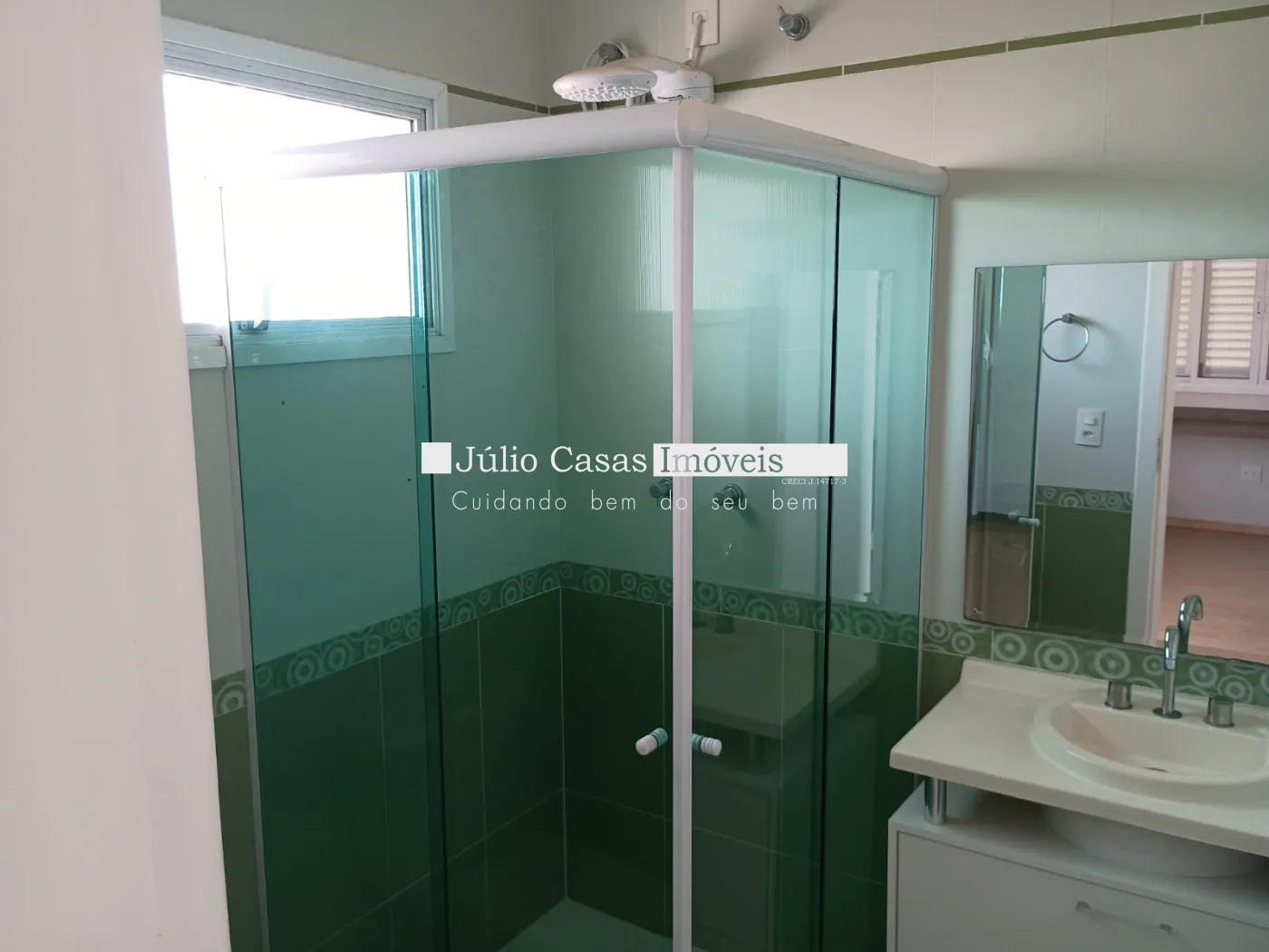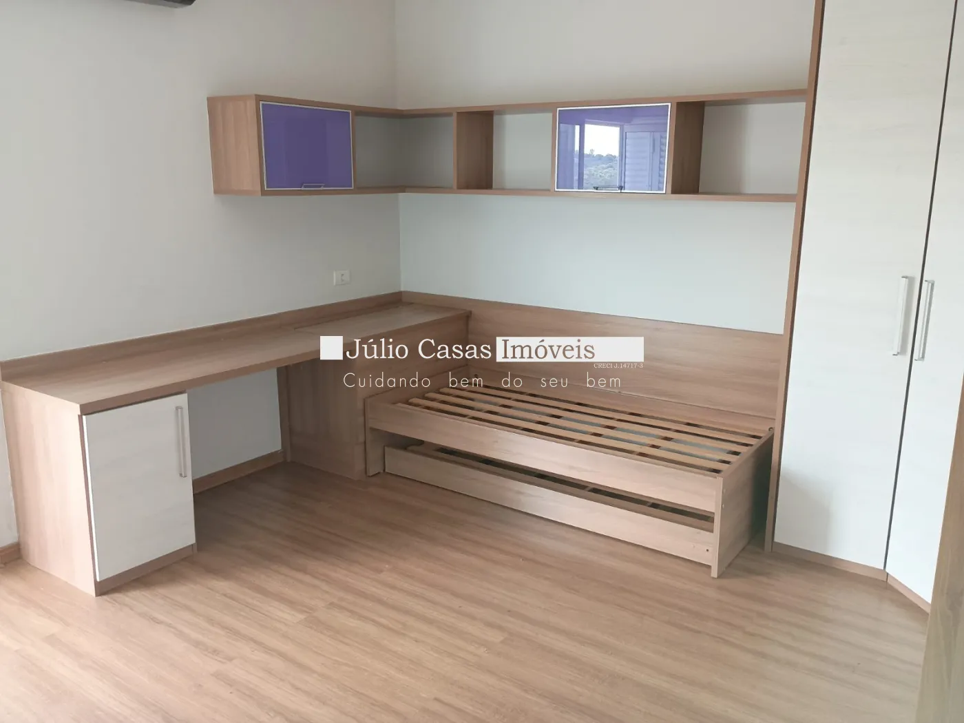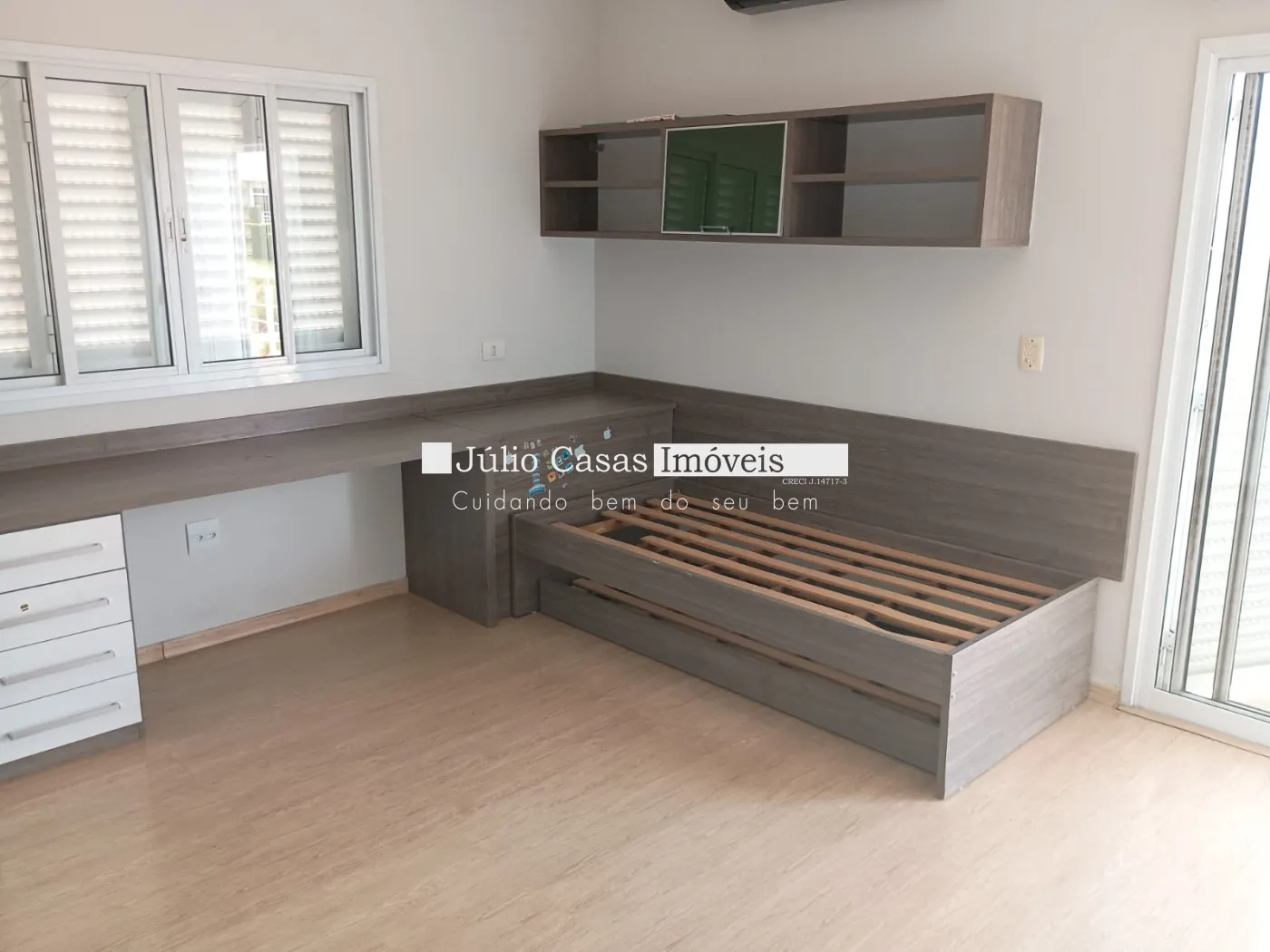 No andar térreo, há sala de jantar, sala de estar com lareira e com excelente iluminação natural, todas com piso em porcelanato. Além disso, um cômodo escritório, também com piso em porcelanato e repleto de armários modulados e ar condicionado. O térreo inclui ainda um lavabo, uma cozinha modulada estilo americano, uma despensa e uma lavanderia. No andar superior, encontram-se três dormitórios todos suítes com piso laminado, ar condicionado, varanda sendo uma suíte master com closet e hidromassagem. no hall de entrada para as suítes encontra-se uma sala de vídeo com piso em laminado de madeira, painel e ar condicionado.