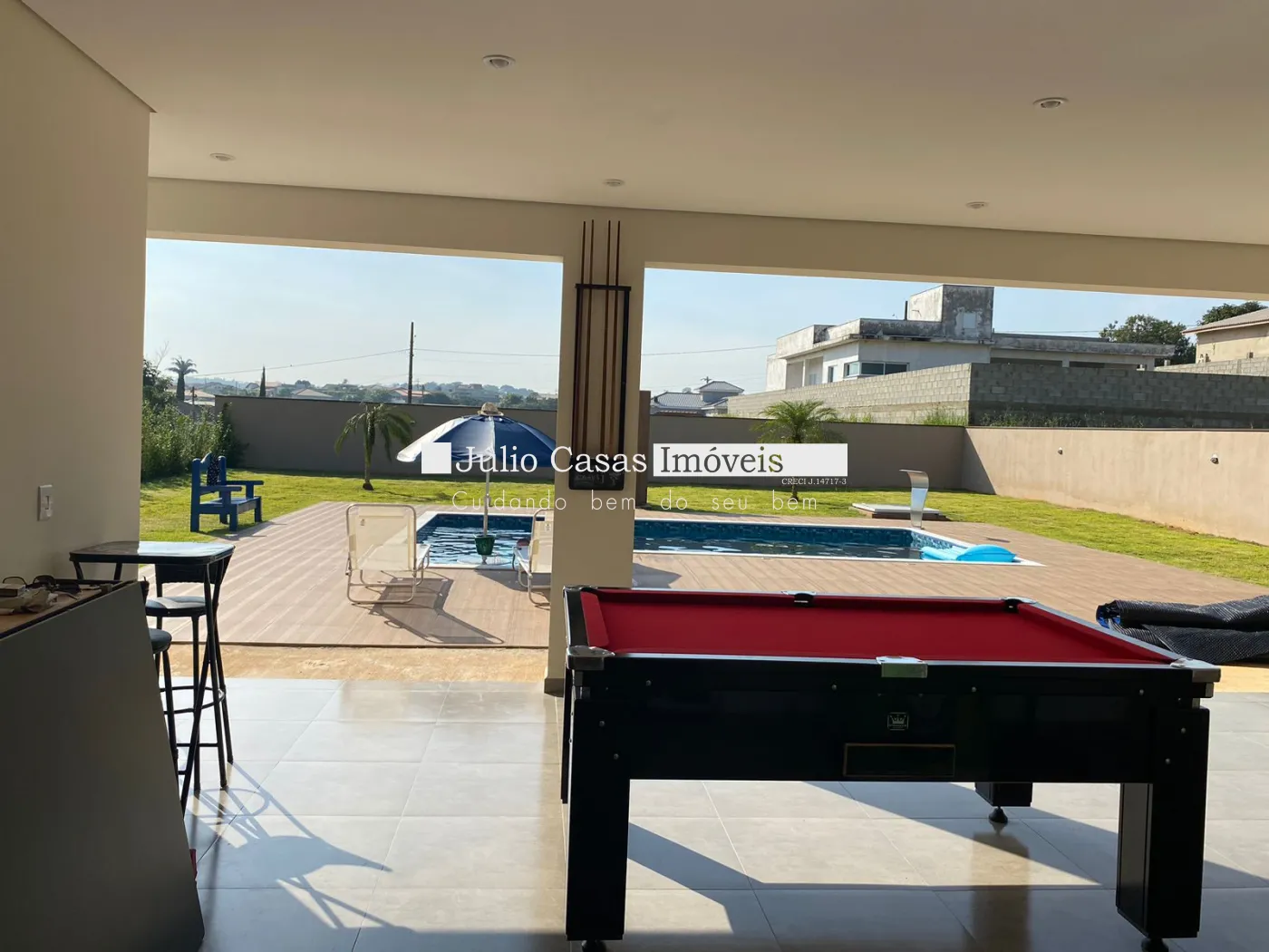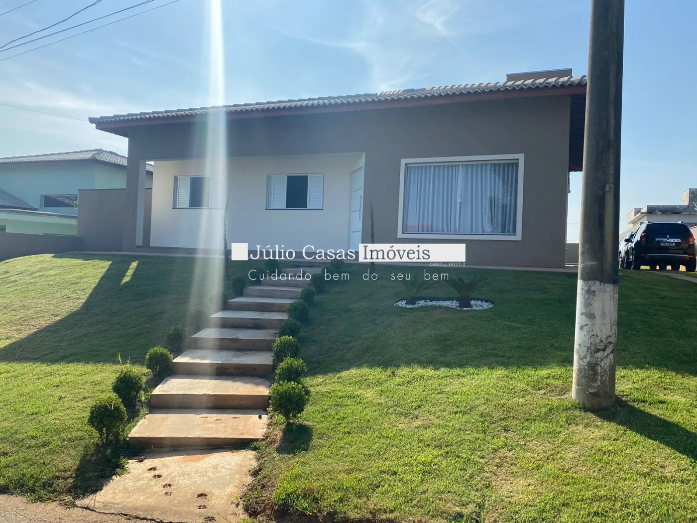 Casa térrea em condomínio com 232m2 de área construída sobre terreno de 800m2 , contendo sala para 2 ambientes espaçosos , lavabo com bancada em mármore Italiano, escritório contendo 2 salas com bancada de trabalho em granito Preto São Gabriel podendo ser revertido em dormitório, Cozinha com bancadas em Granito Preto São Gabriel , piso em porcelanato, armários embutidos , , lavanderia , despensa com armários , 3 dormitórios sendo 1 com suite, banho social , ambos com bancada em mármore Italiano , quartos com piso em laminado de madeira , área gourmet fechada com portas de correr em alumínio e vidros blindex, balcões e pia em granito preto, churrasqueira revestida com Mármore Espanhol Crema Marfil, piso em porcelanato , área da piscina totalmente revestida com pedras São Tomé, escada em granito rustico, piscina em vinil 9x5m com cascata em aço Inox , jardins em todo o contorno do imóvel, Local absolutamente tranquilo e próximo a natureza .