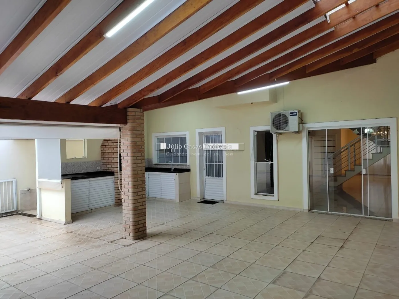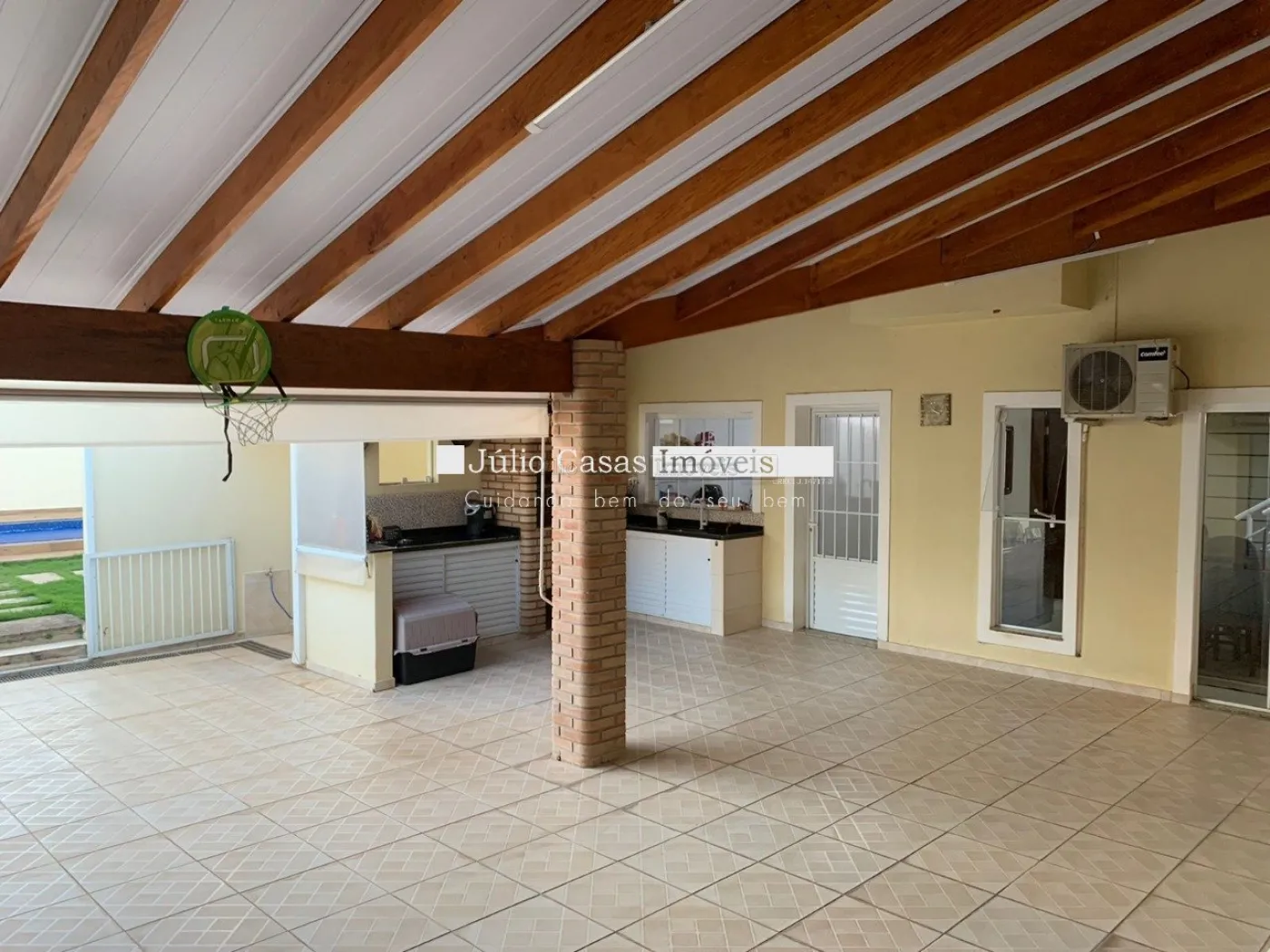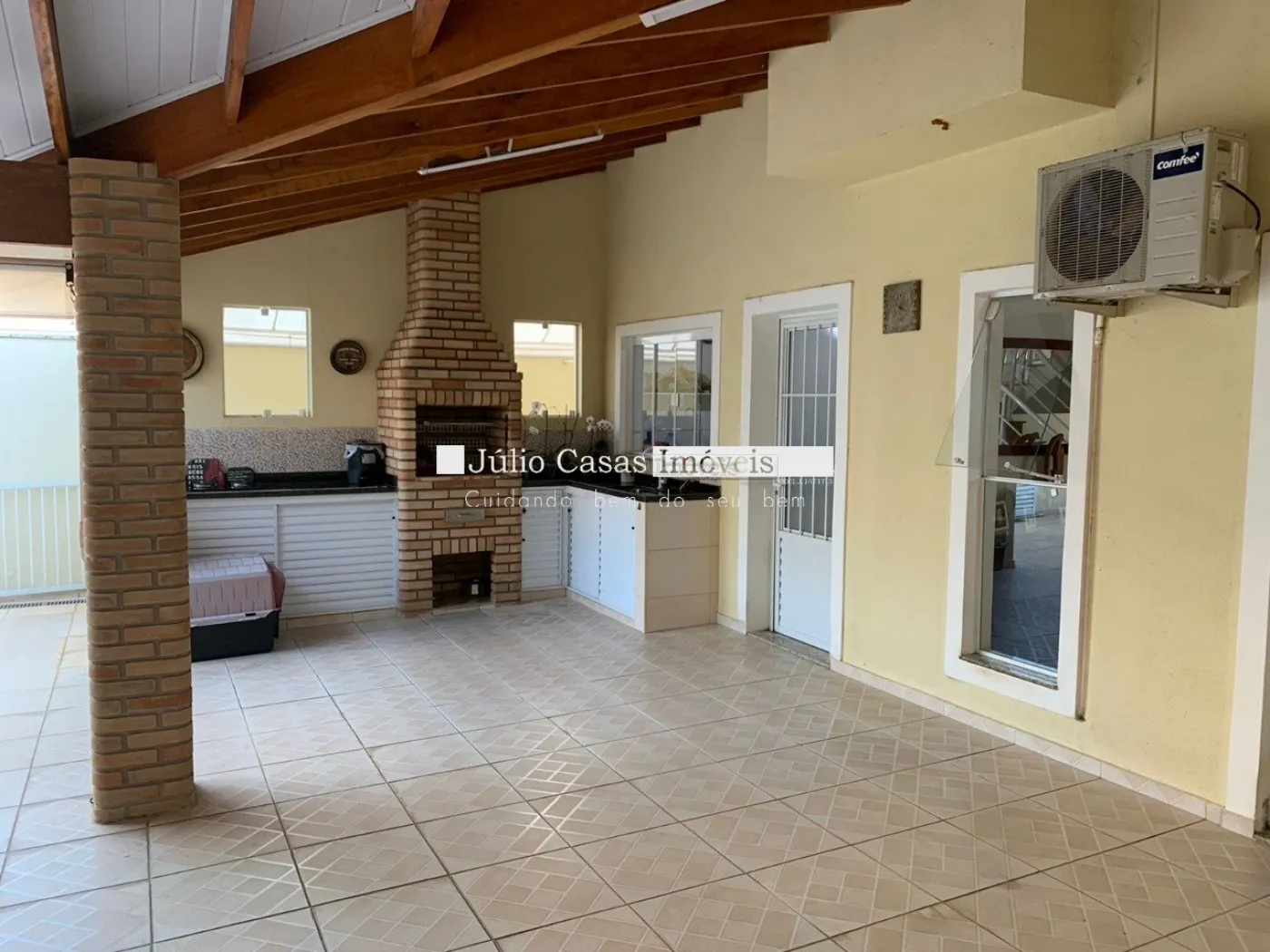 A área gourmet é equipada com pia de apoio e churrasqueira, perfeita para encontros e refeições ao ar livre. O imóvel também conta com uma piscina aquecida e um banheiro de apoio para maior comodidade. A garagem possui quatro vagas cobertas, garantindo espaço e segurança para os veículos.