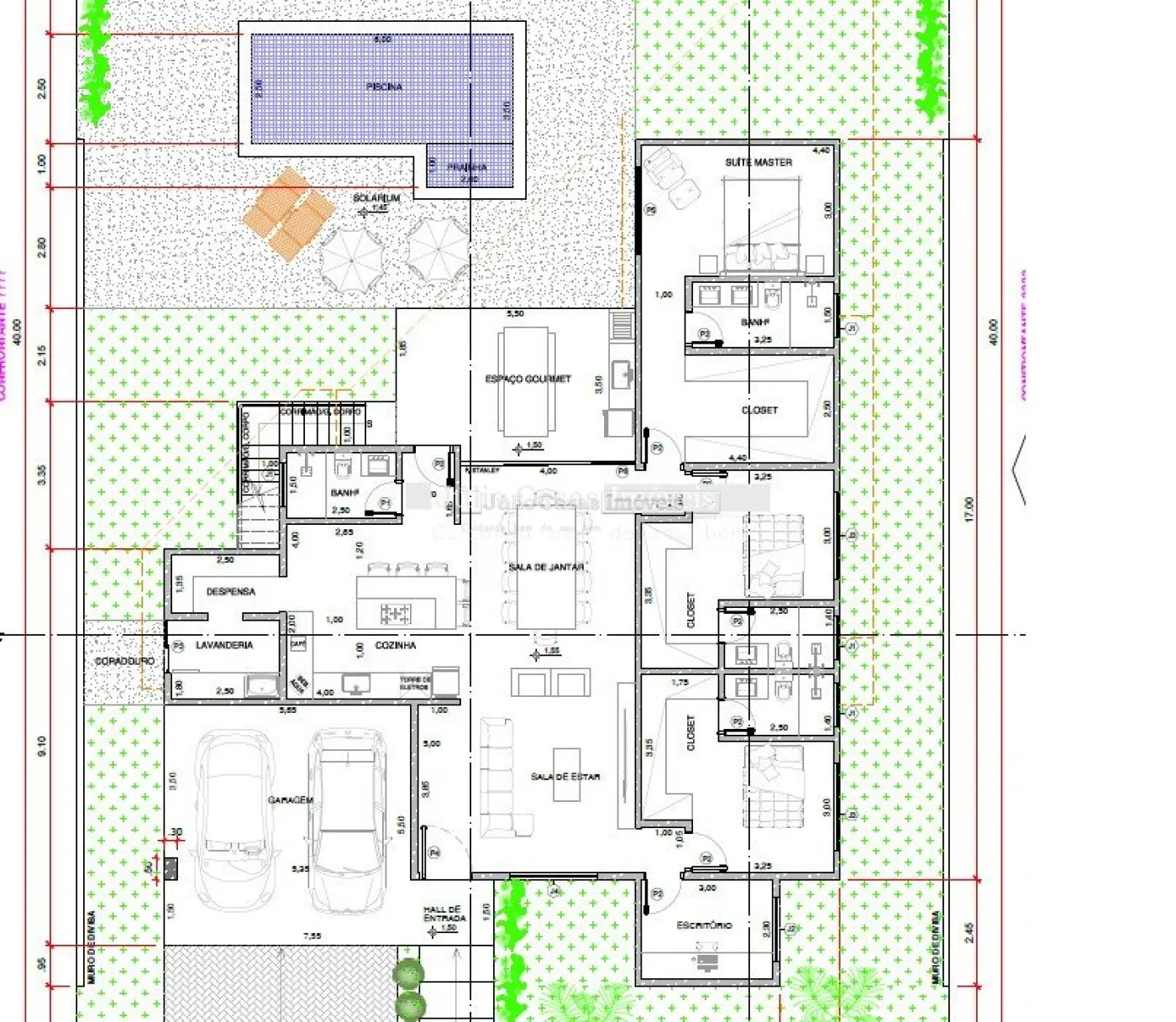 Casa térrea, sala dois ambientes, sala de jantar, cozinha, dispensa e área de serviço, escritório, 3 suítes, Área gourmet com piscina, 4 vagas garagem.
