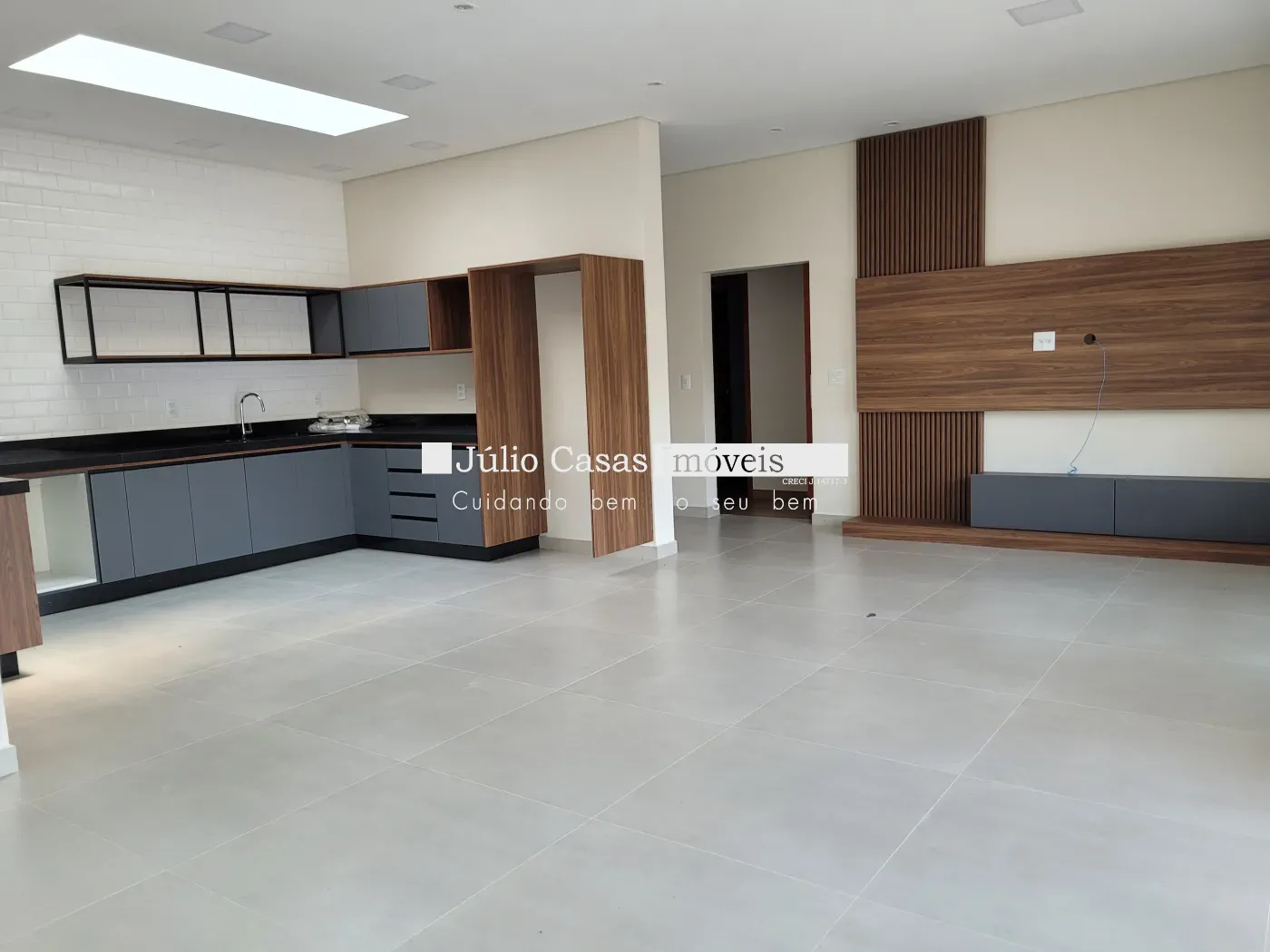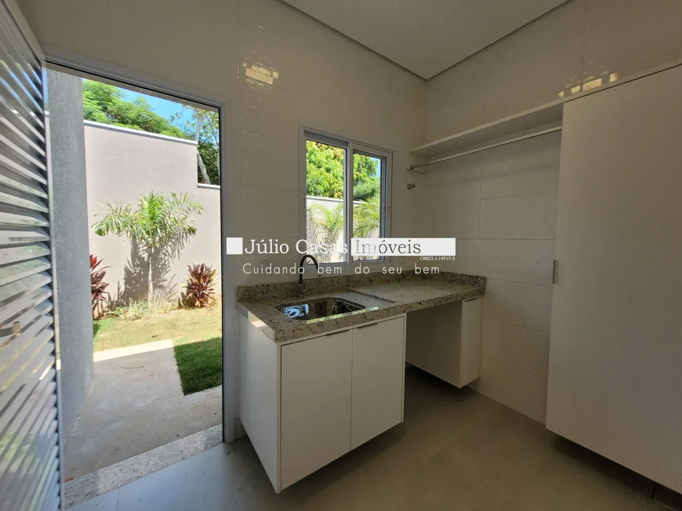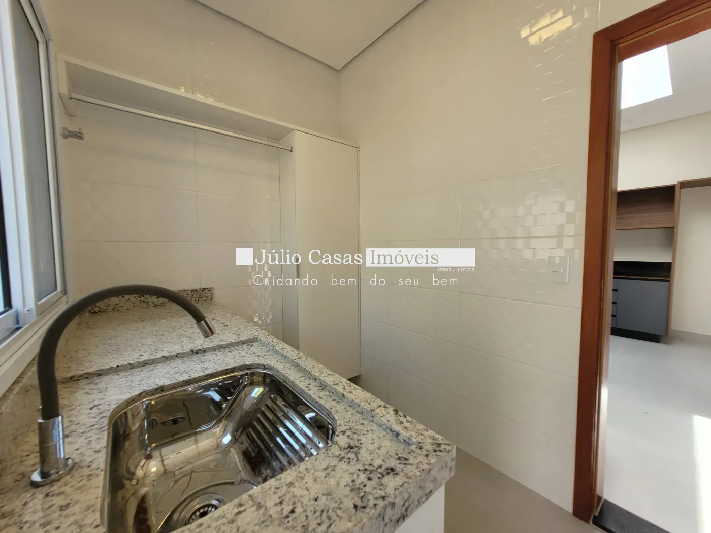 A sala integra-se harmoniosamente à cozinha, que possui um amplo balcão de granito preto e é repleta de armários modulados feitos sob medida. Ao lado da cozinha, encontra-se uma lavanderia completa, também equipada com armários modulados.