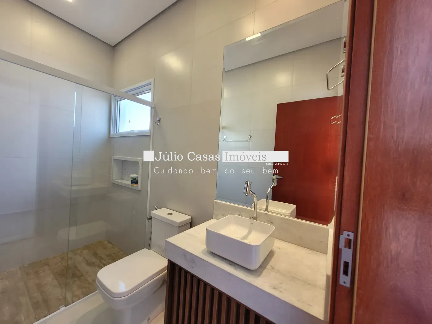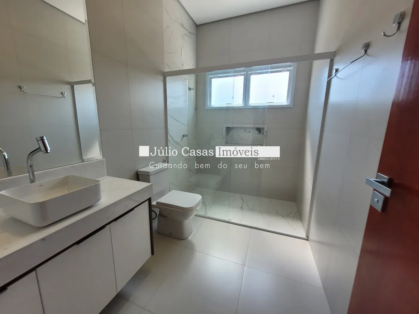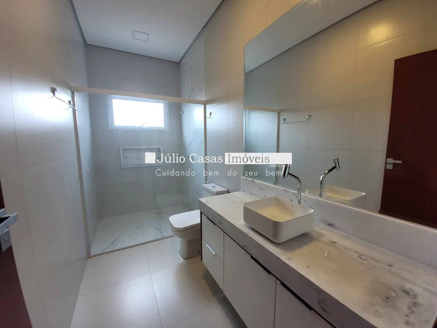 A casa possui três quartos confortáveis, sendo uma suíte, todos com piso em porcelanato, forro de gesso e esquadrias de alumínio na cor branca. Os banheiros são igualmente impressionantes, revestidos com porcelanato, balcão de granito branco com cuba de sobrepor, metais de primeira linha e box de vidro temperado.