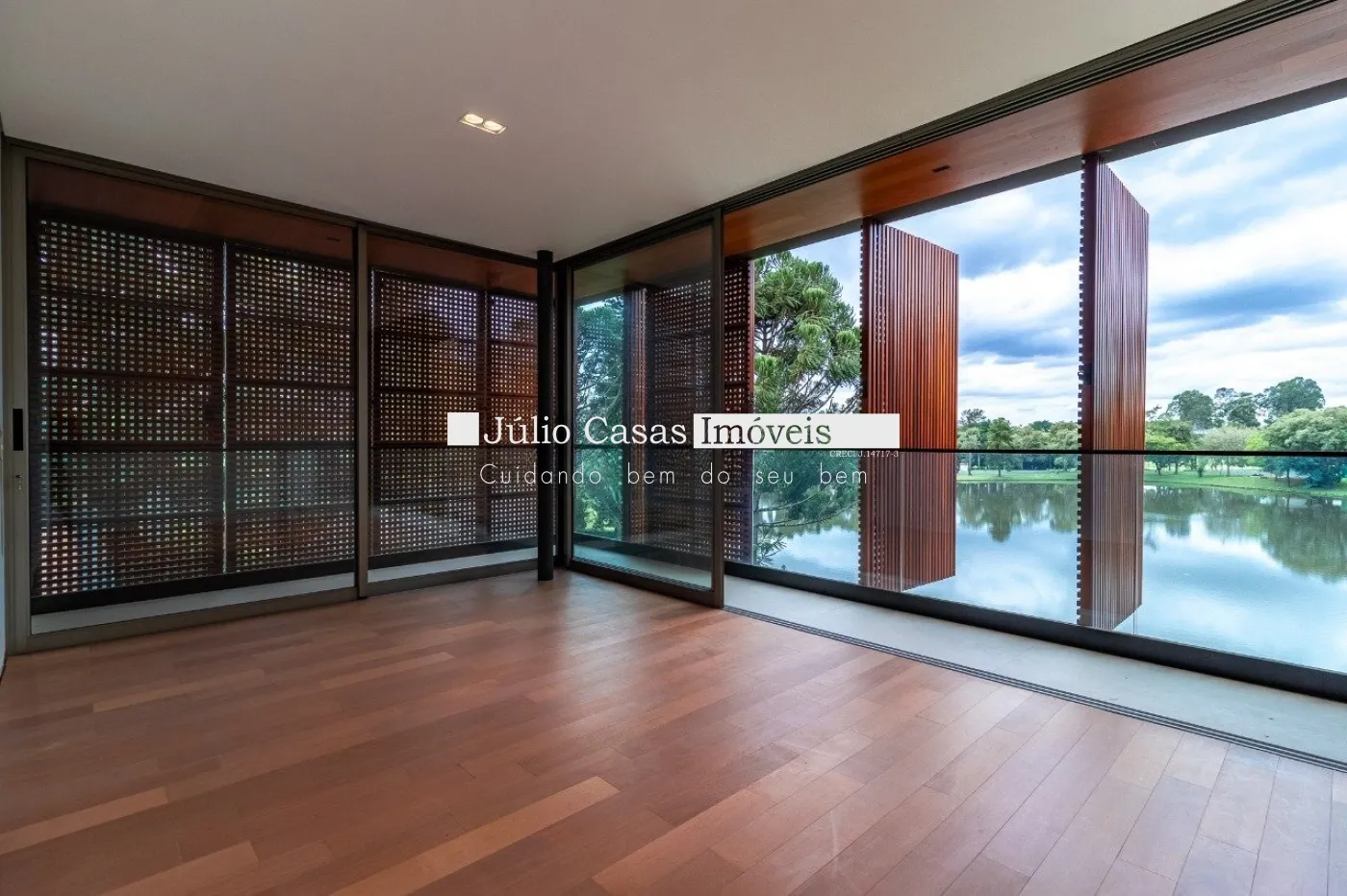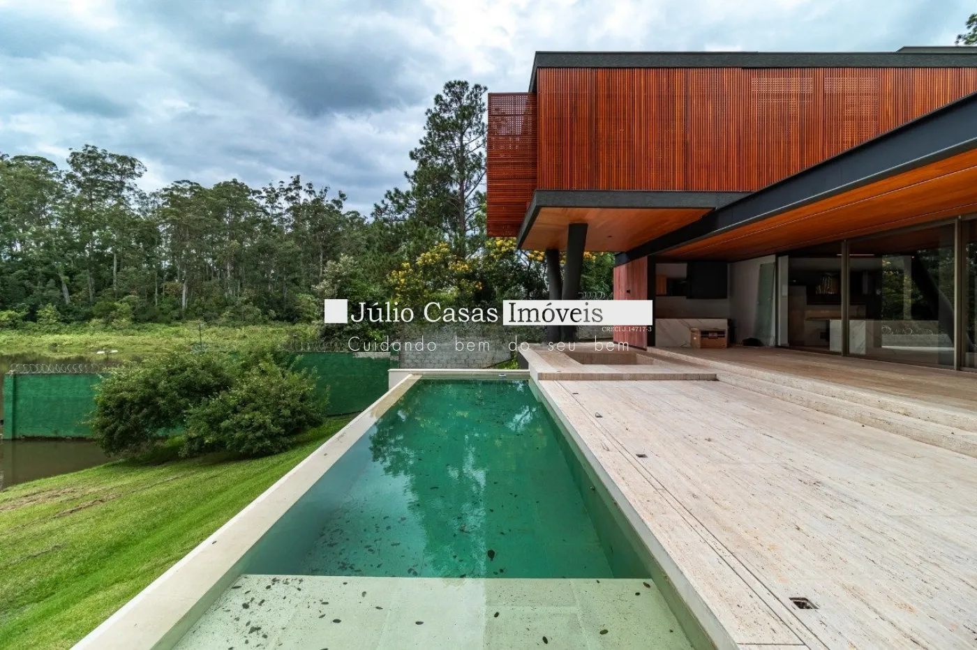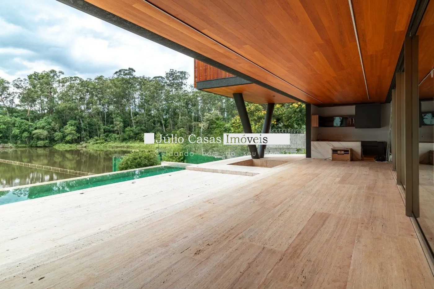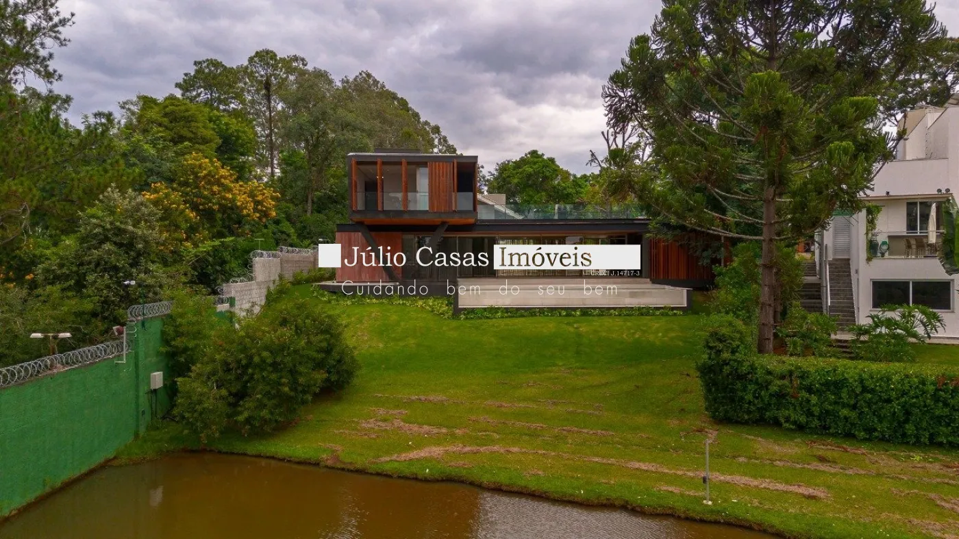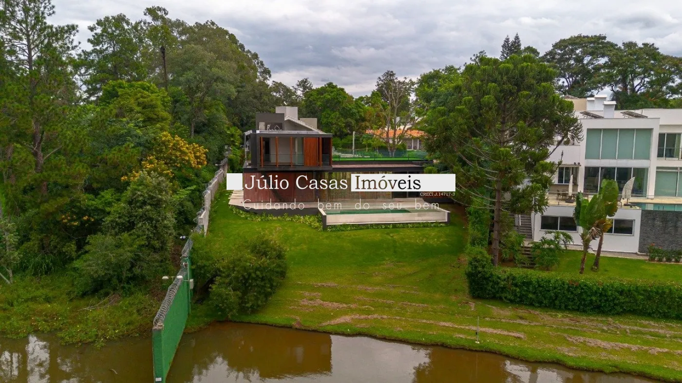 Casa em dois pavimentos localizada em condomínio de alto padrão, com finíssimo acabamento num projeto moderno assinado pelo arquiteto Fernando Poles e paisagismo de Gustavo Carvalho. Num terreno de 1330m² sendo 700m² de área construída, composta por ampla sala em dois ambientes, cozinha americana integrada com a área gourmet, piso com pedras ultra compacta, metais com função `touch` e linda vista para o lago. Cinco suítes sendo uma no andar térreo, espaço `rooftop` para prática de Golfe. Lareira externa a gás, esquadrias minimalistas, acabamento na varanda com Muxarabi em Cumaru. Casa toda revestida com concreto pigmentado, pisos de travertino romano na área social e dormitórios em madeira, acabamento do forro em madeira, móveis planejados da Florense, preparação para ar condicionado K7, sistema de automação Savant, piscina com borda infinita de granilite, sistema de energia solar com boiler de 800 litros.