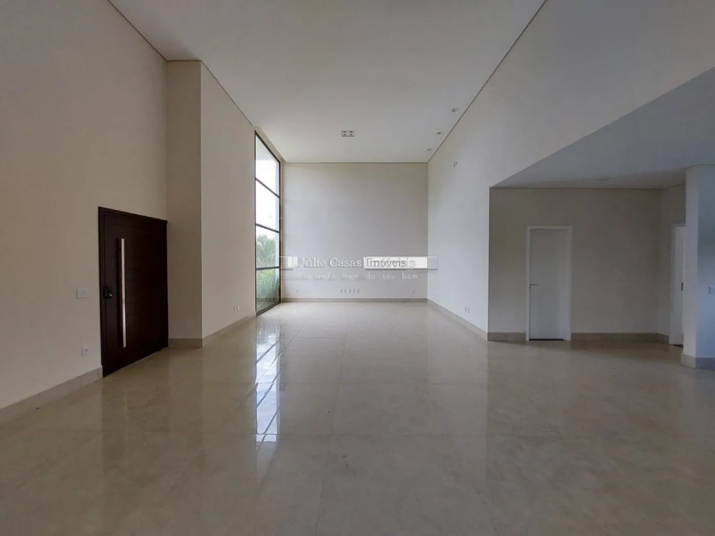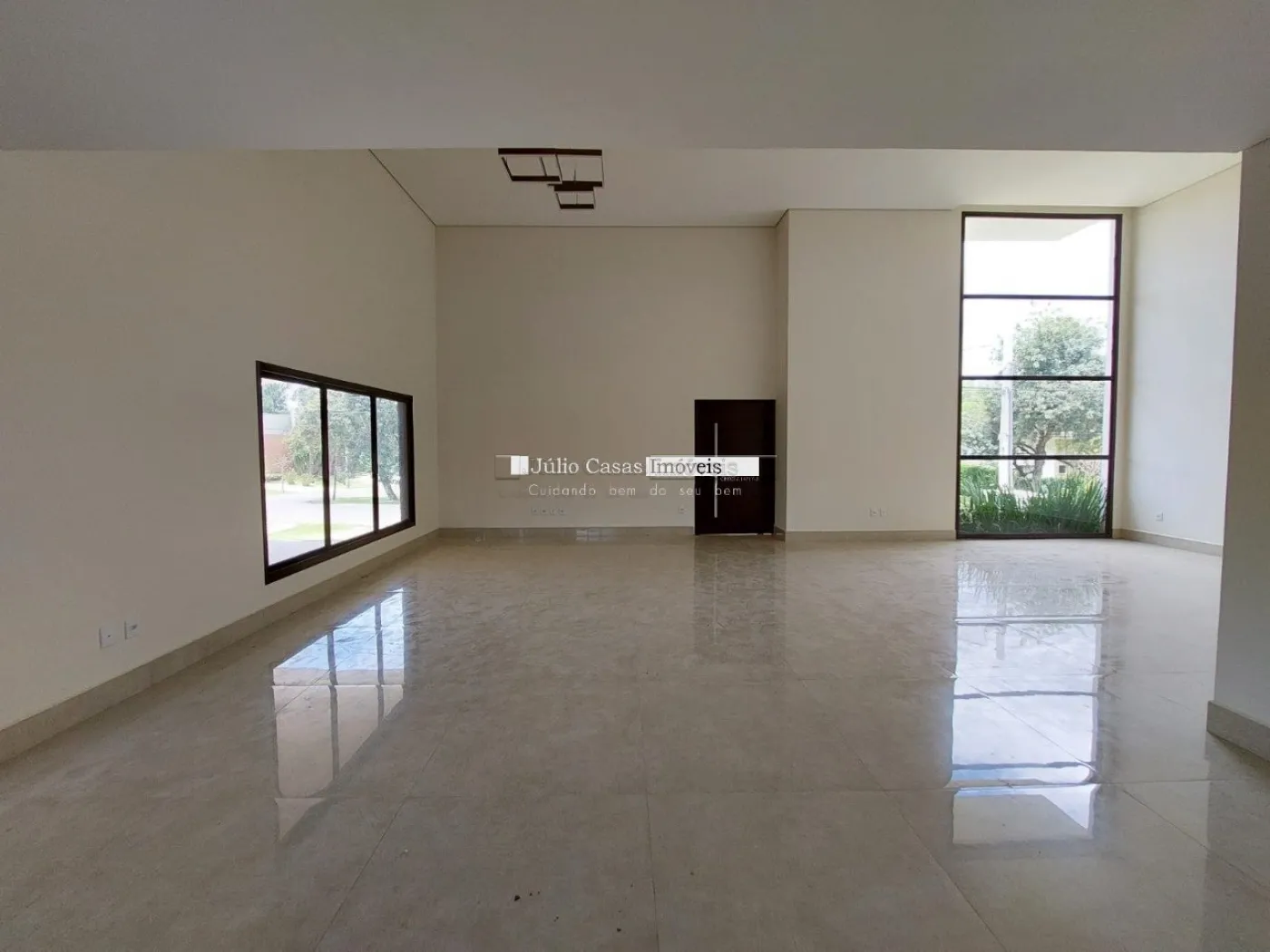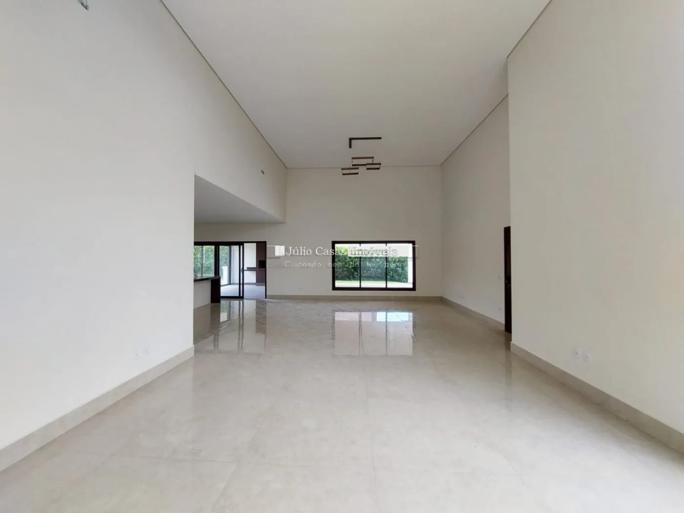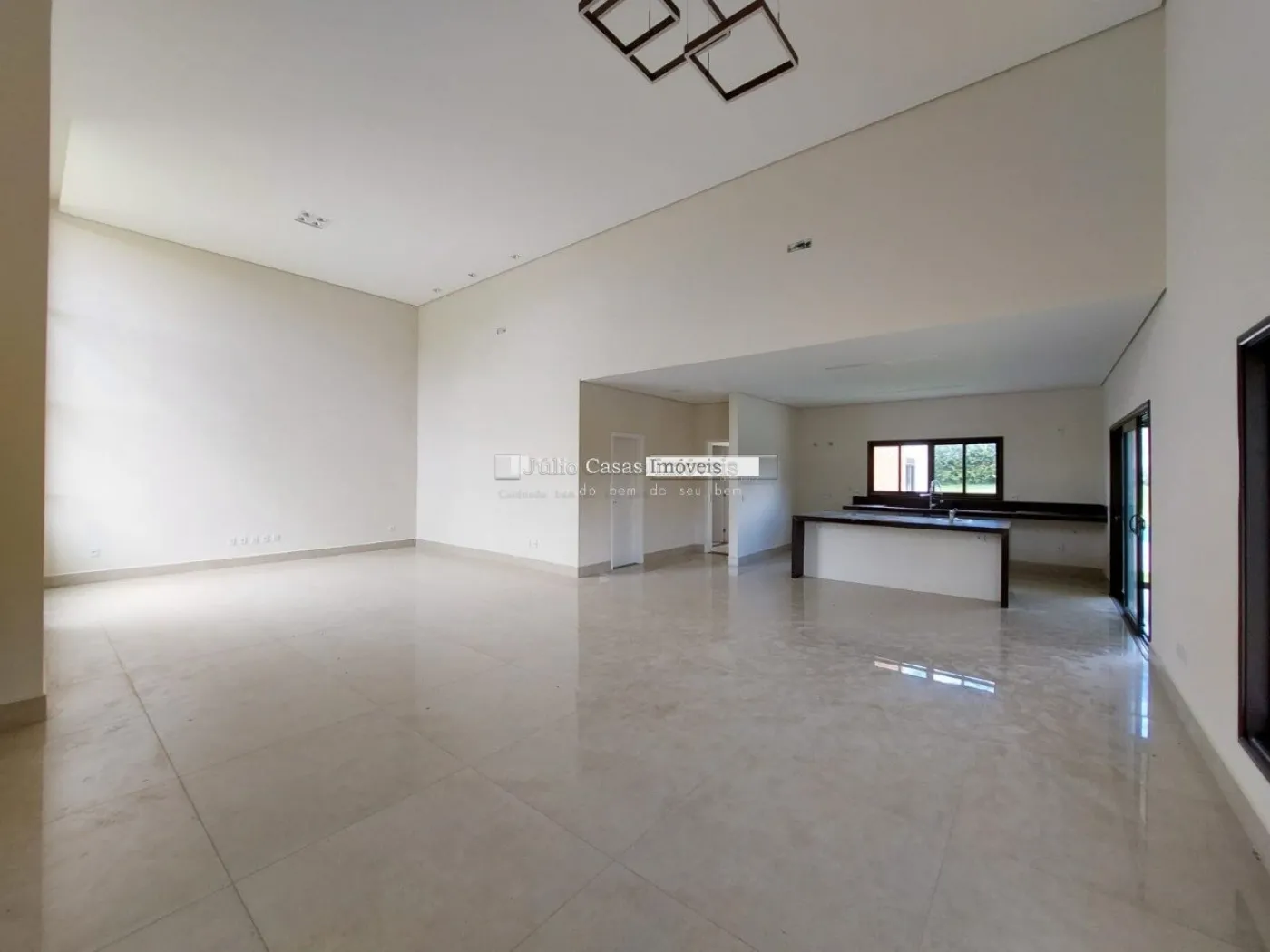 Casa térrea em condomínio de alto padrão. A residência dispõe de uma sala com três ambientes e pé-direito duplo, proporcionando um ambiente espaçoso e arejado. Há um lavabo de fácil acesso.