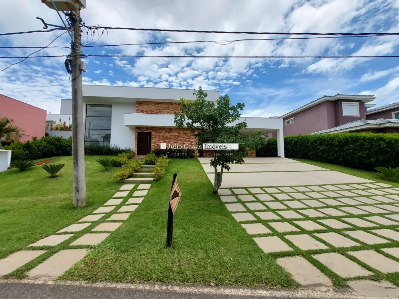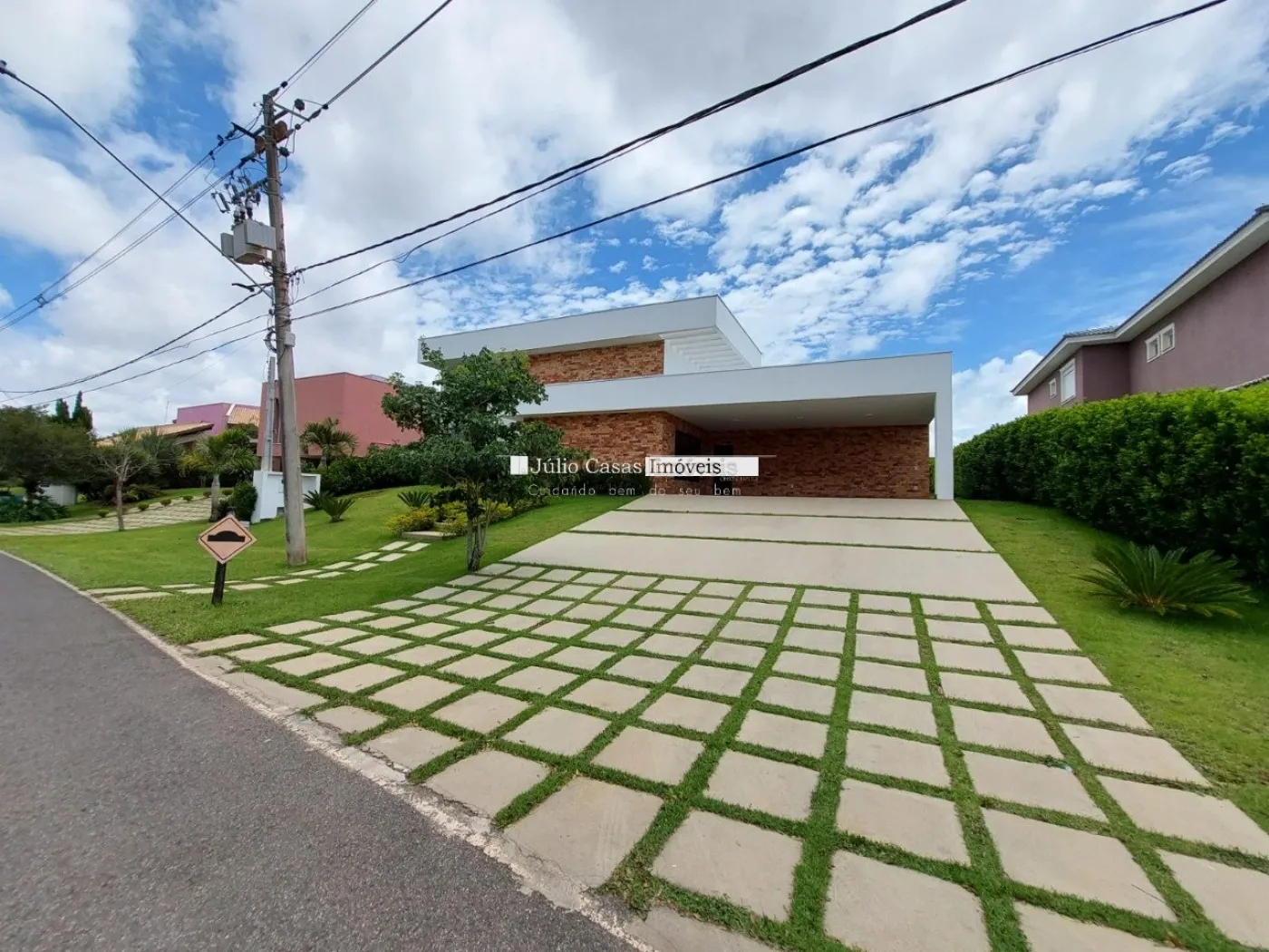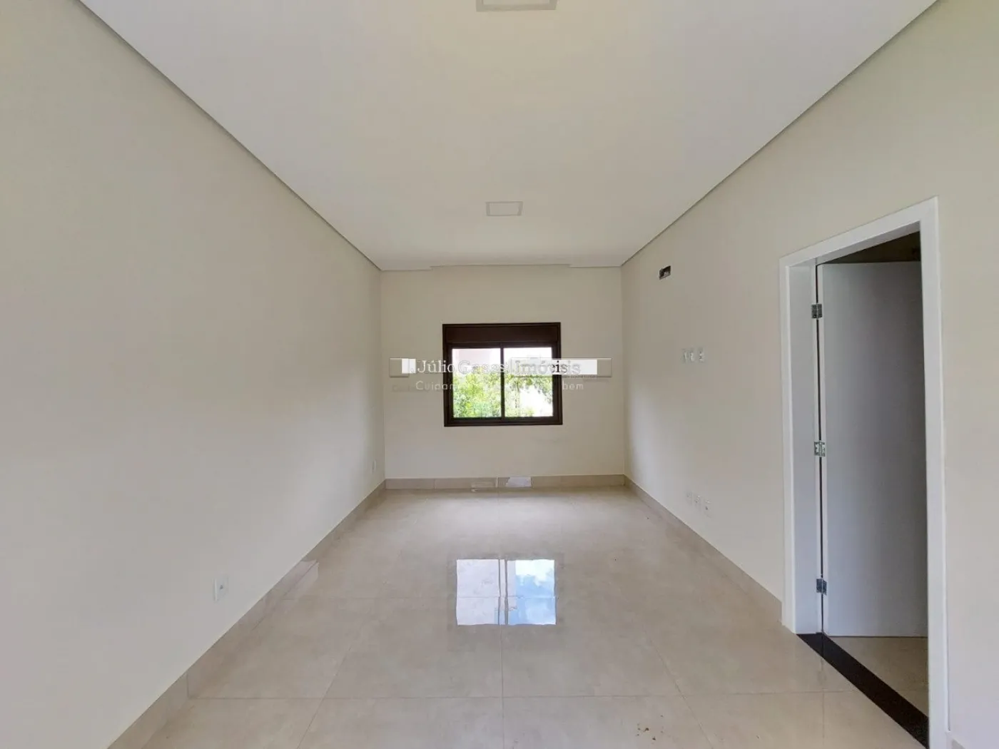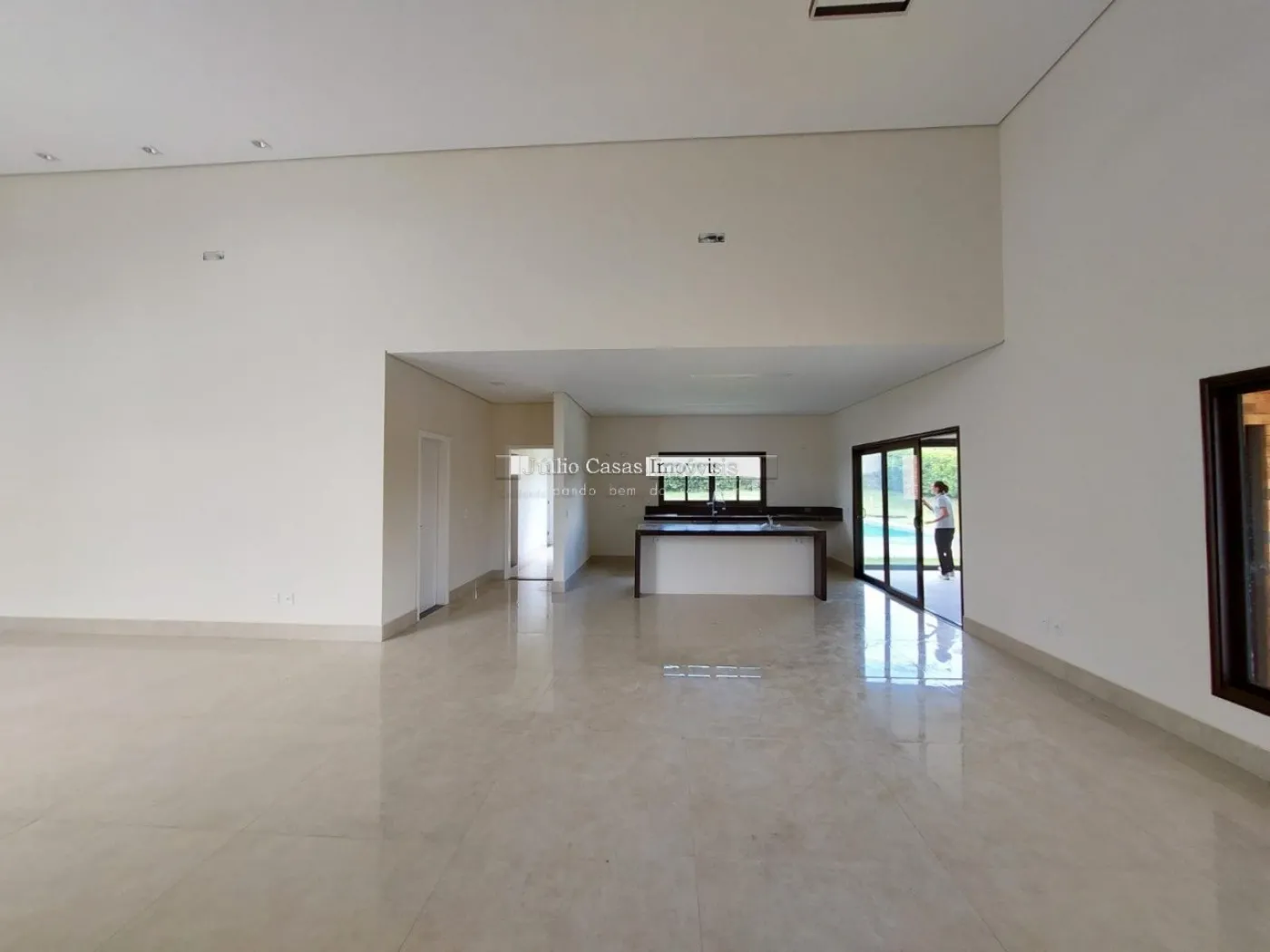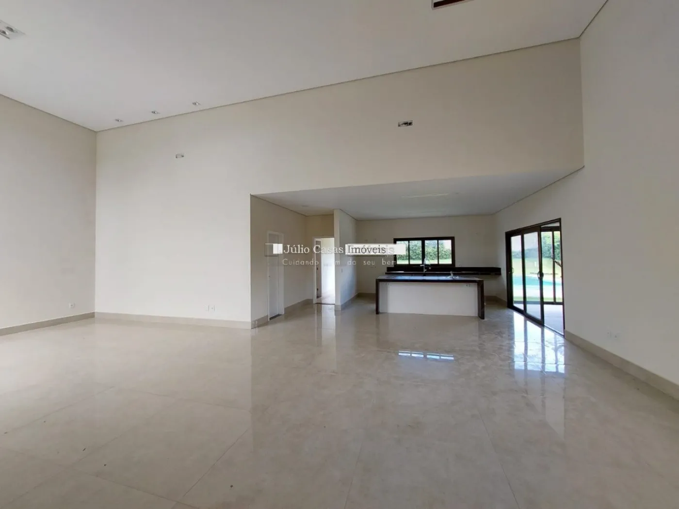 Casa térrea em condomínio de alto padrão. A residência dispõe de uma sala com três ambientes e pé-direito duplo, proporcionando um ambiente espaçoso e arejado. Há um lavabo de fácil acesso.