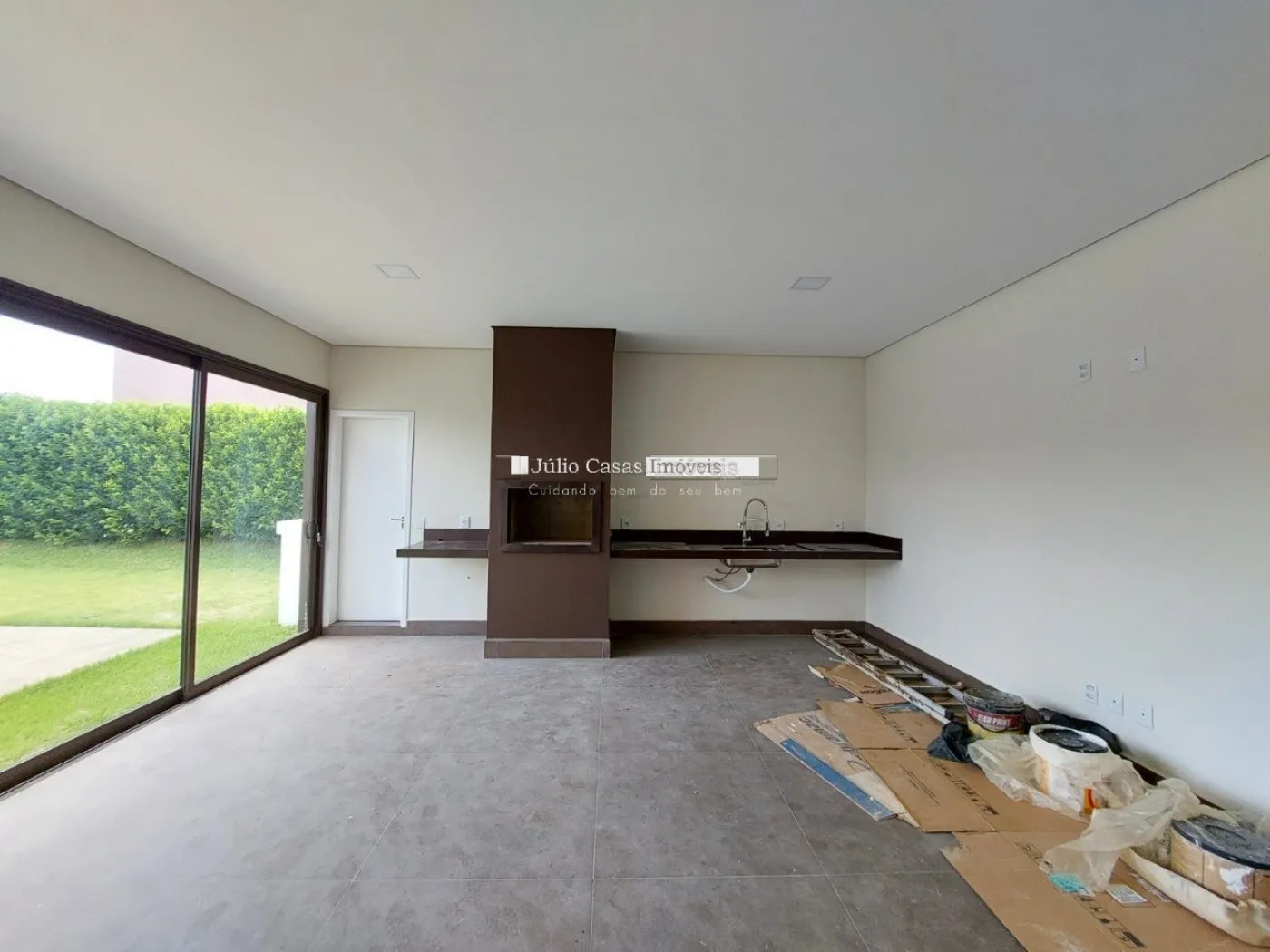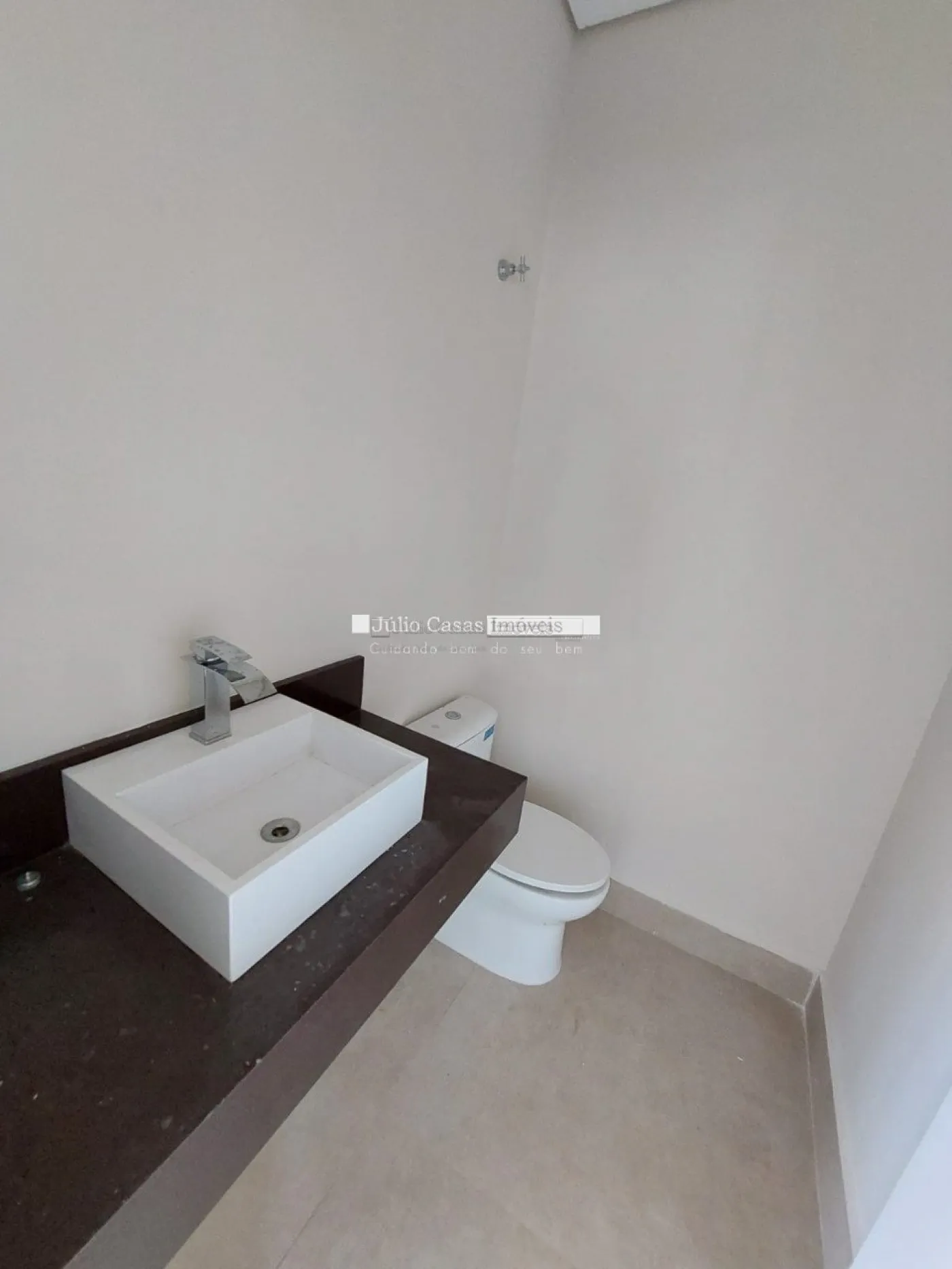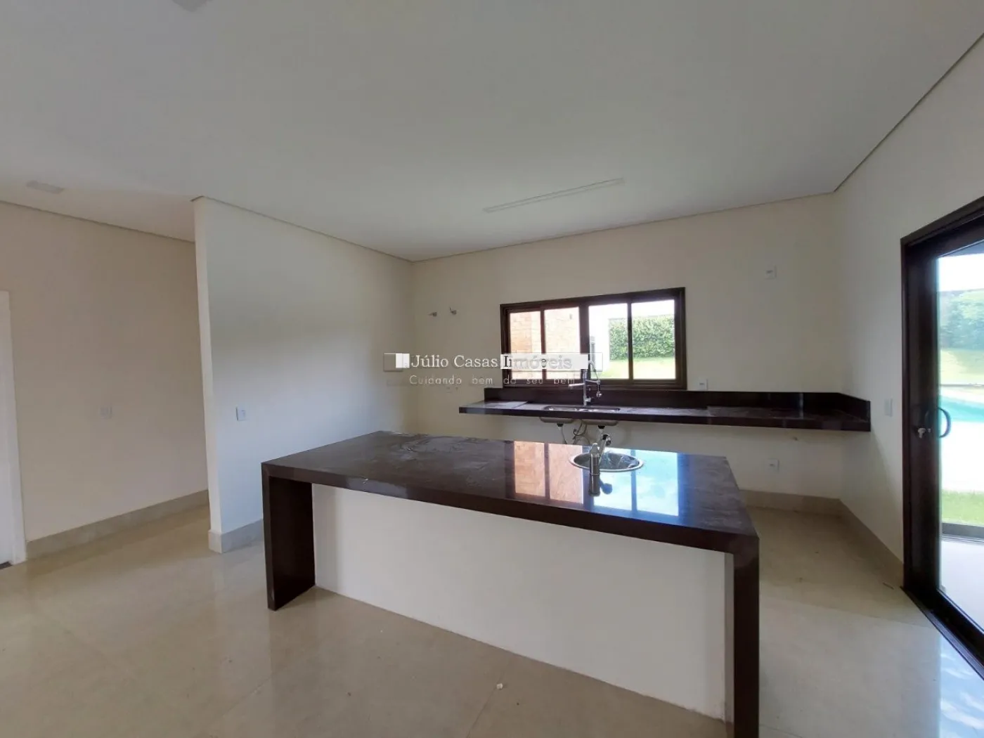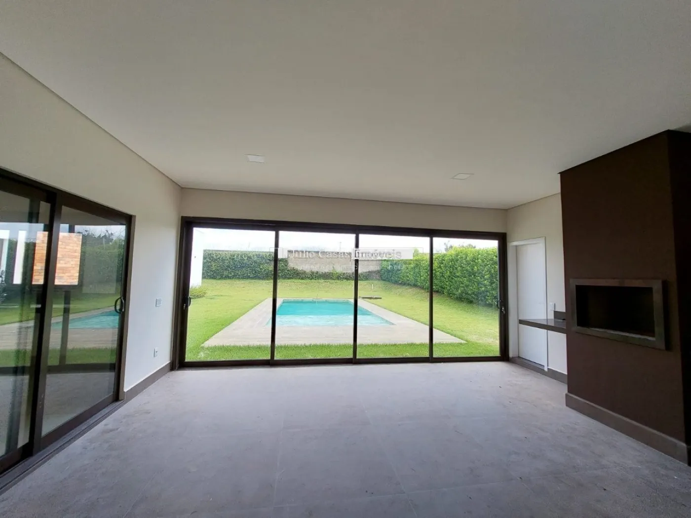 Casa térrea em condomínio de alto padrão. A residência dispõe de uma sala com três ambientes e pé-direito duplo, proporcionando um ambiente espaçoso e arejado. Há um lavabo de fácil acesso.