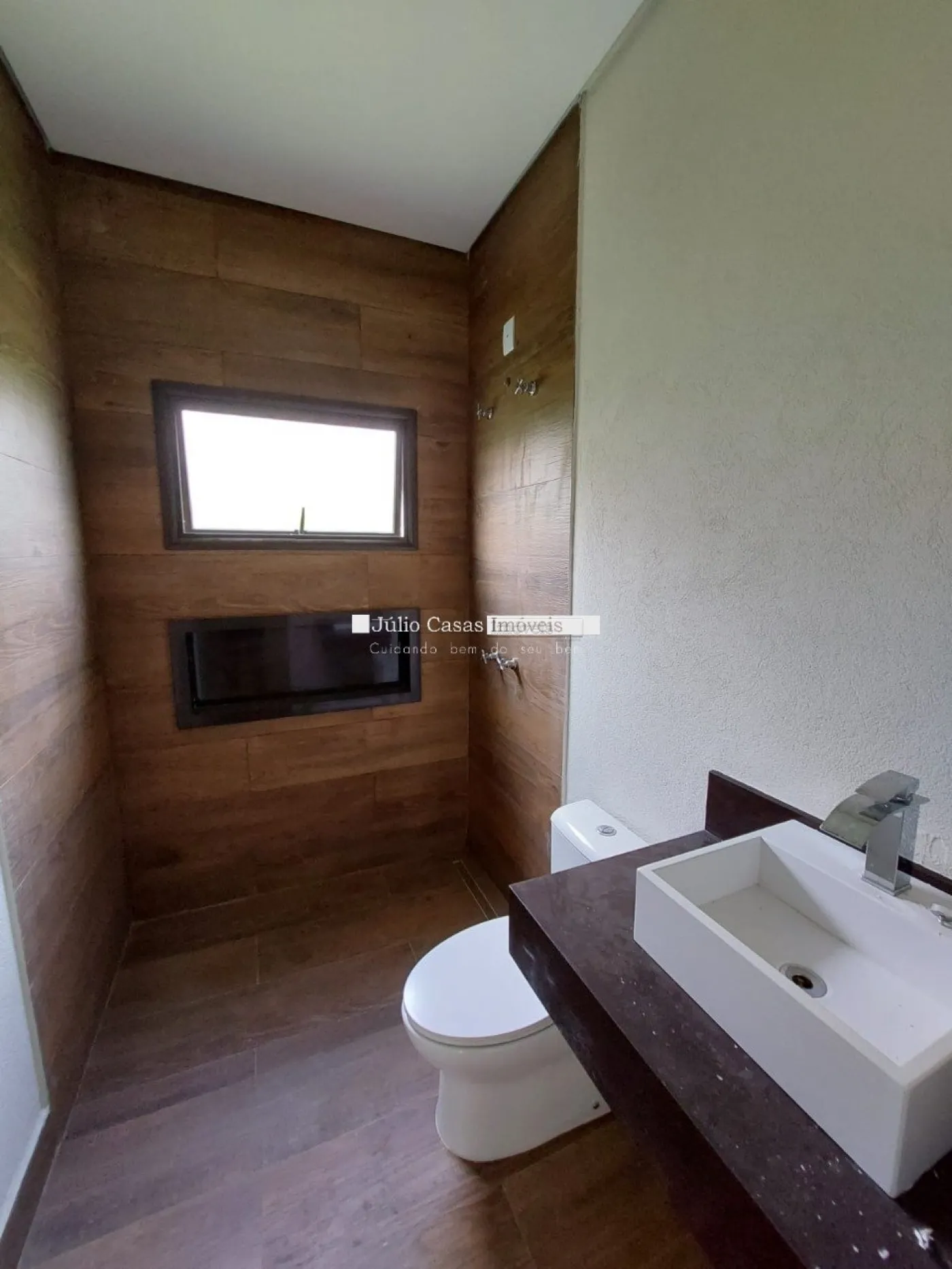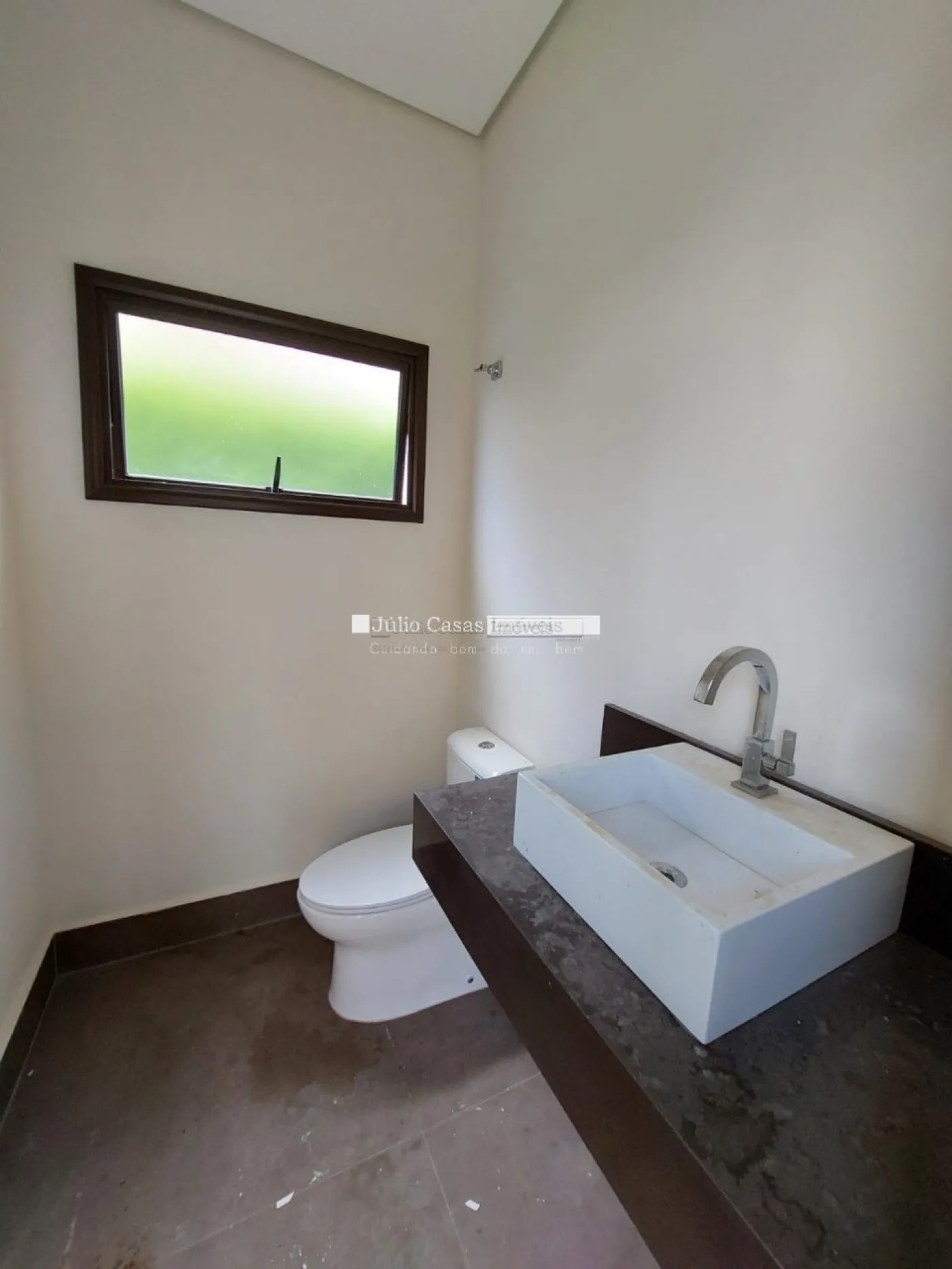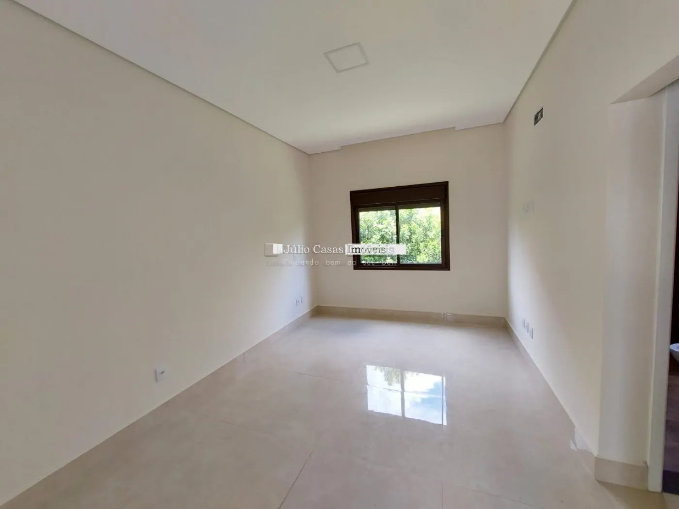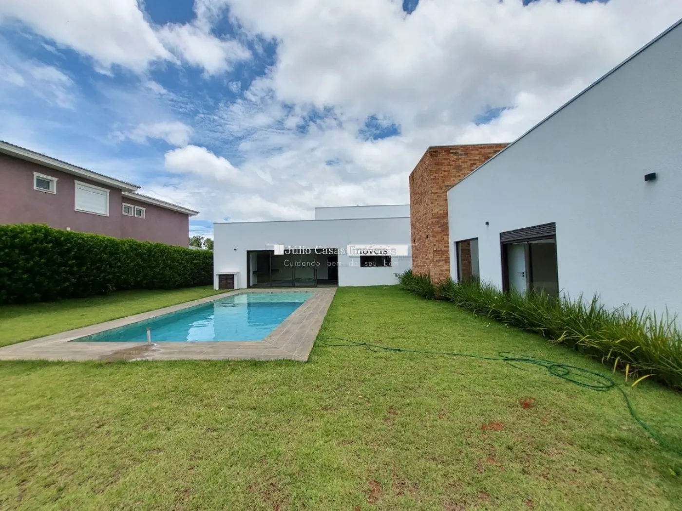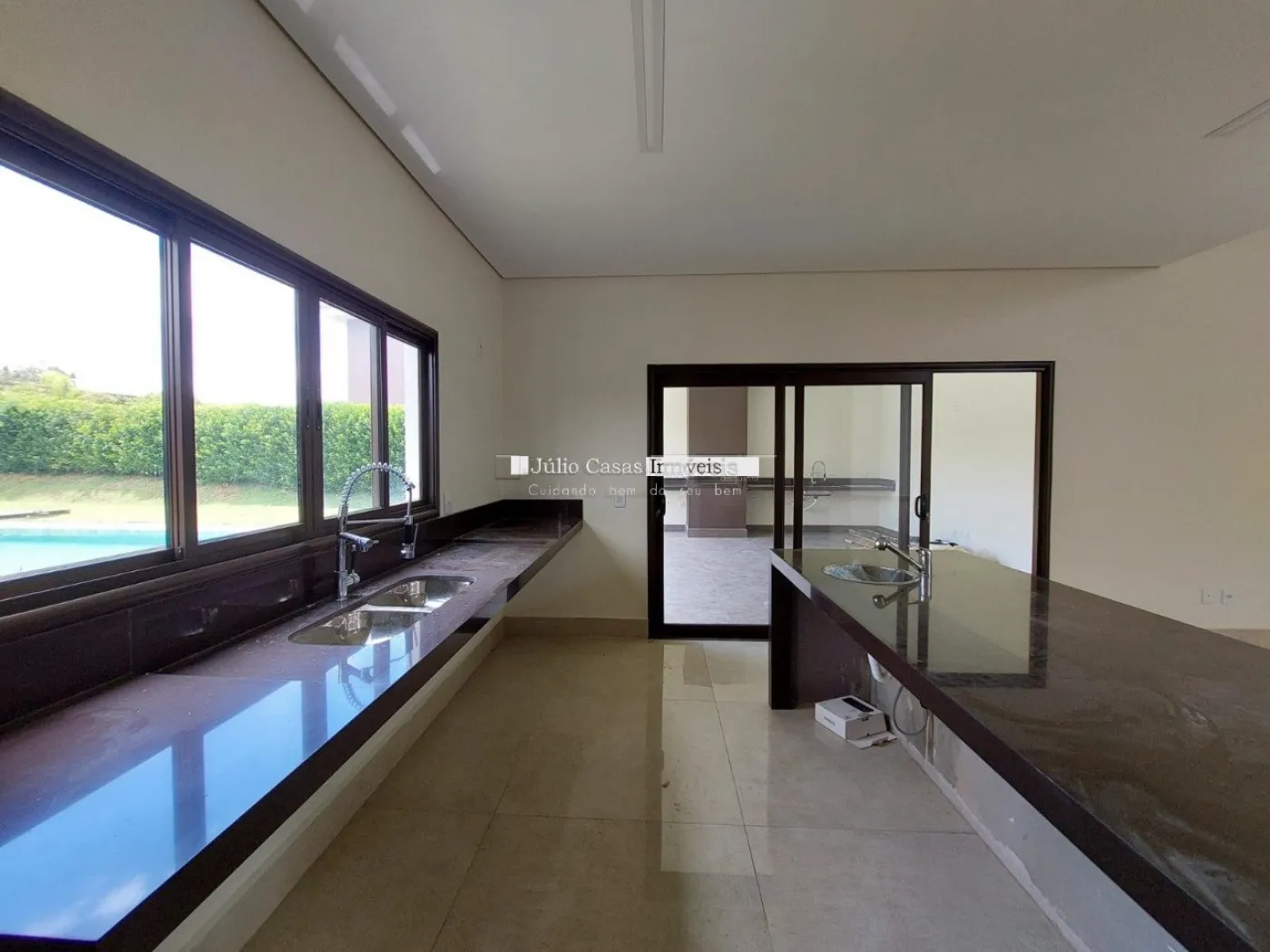 Casa térrea em condomínio de alto padrão. A residência dispõe de uma sala com três ambientes e pé-direito duplo, proporcionando um ambiente espaçoso e arejado. Há um lavabo de fácil acesso.
