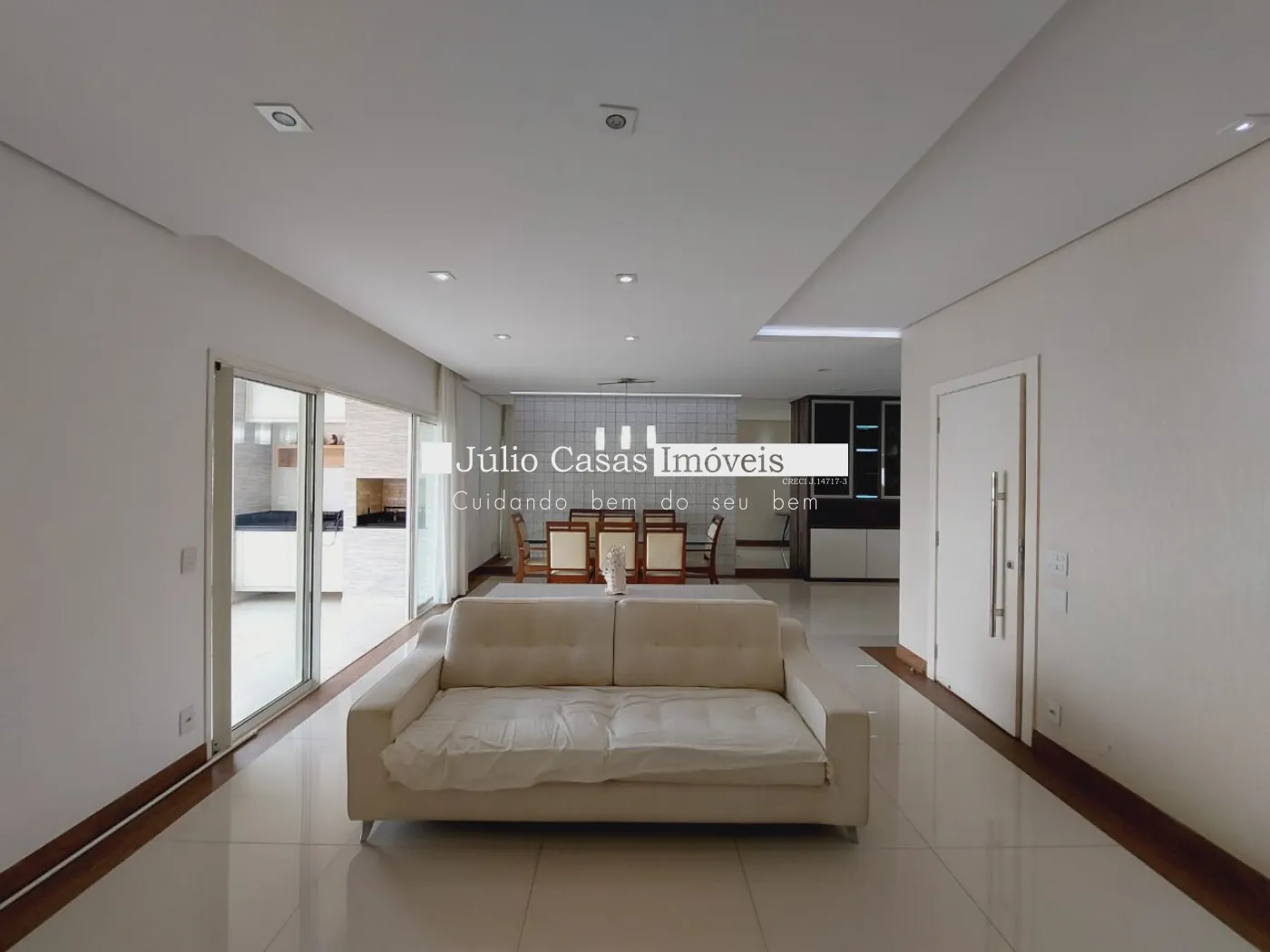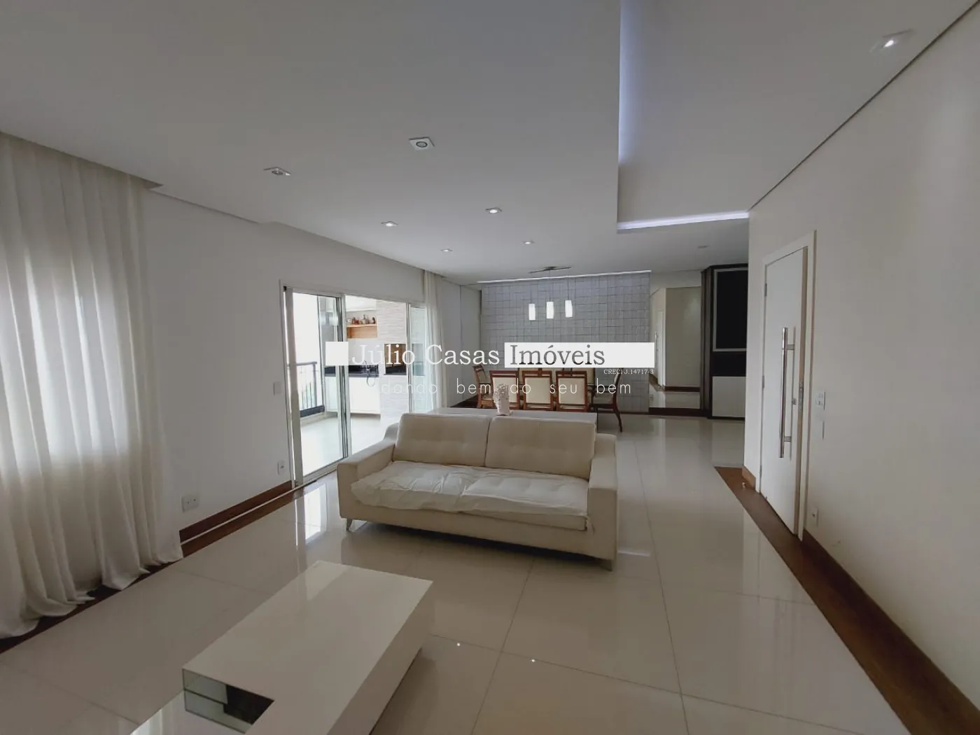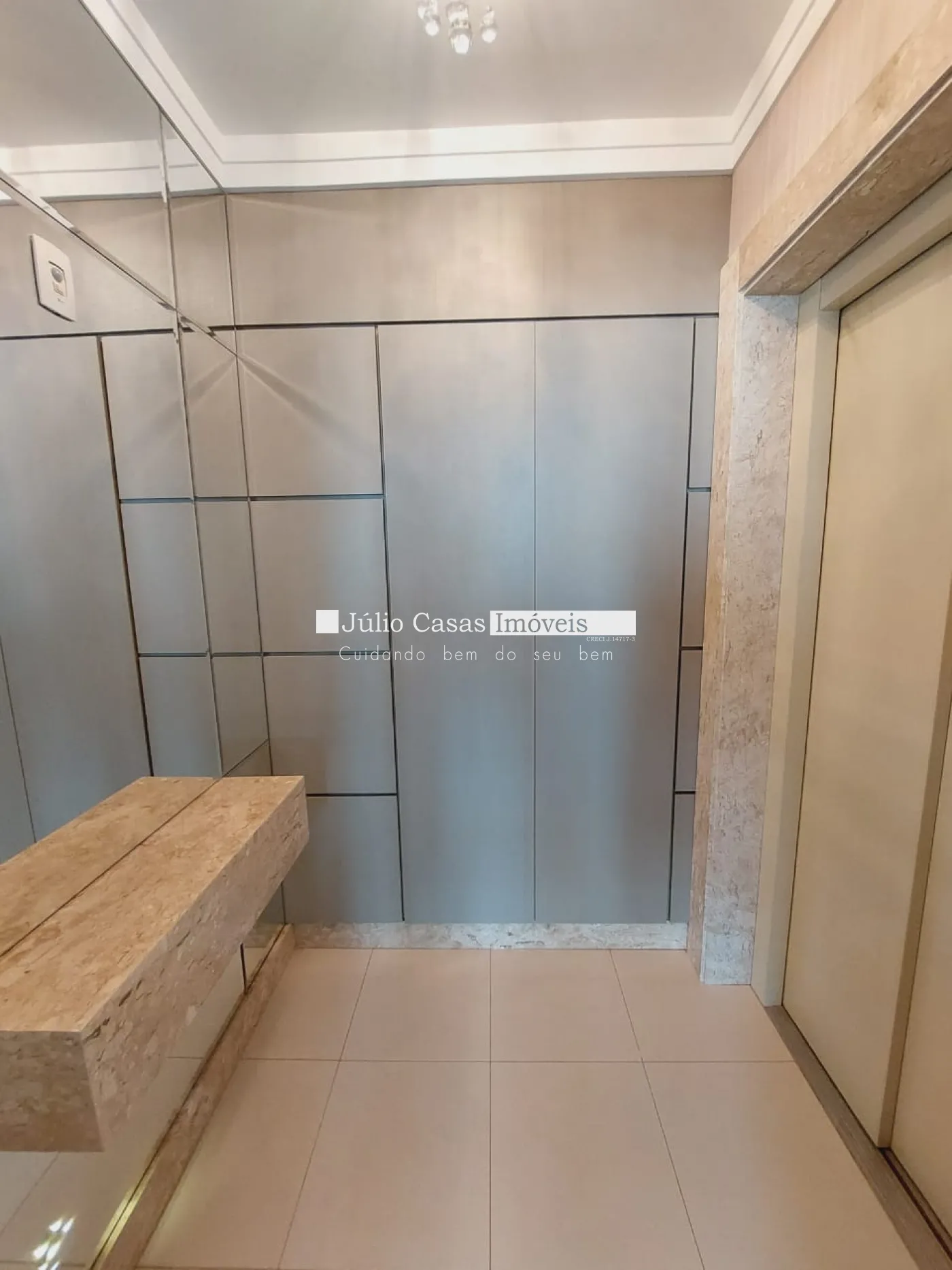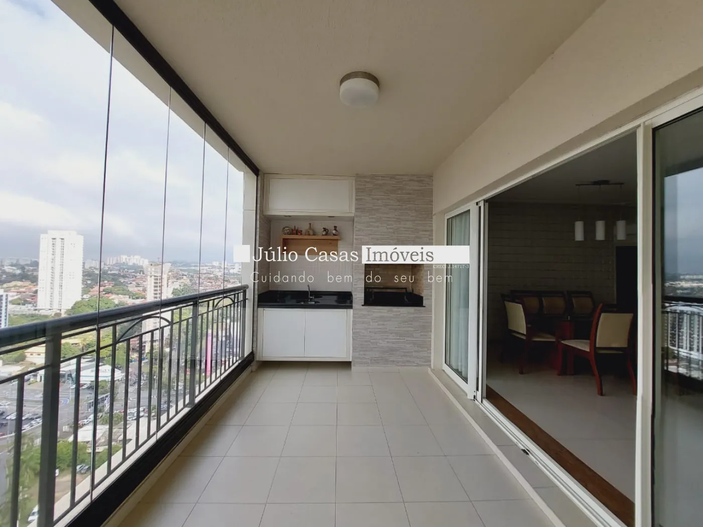 Amplo e sofisticado, com sala para 3 ambientes em porcelanato e iluminação LED, lavabo com pia em mármore travertino, e varanda gourmet envidraçada com churrasqueira e pia com armário.