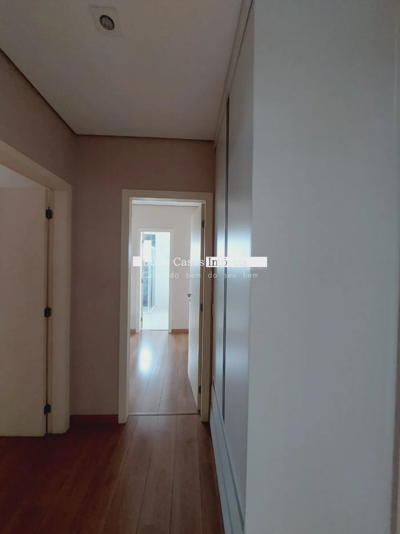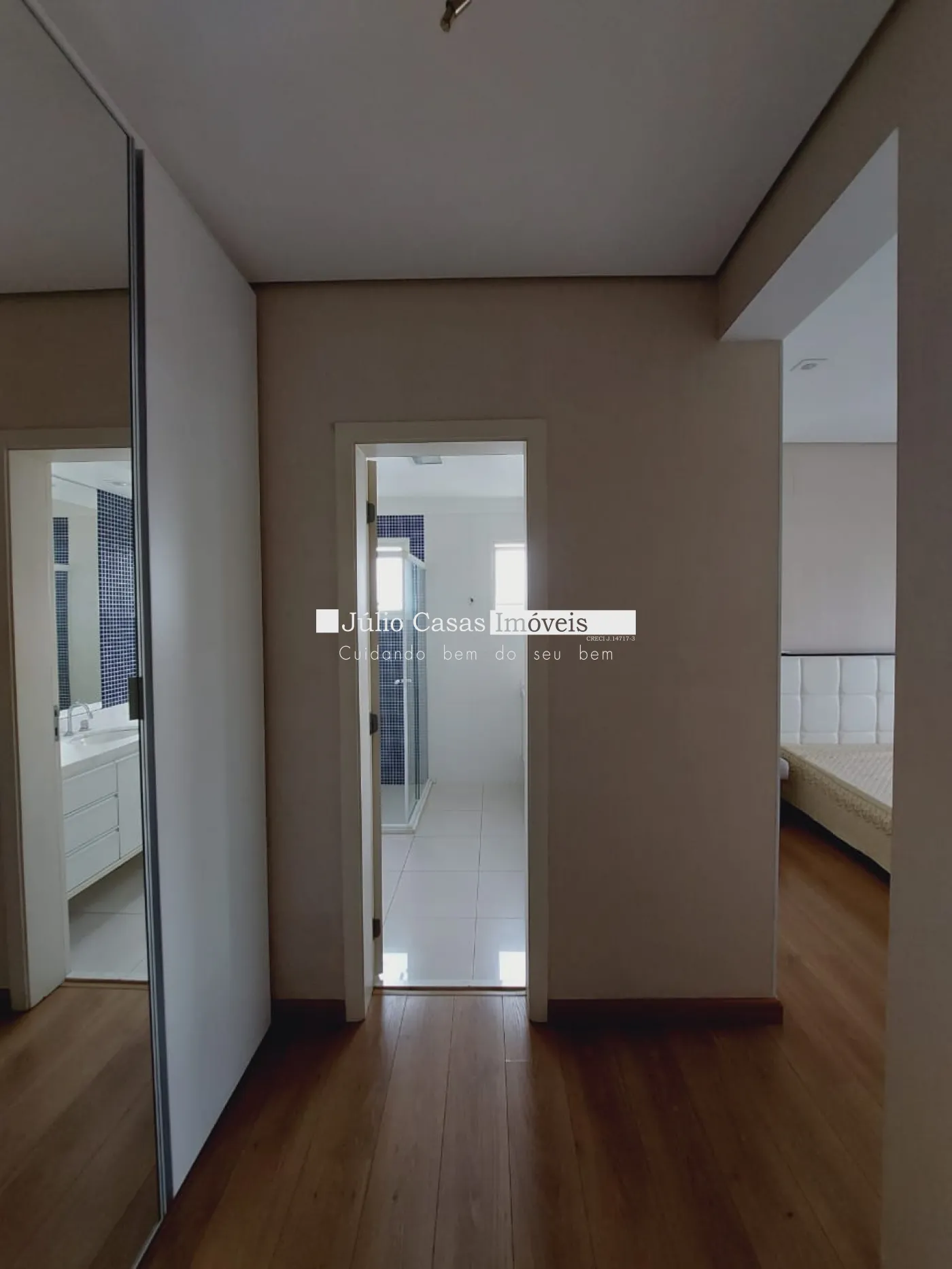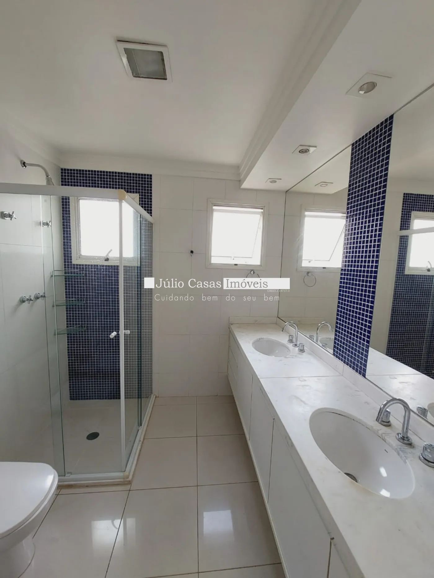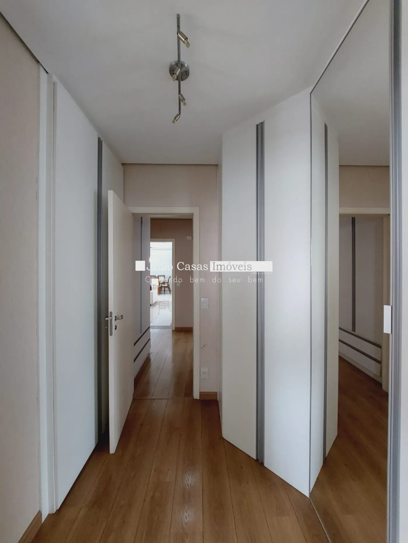 São 3 suítes com piso laminado, armários planejados e varanda; banheiros com box de vidro e gabinetes.
