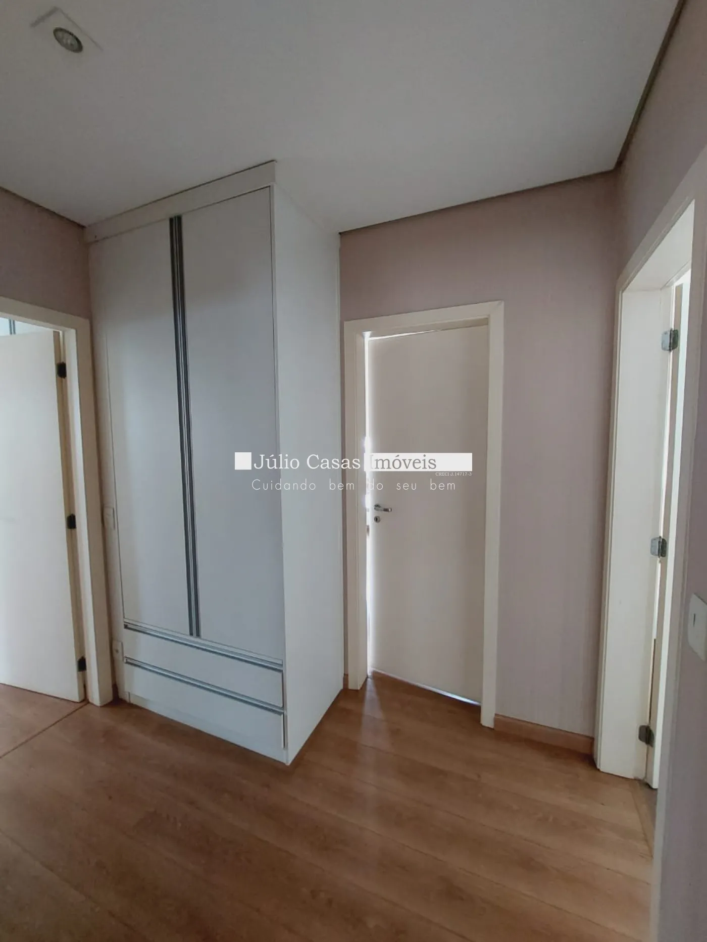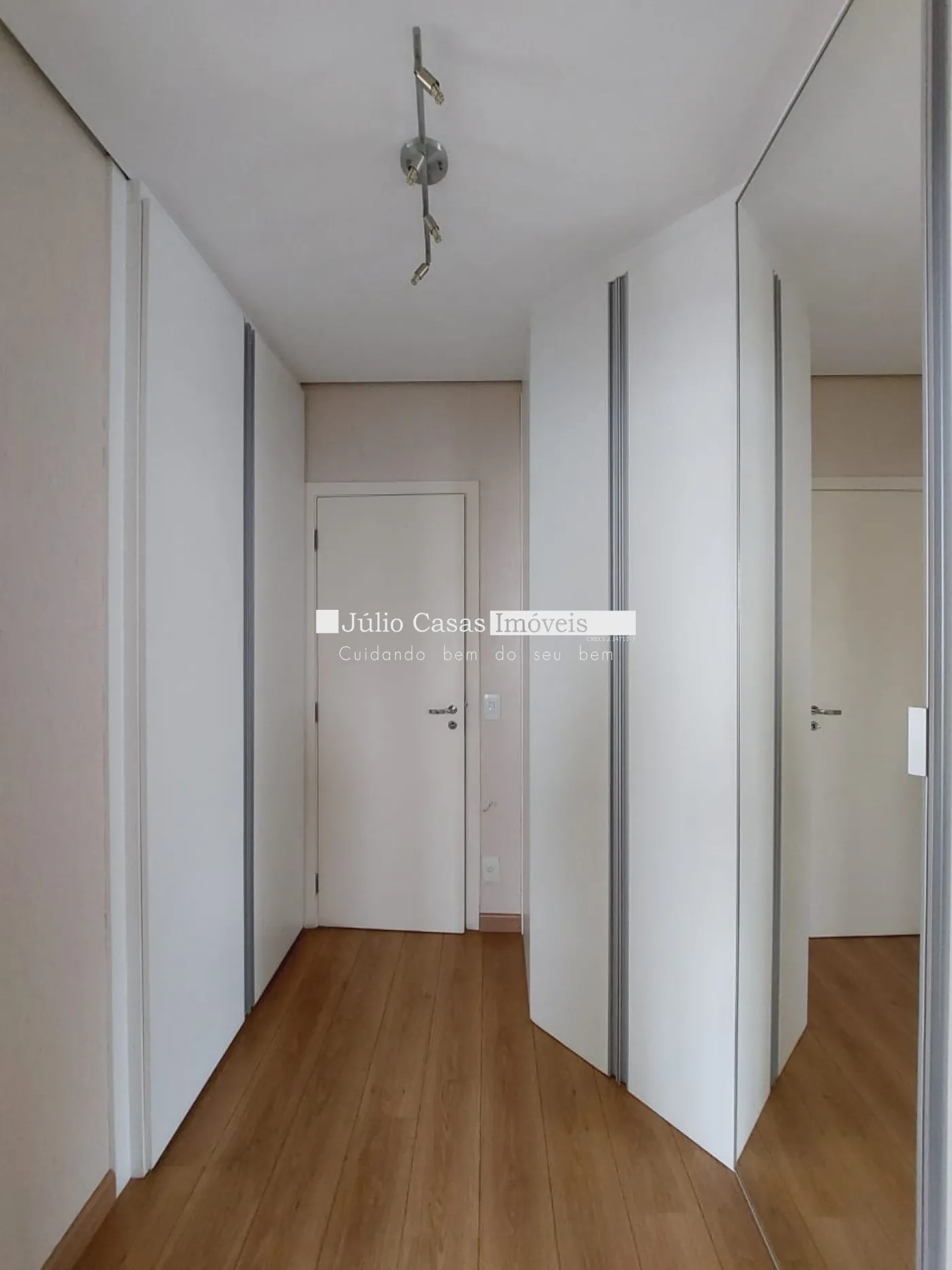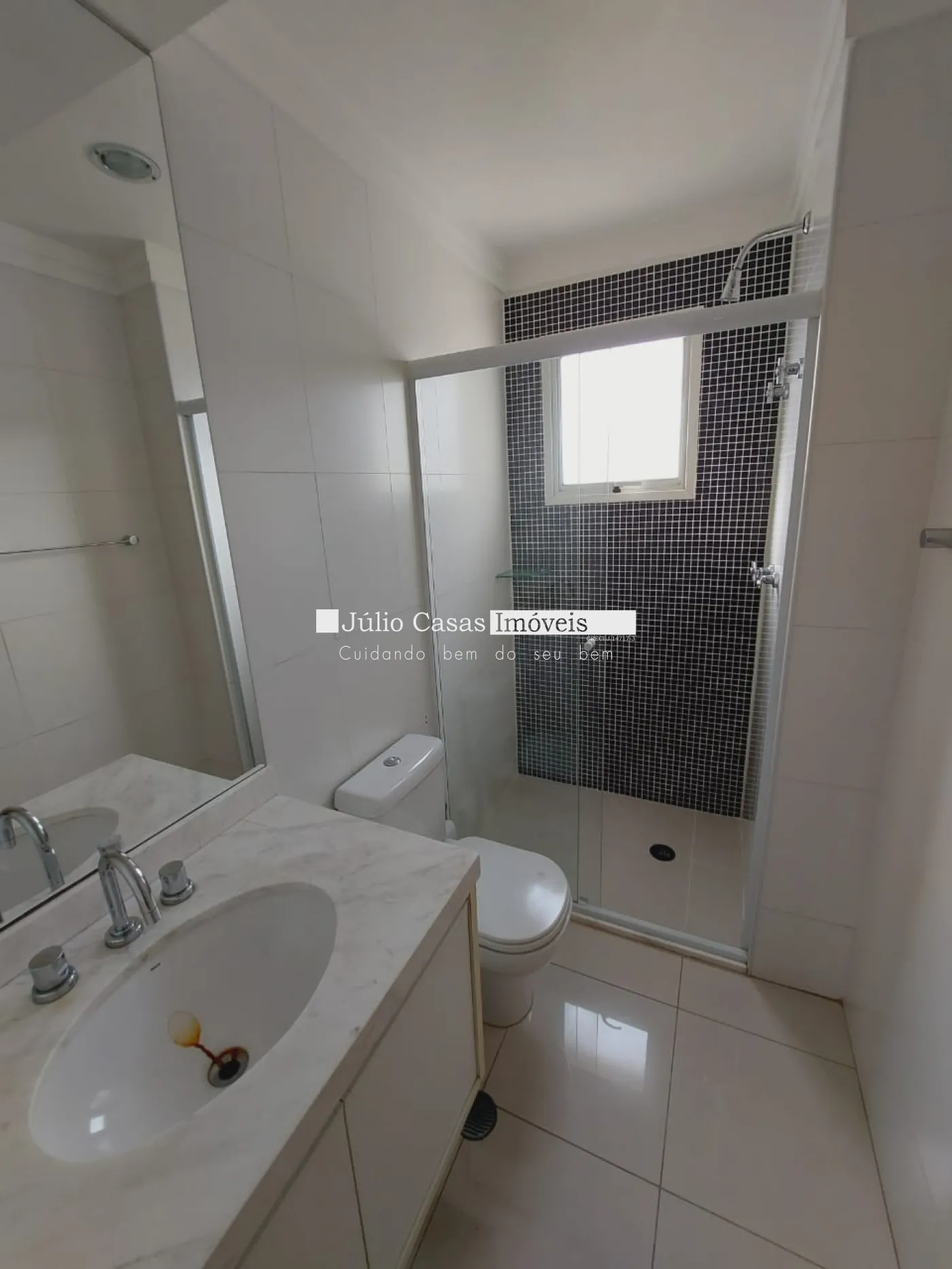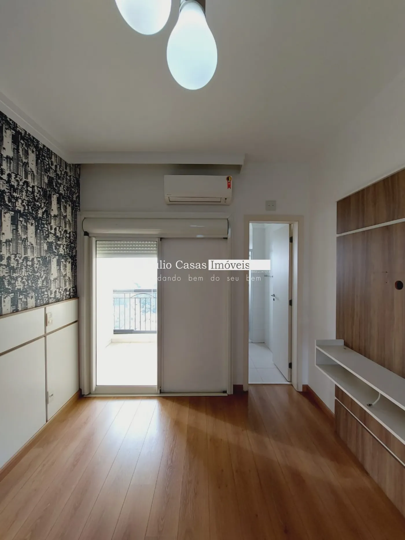 São 3 suítes com piso laminado, armários planejados e varanda; banheiros com box de vidro e gabinetes.