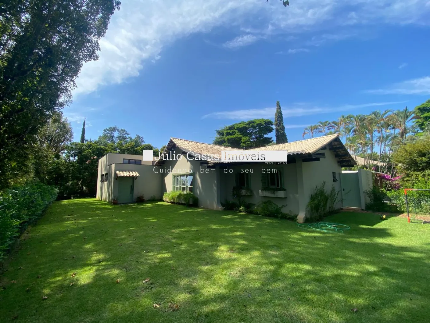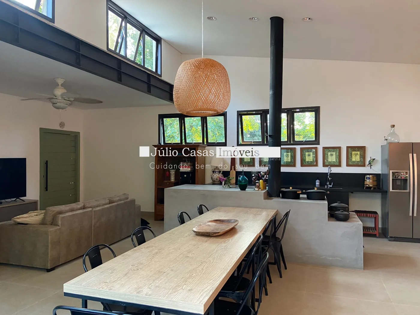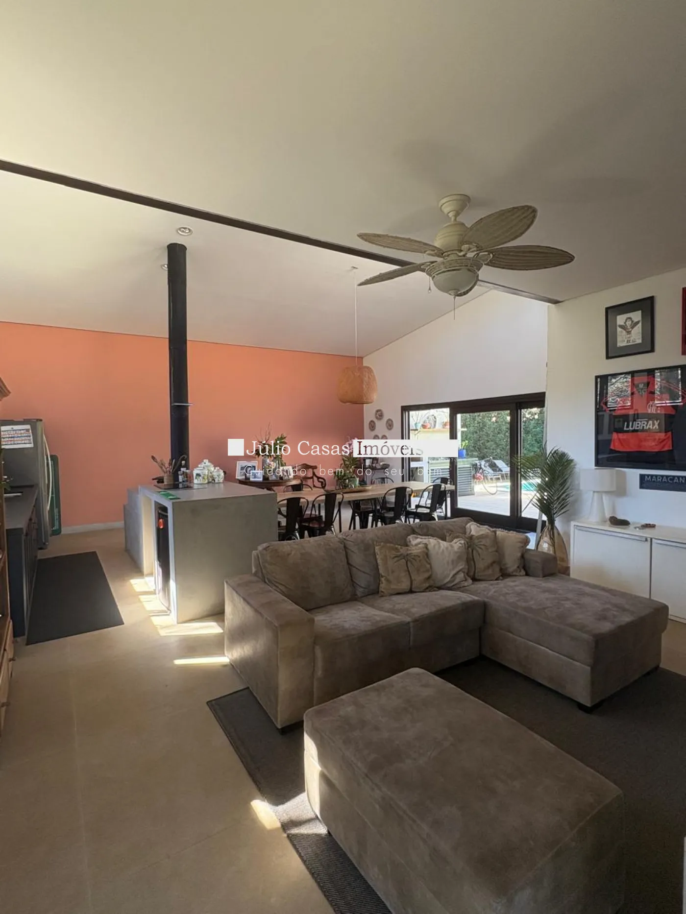 Casa térrea com sala com lareira, lavabo, escritório, depósito, 4 suítes com ar condicionado e todas com armários planejados.