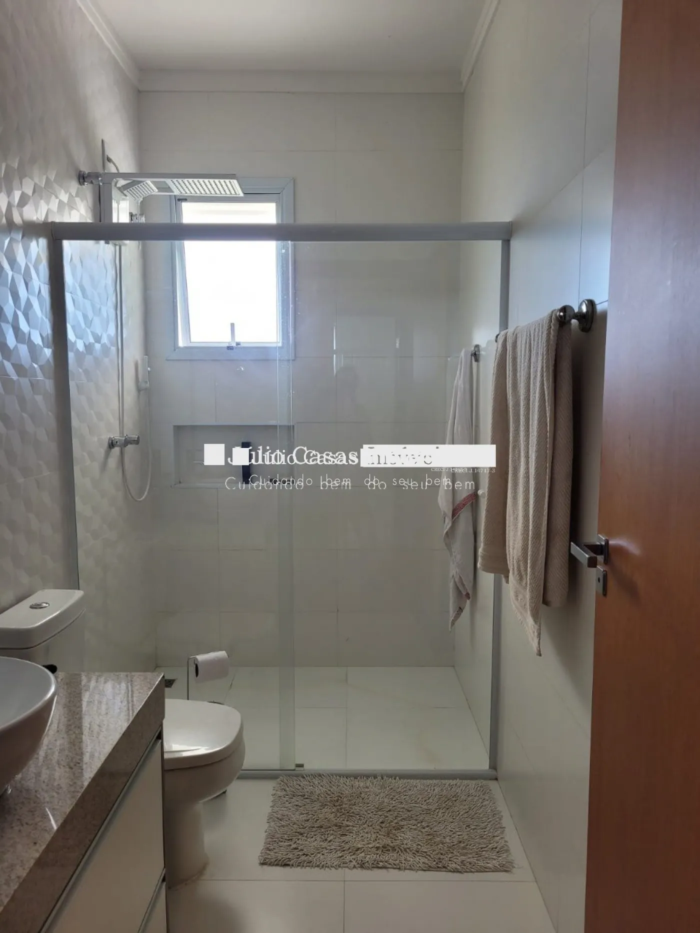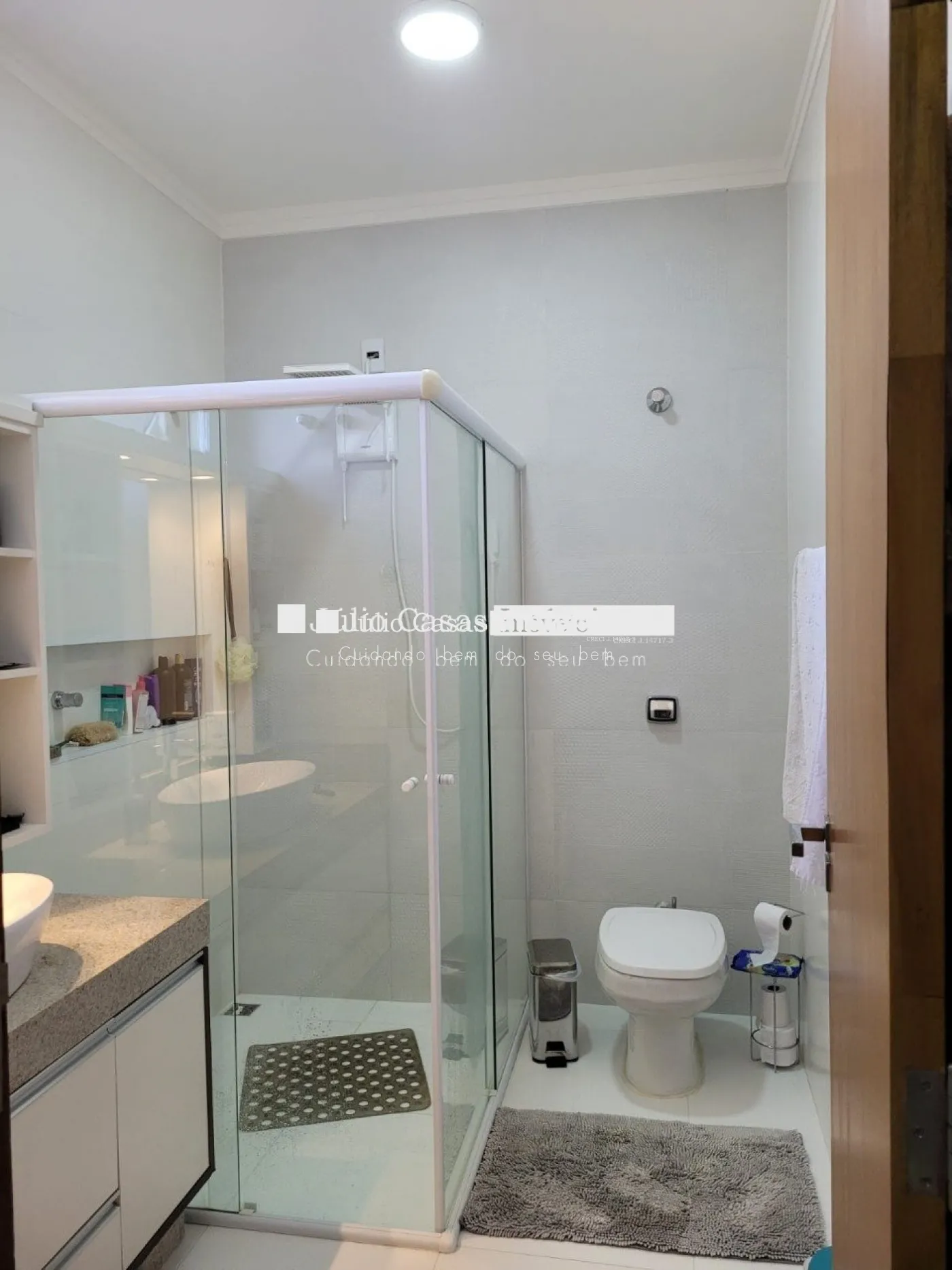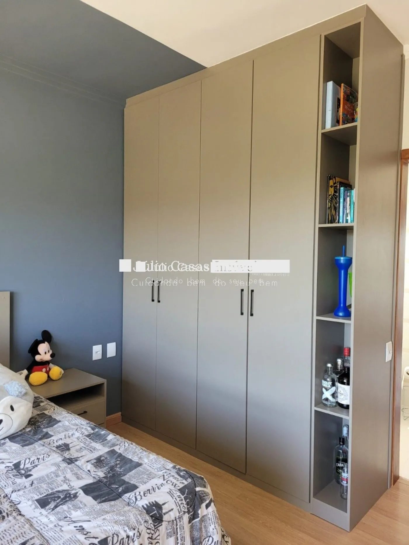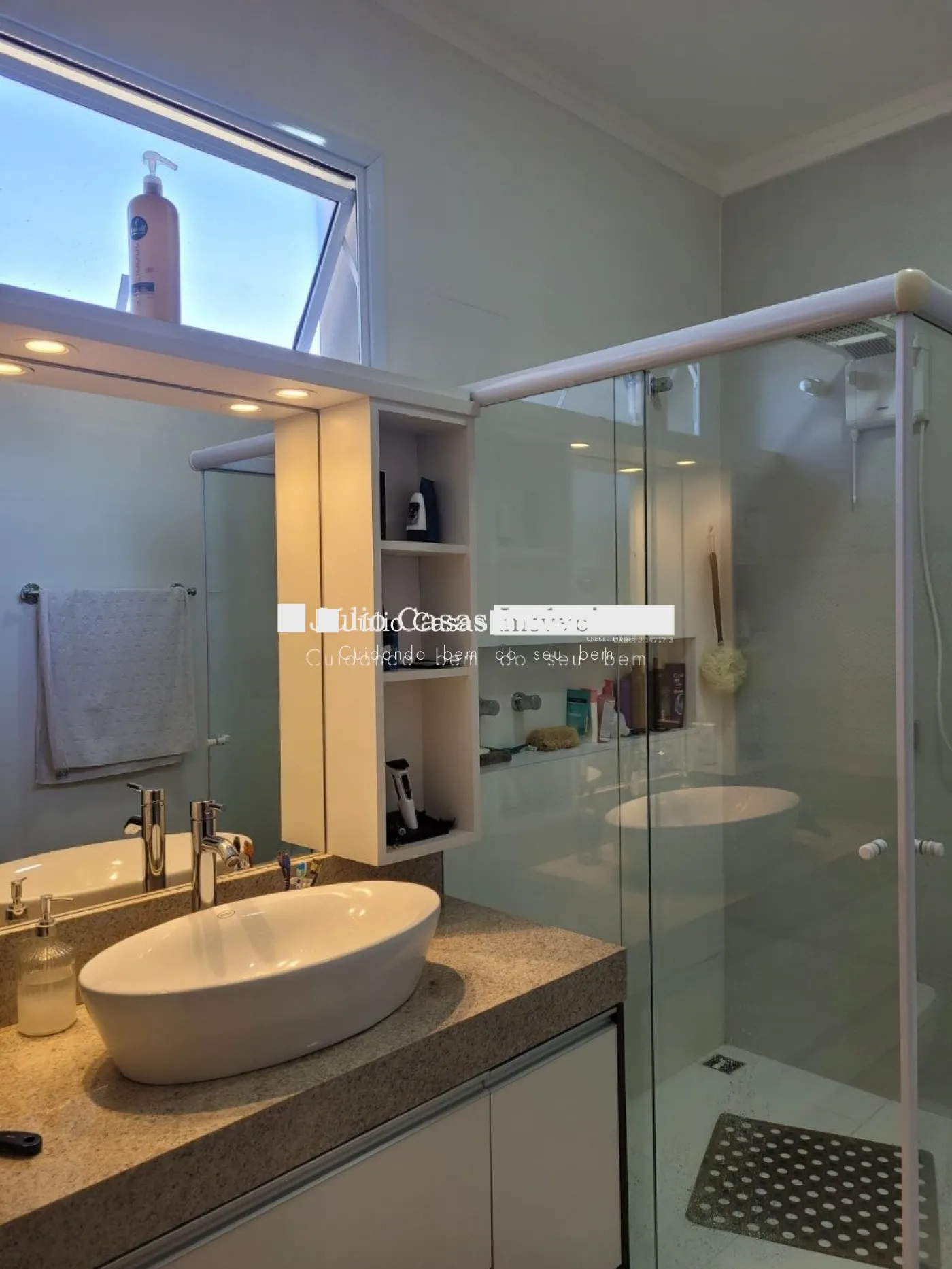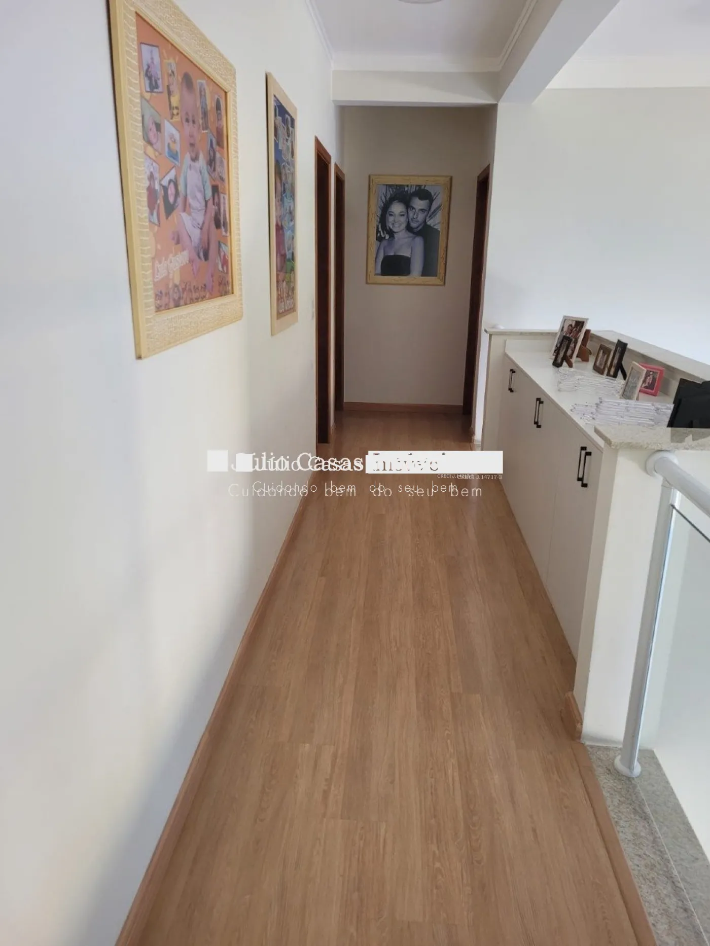 Andar superior com 3 suítes amplas com modulados, e closet, varanda, todos os banheiros com box em vidro e gabinetes, Garagem para 2 veículos cobertos e escritório.
