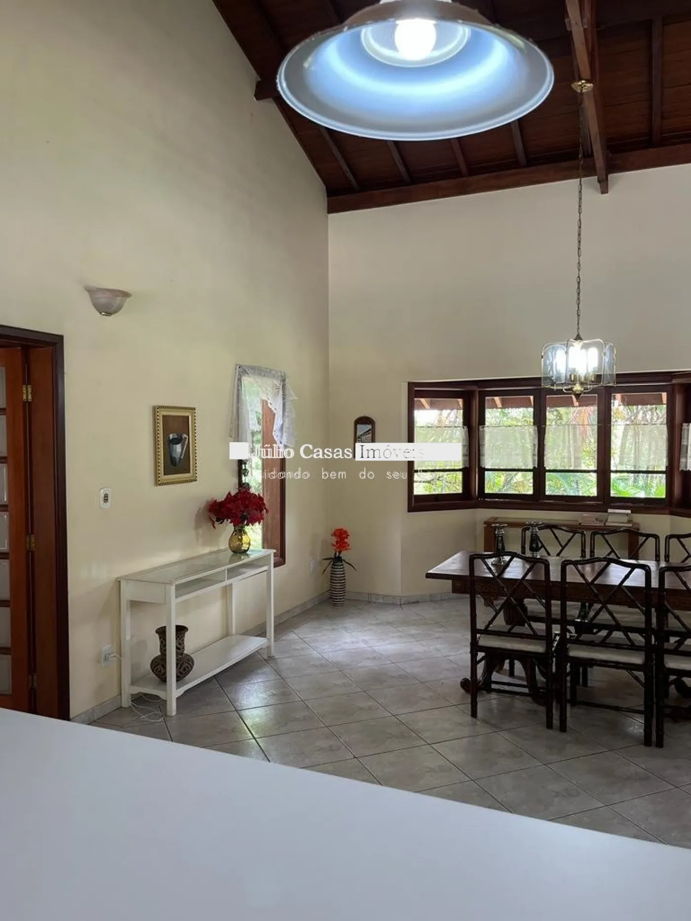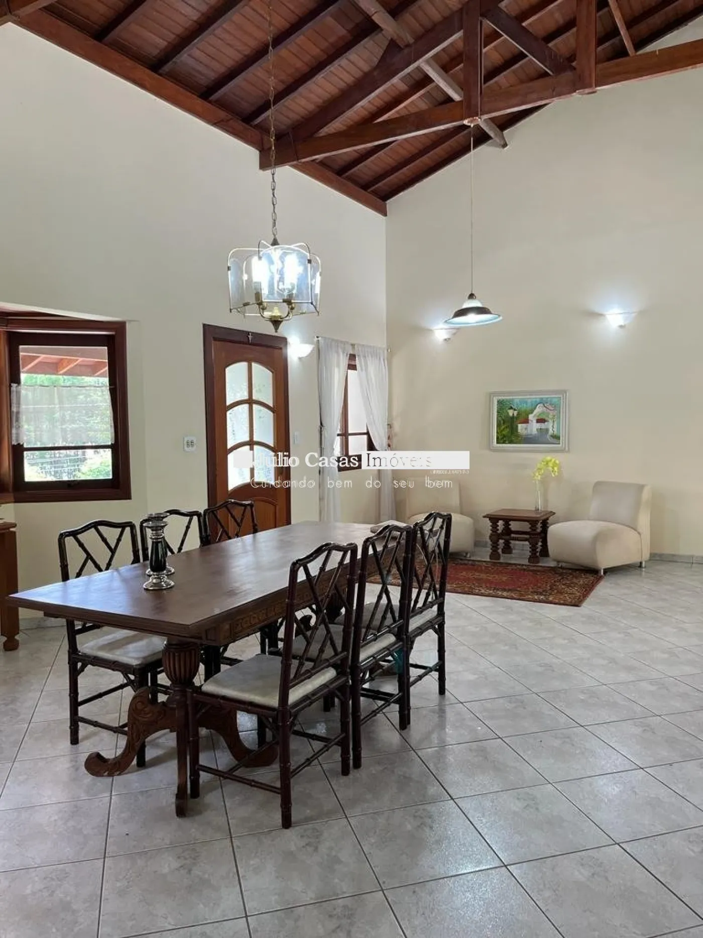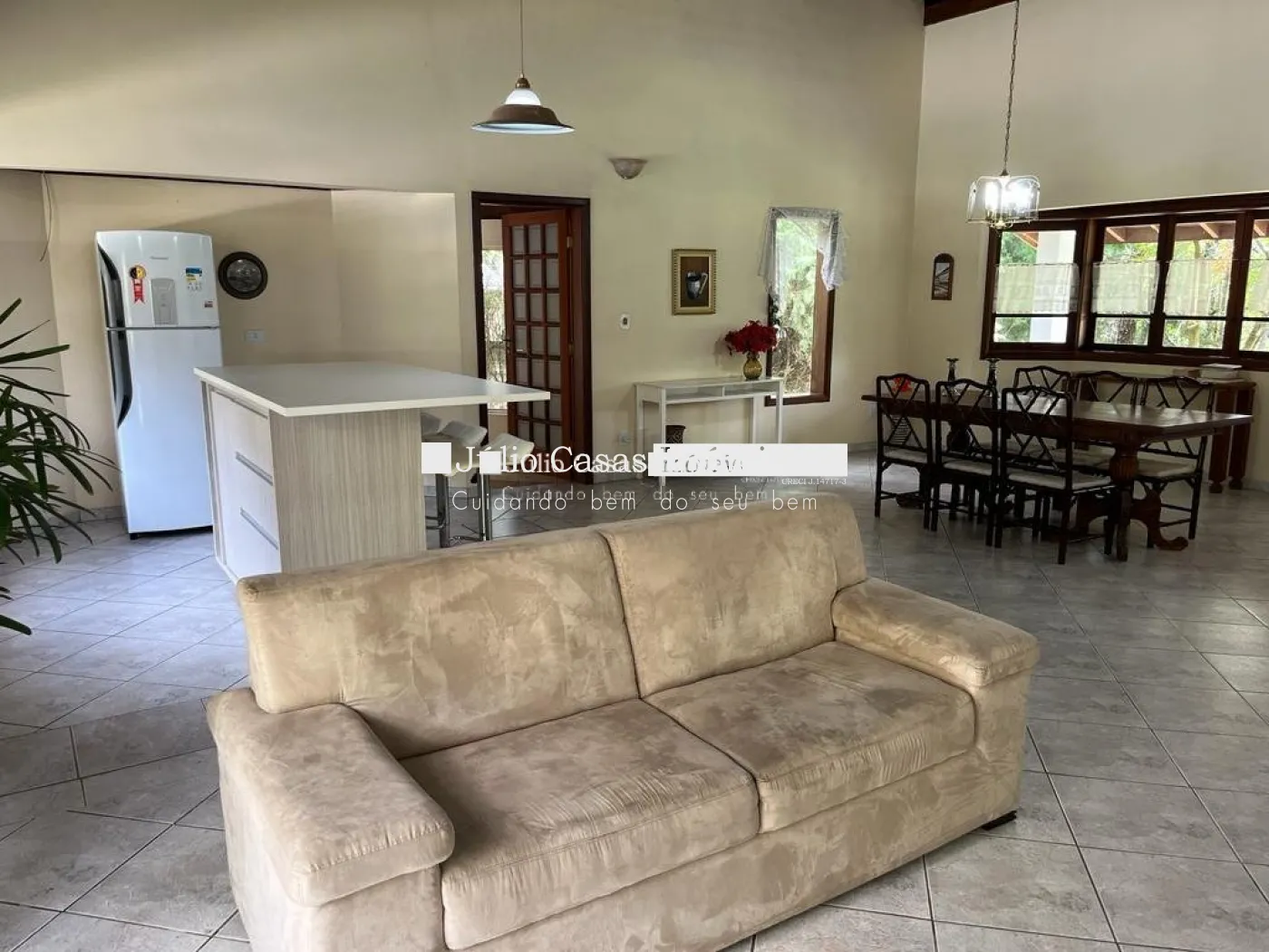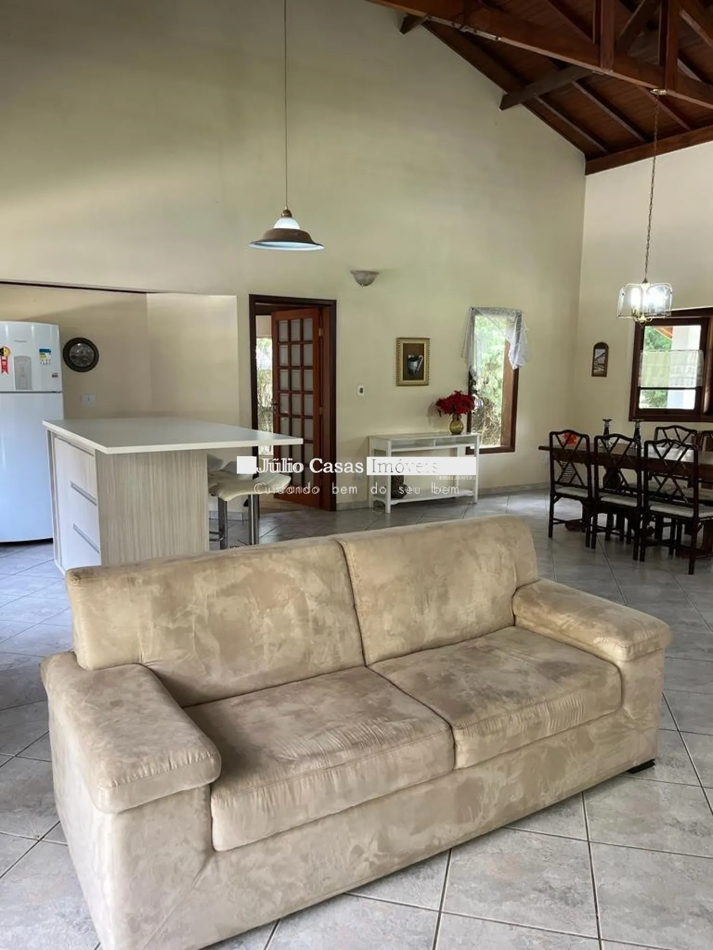 Sala para 2 ambientes com cozinha integrada. Pé direito alto.