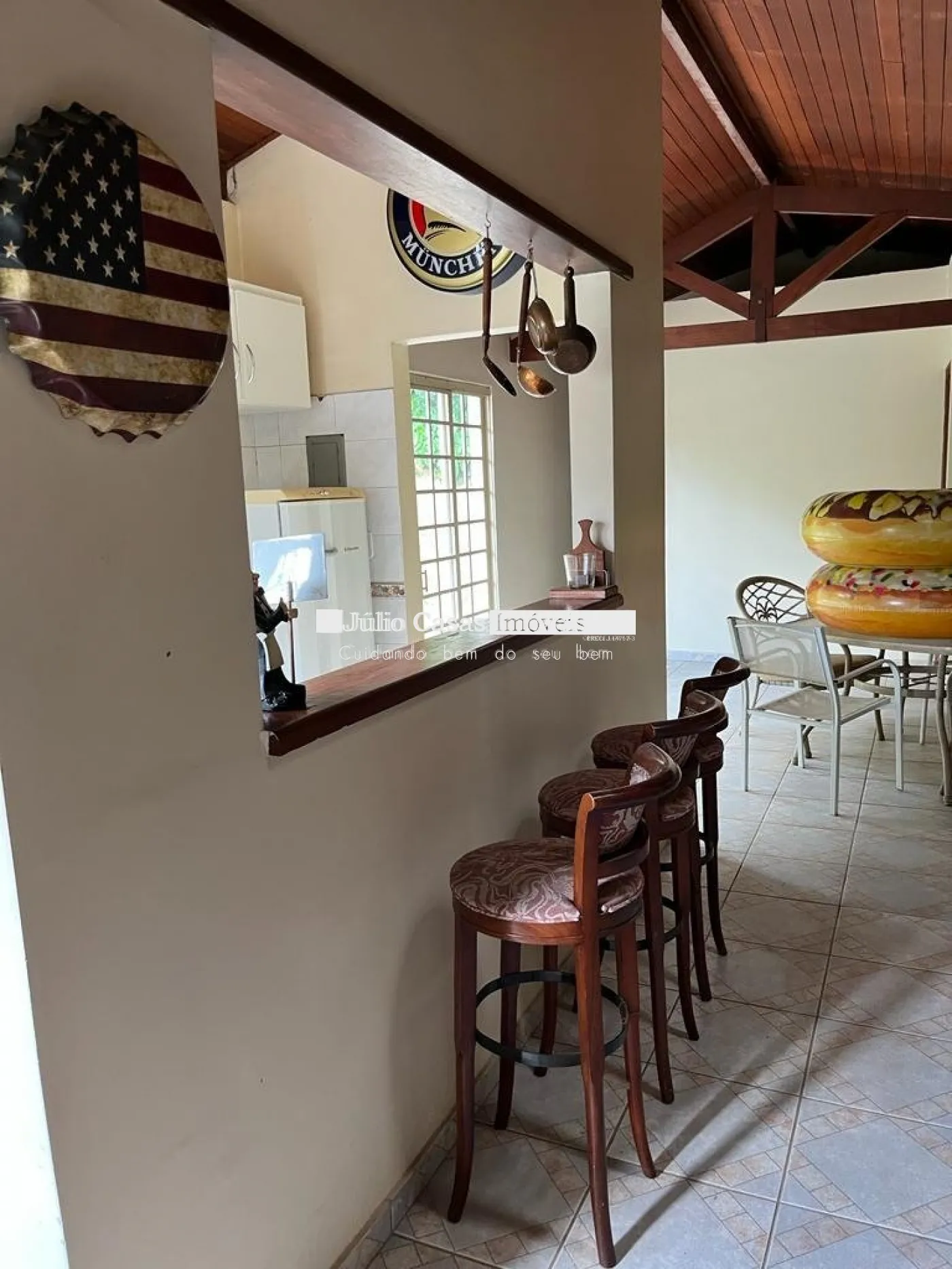 Área gourmet com churrasqueira, cozinha e banheiro.