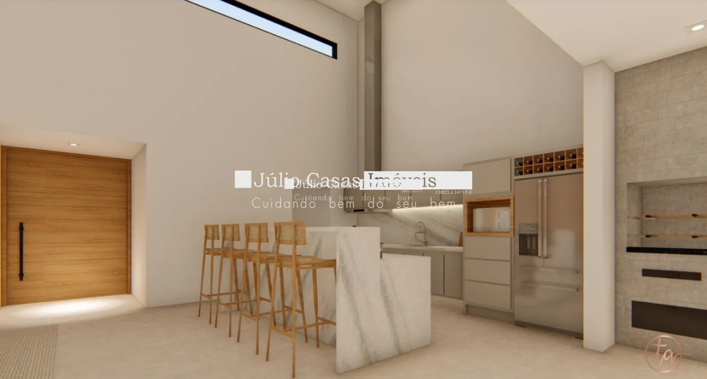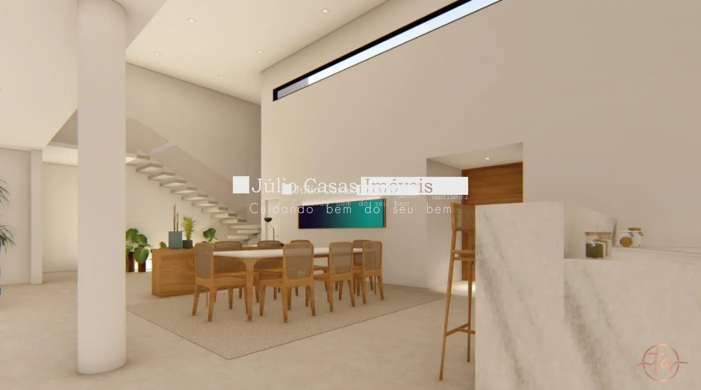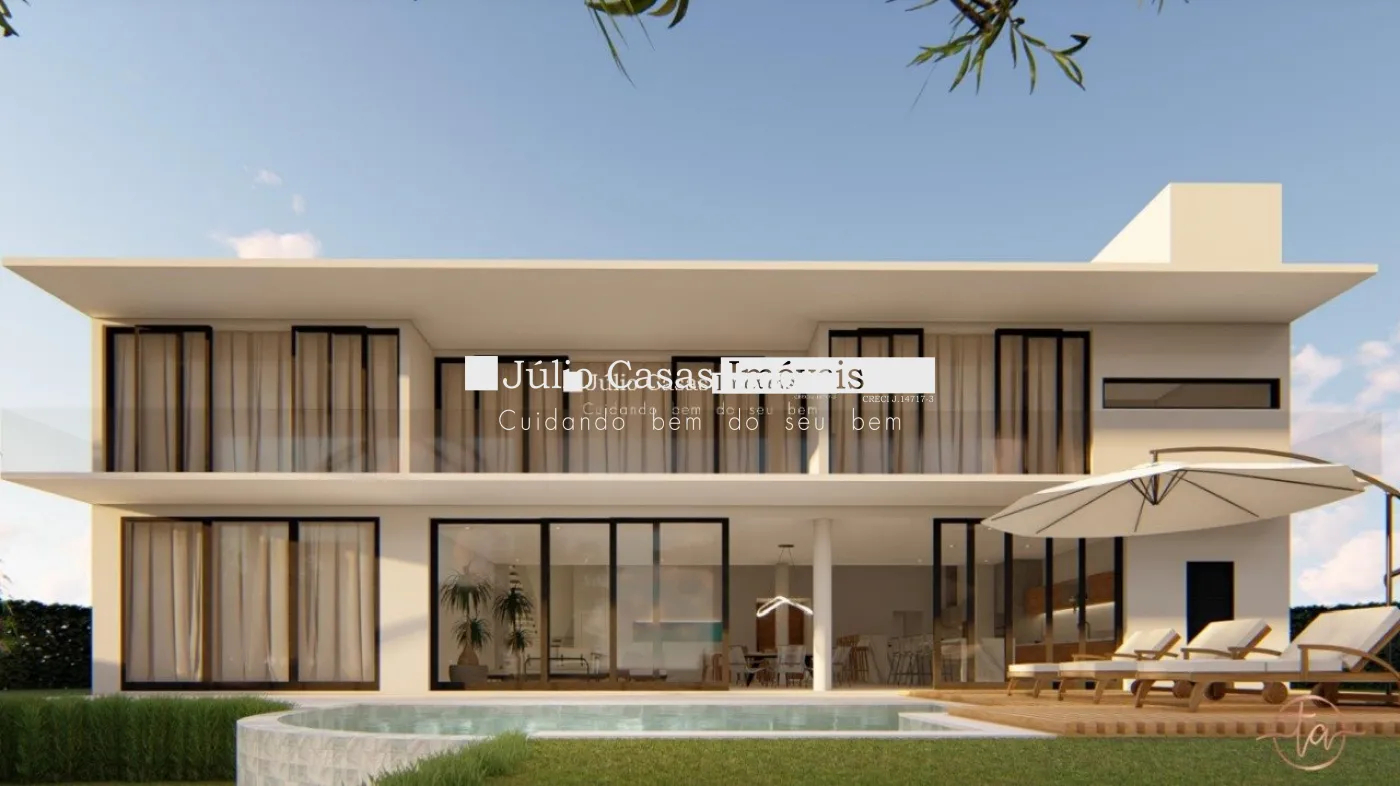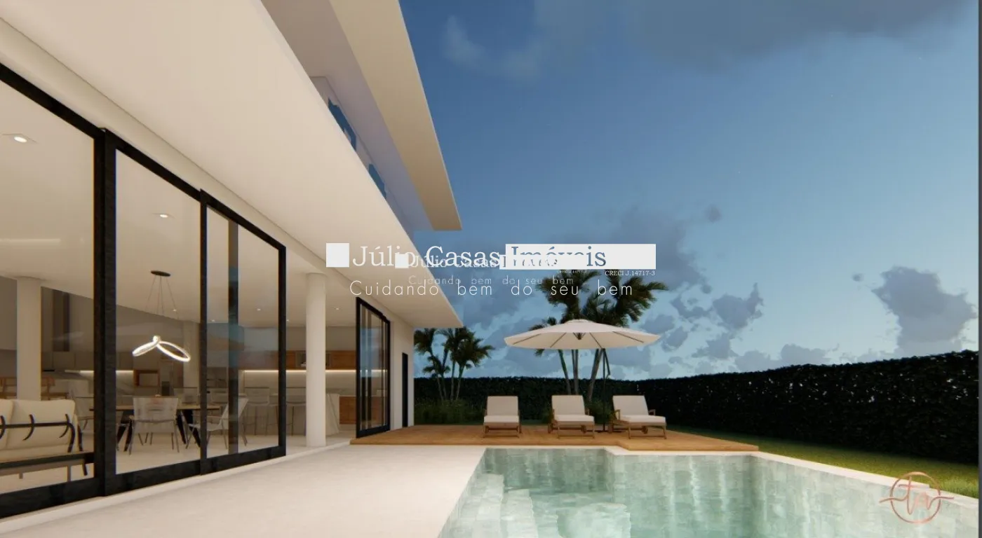 Sala de estar , sala de jantar, quatro suítes , sendo 1 no térreo, dependência de empregada completa, cozinha, lavanderia, depósito, piscina com borda infinita, Toda a casa em piso e revestimentos em porcelanato de primeira linha, casa será entregue com modulados, persianas automatizadas, iluminação e paisagismo, 2 vagas de garagem cobertas e 3 descobertas